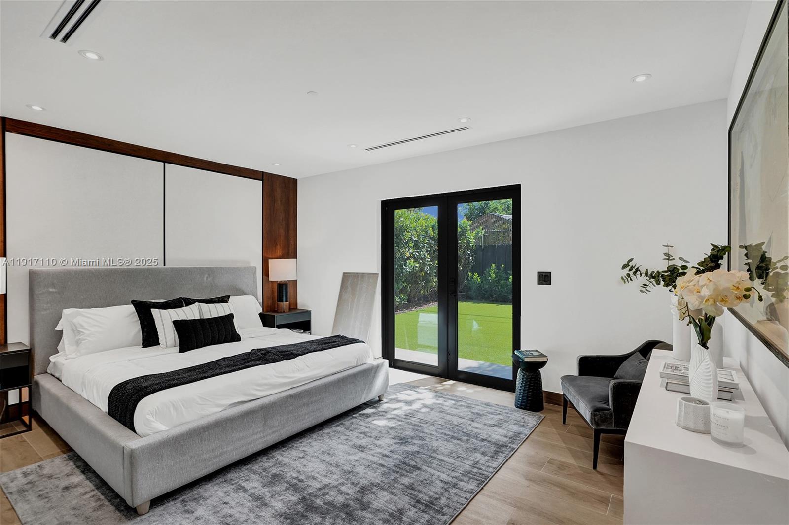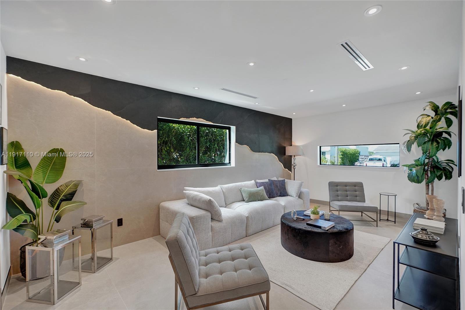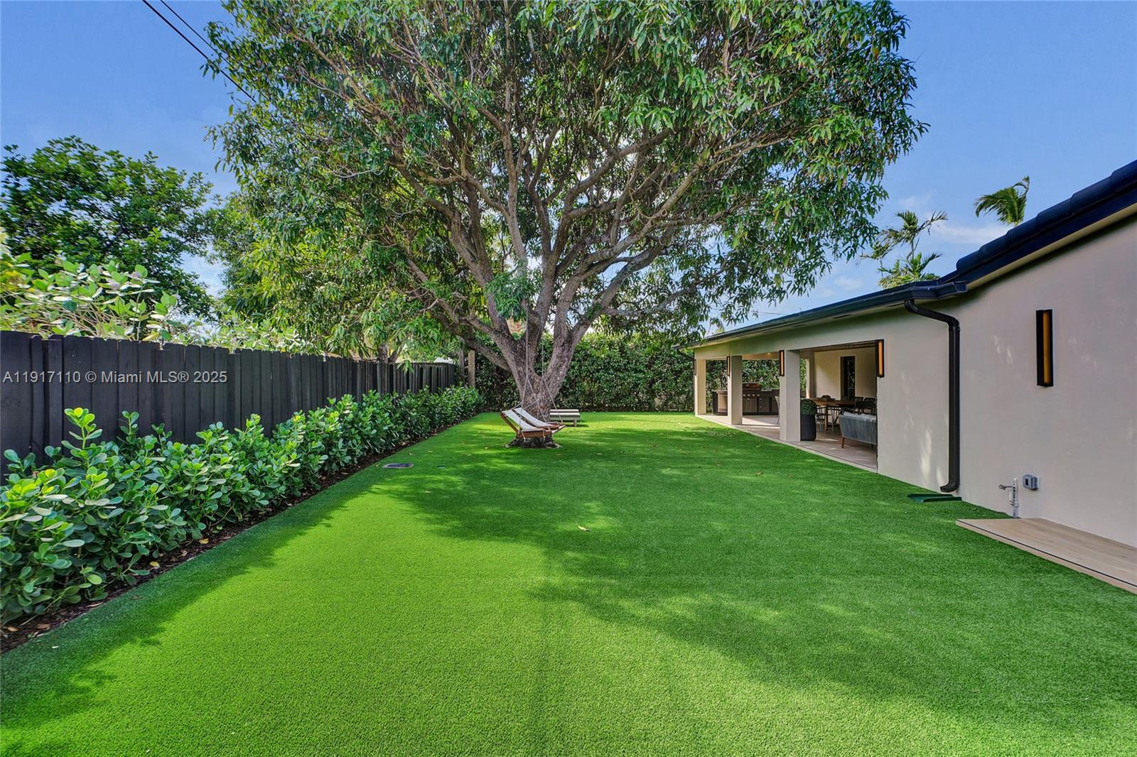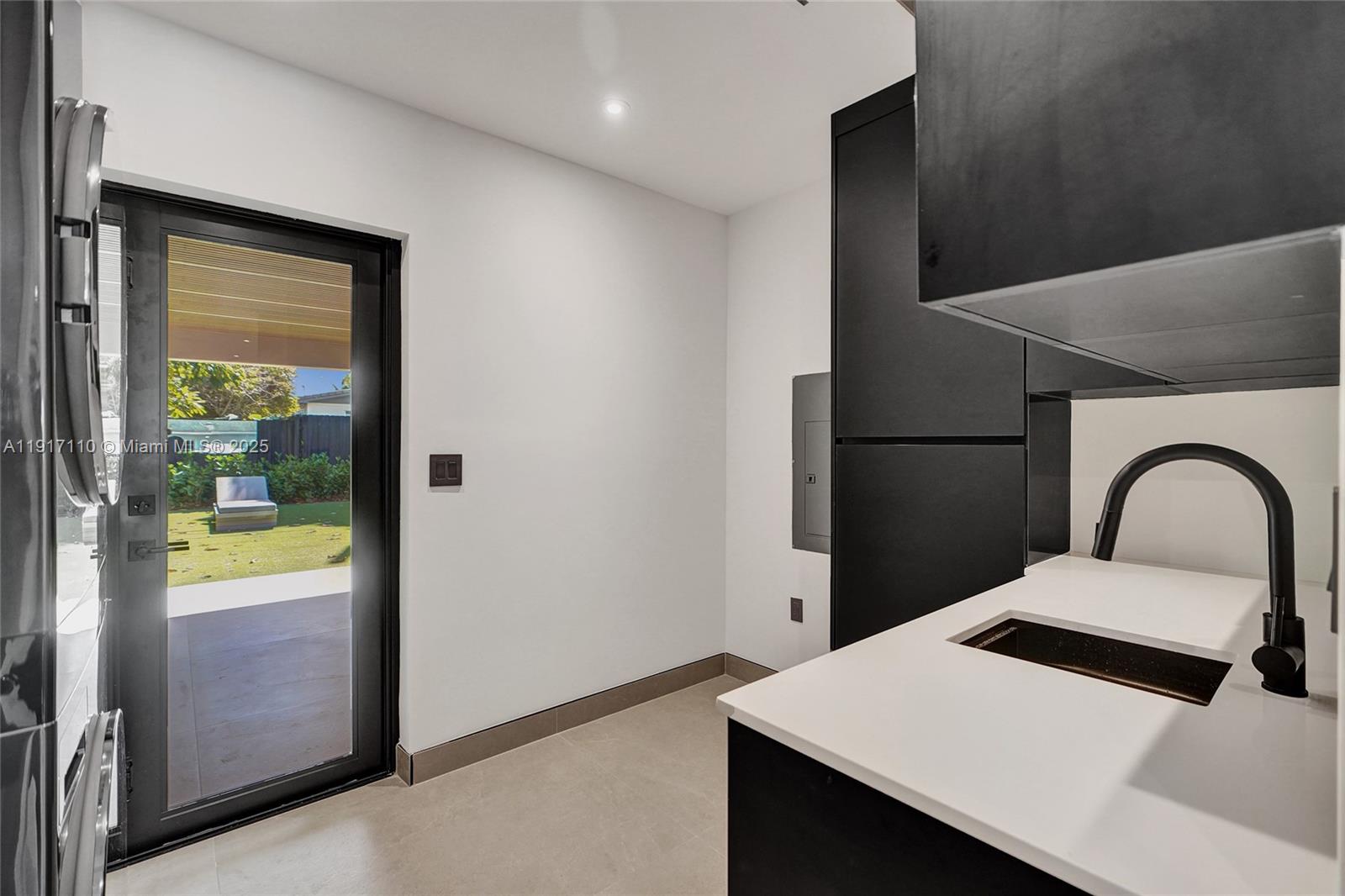 Stunning, fully remodeled modern home featuring clean architectural lines, warm natural tones, and top-quality finishes throughout. The open-concept layout highlights a sleek Italian-style kitchen with custom wood cabinetry, quartz countertops, and top-of-the-line appliances, including stainless steel appliances. This elegant residence features impact-resistant windows and doors, Italian-built-in closets, large porcelain floors, high ceilings, and designer LED lighting. The spacious living and dining areas are surrounded by glass sliders that fill the home with natural light and create a perfect indoor-outdoor flow. The outdoor space is designed for entertaining, featuring a built-in BBQ, artificial grass, and beautifully landscaped gardens. Every detail combines luxury and functionality