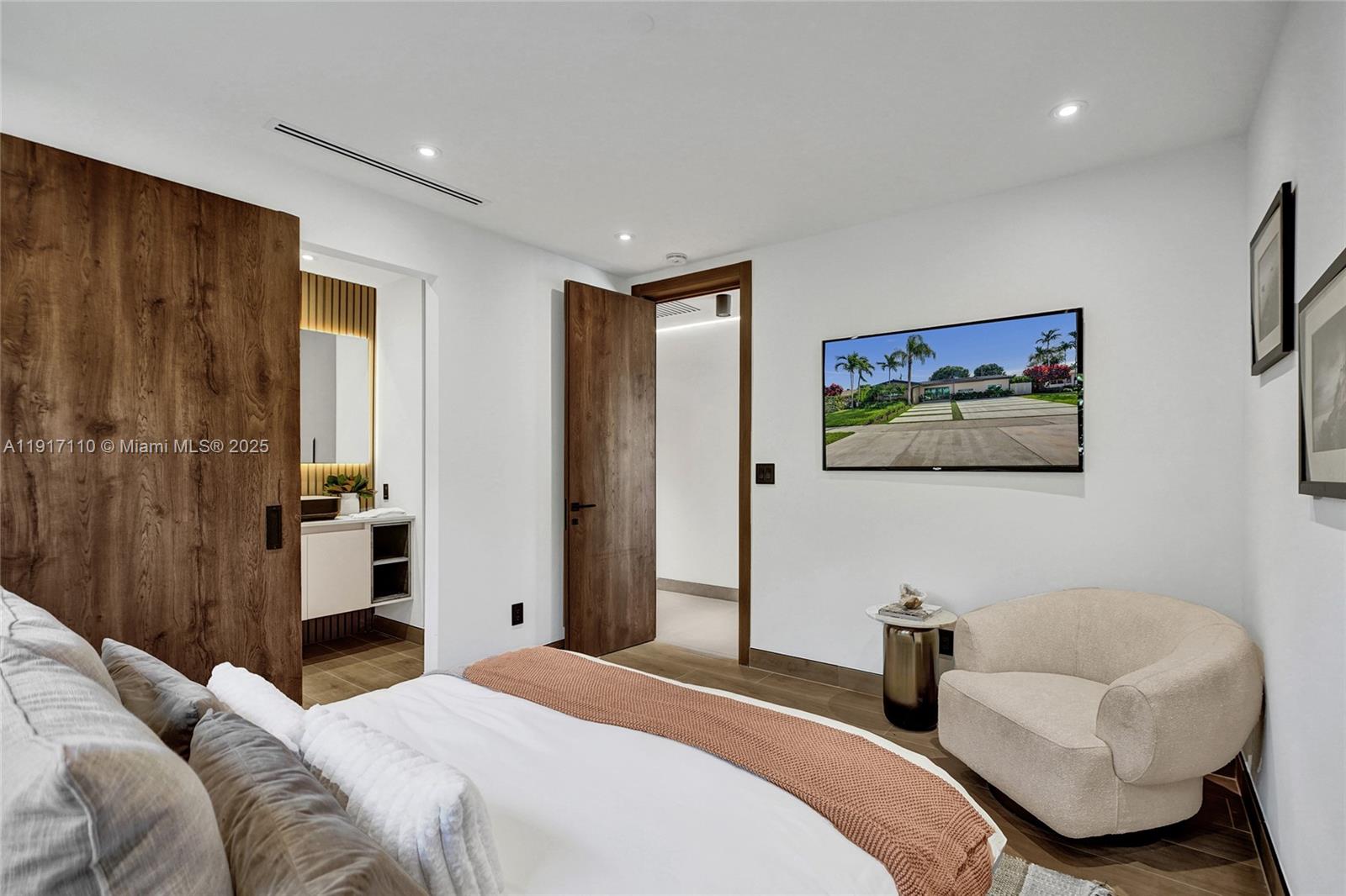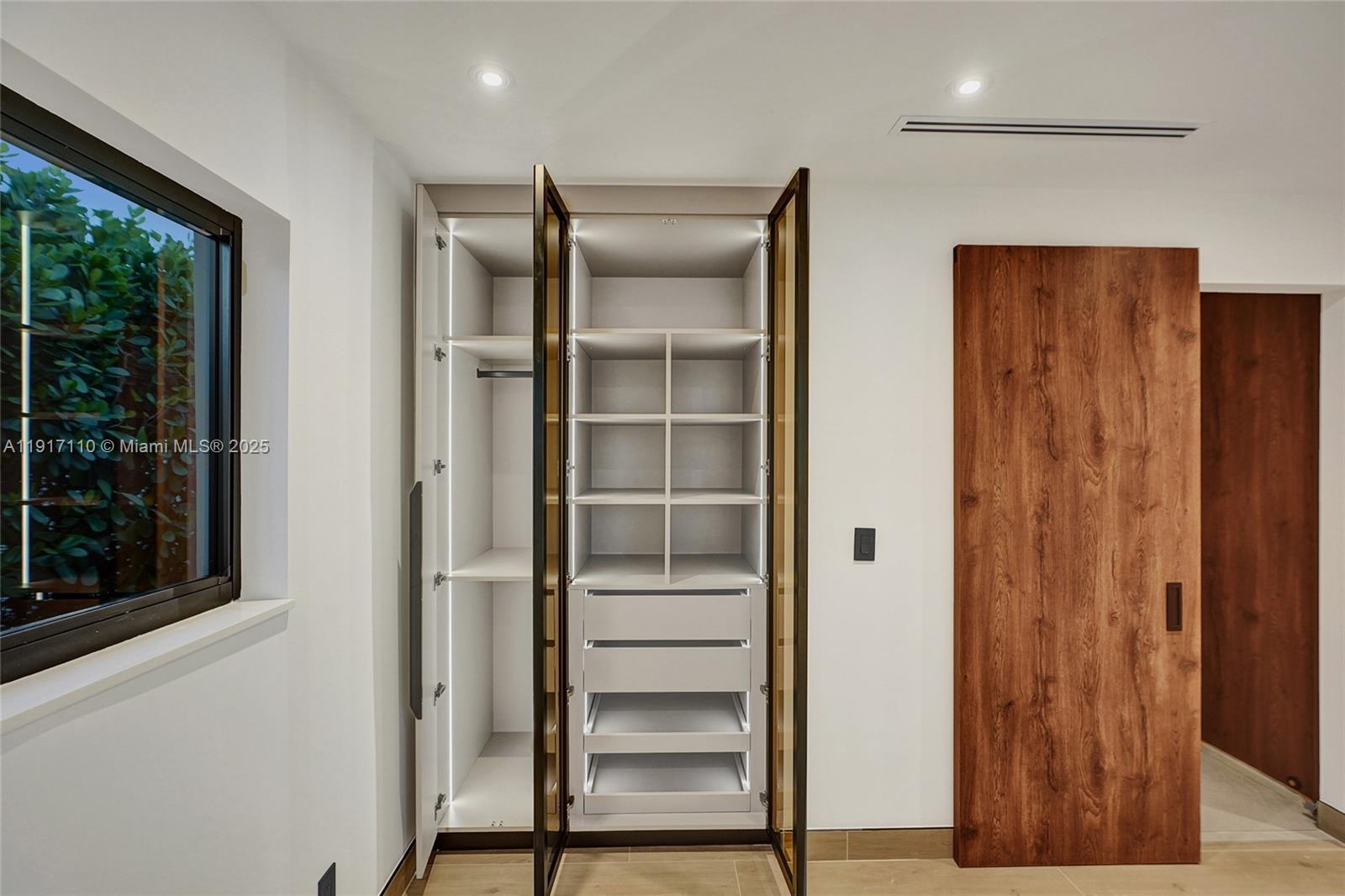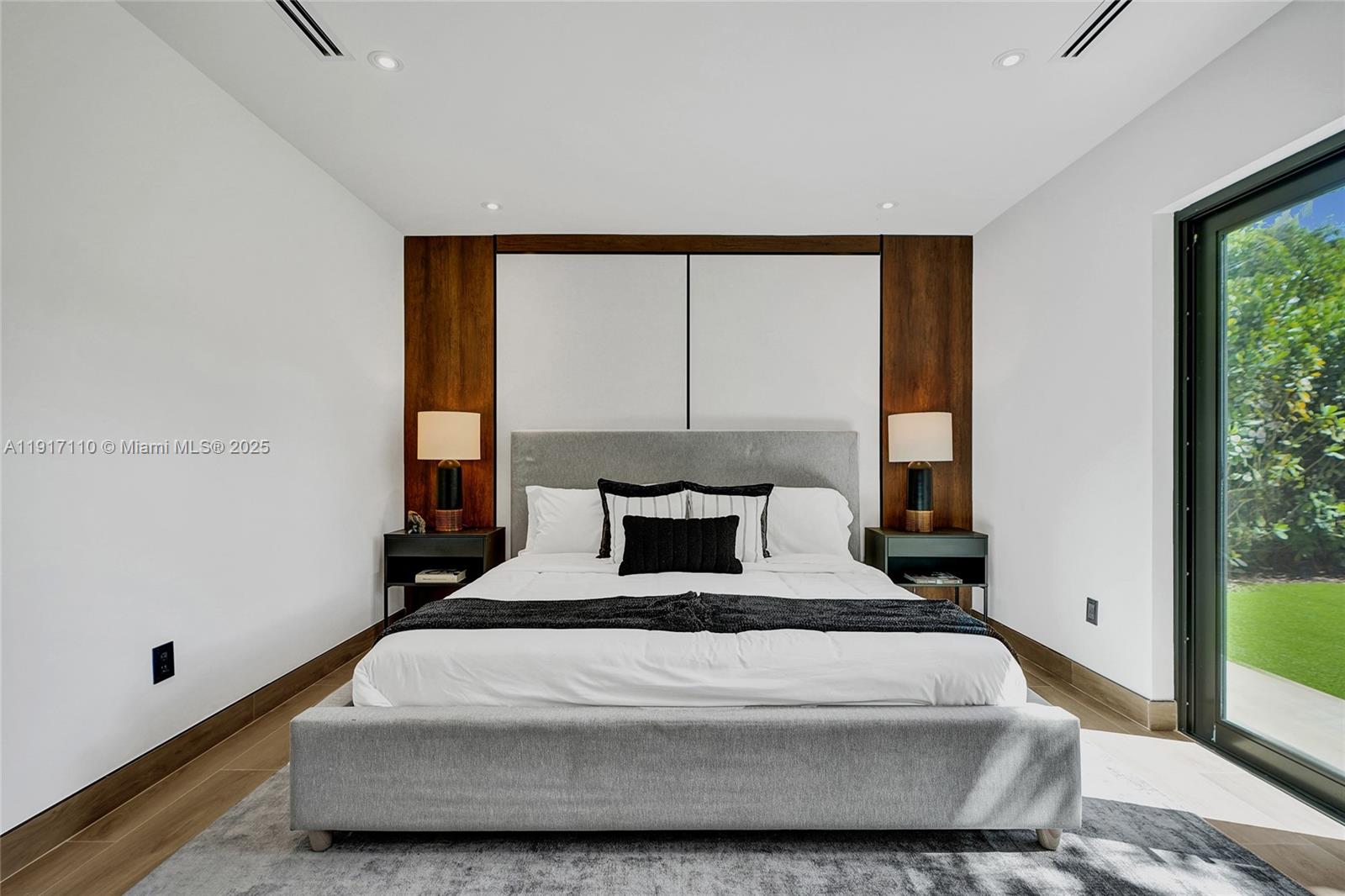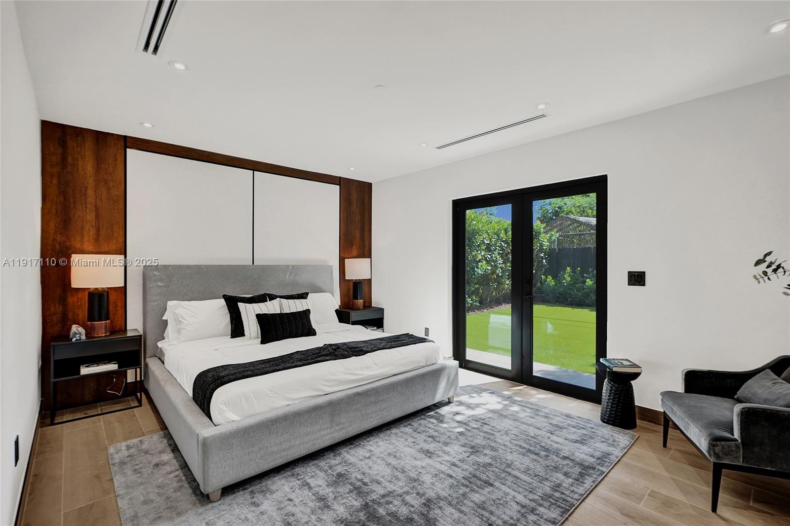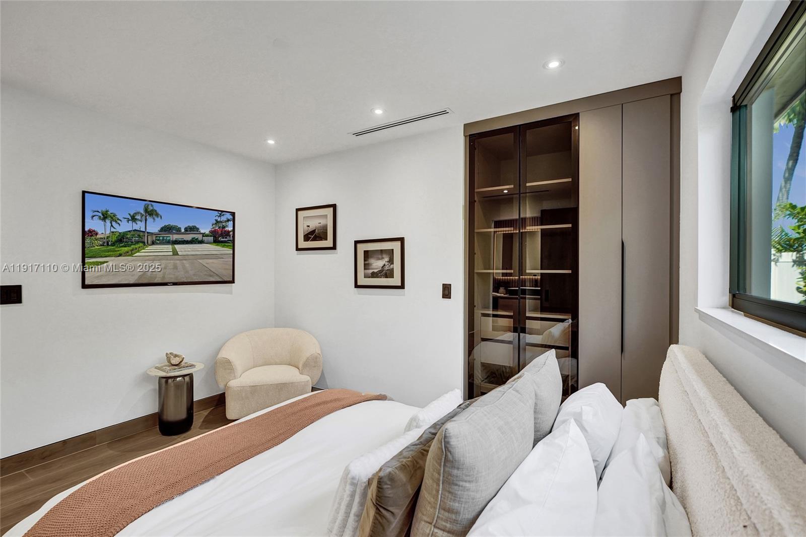 Stunning, fully remodeled modern home featuring clean architectural lines, warm natural tones, and top-quality finishes throughout. The open-concept layout highlights a sleek Italian-style kitchen with custom wood cabinetry, quartz countertops, and top-of-the-line appliances, including stainless steel appliances. This elegant residence features impact-resistant windows and doors, Italian-built-in closets, large porcelain floors, high ceilings, and designer LED lighting. The spacious living and dining areas are surrounded by glass sliders that fill the home with natural light and create a perfect indoor-outdoor flow. The outdoor space is designed for entertaining, featuring a built-in BBQ, artificial grass, and beautifully landscaped gardens. Every detail combines luxury and functionality