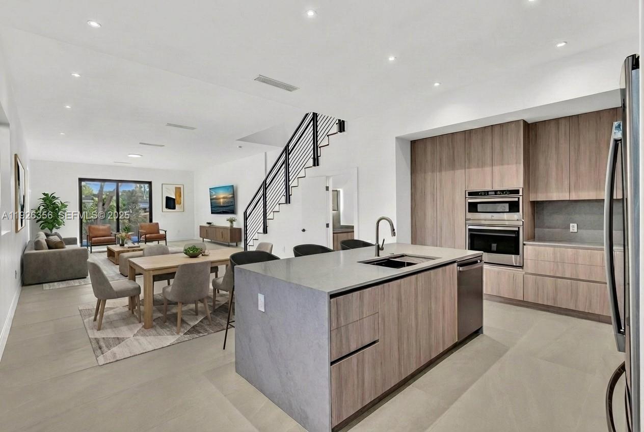 Modern new construction townhome offering luxury design. This 4 bedroom, 4.5 bath home features a bright open floor plan with porcelain tile floors, recessed lighting, and a sleek kitchen with custom cabinetry, quartz countertops, stainless appliances and large island. Sliding doors lead to a private patio and plunge pool. Spacious primary suite includes walk-in closets and spa style bath with soaking tub and glass shower. Impact windows, modern finishes, garage, and indoor laundry complete this contemporary Miami retreat.