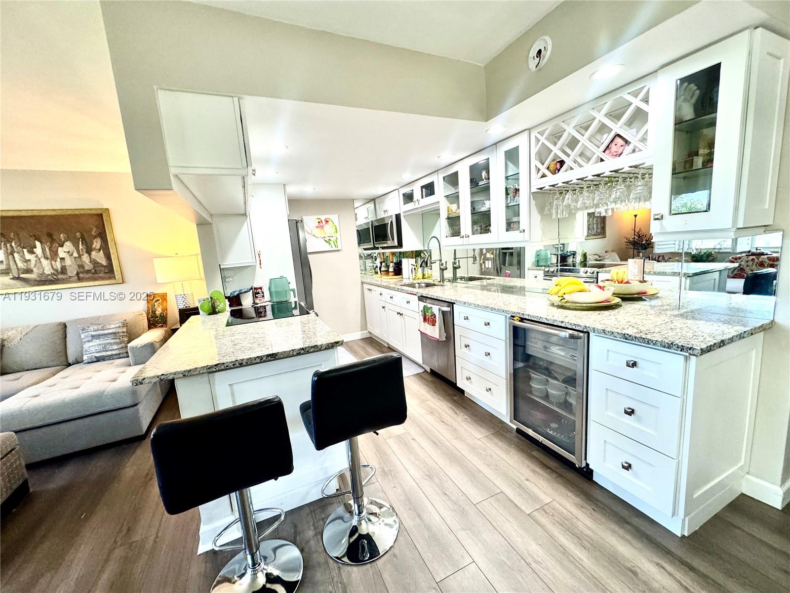 Fully remodeled 1 bedroom, 1.5 Bath residence located in Wynmoor, a 55+ community. Renovated from top to bottom!! Features include impact windows and doors, smooth ceilings (no popcorn), waterproof laminate flooring throughout, plantation shutters, electric shades in the primary bedroom, contemporary frosted-glass interior doors, soft-close drawers, and custom closet organizers. The updated kitchen offers white shaker cabinets, gray granite countertops, stainless steel appliances, LED lighting, and a built-in beverage/wine refrigerator with wine and water rack. The primary bathroom has been fully remodeled with high-end finishes and Kohler fixtures. Additional upgrades include a new 2-ton A/C, new hot water heater, and new electrical panel. 55+ community. No BBQ allowed on patios. THAT'S A MUST SEE!!!