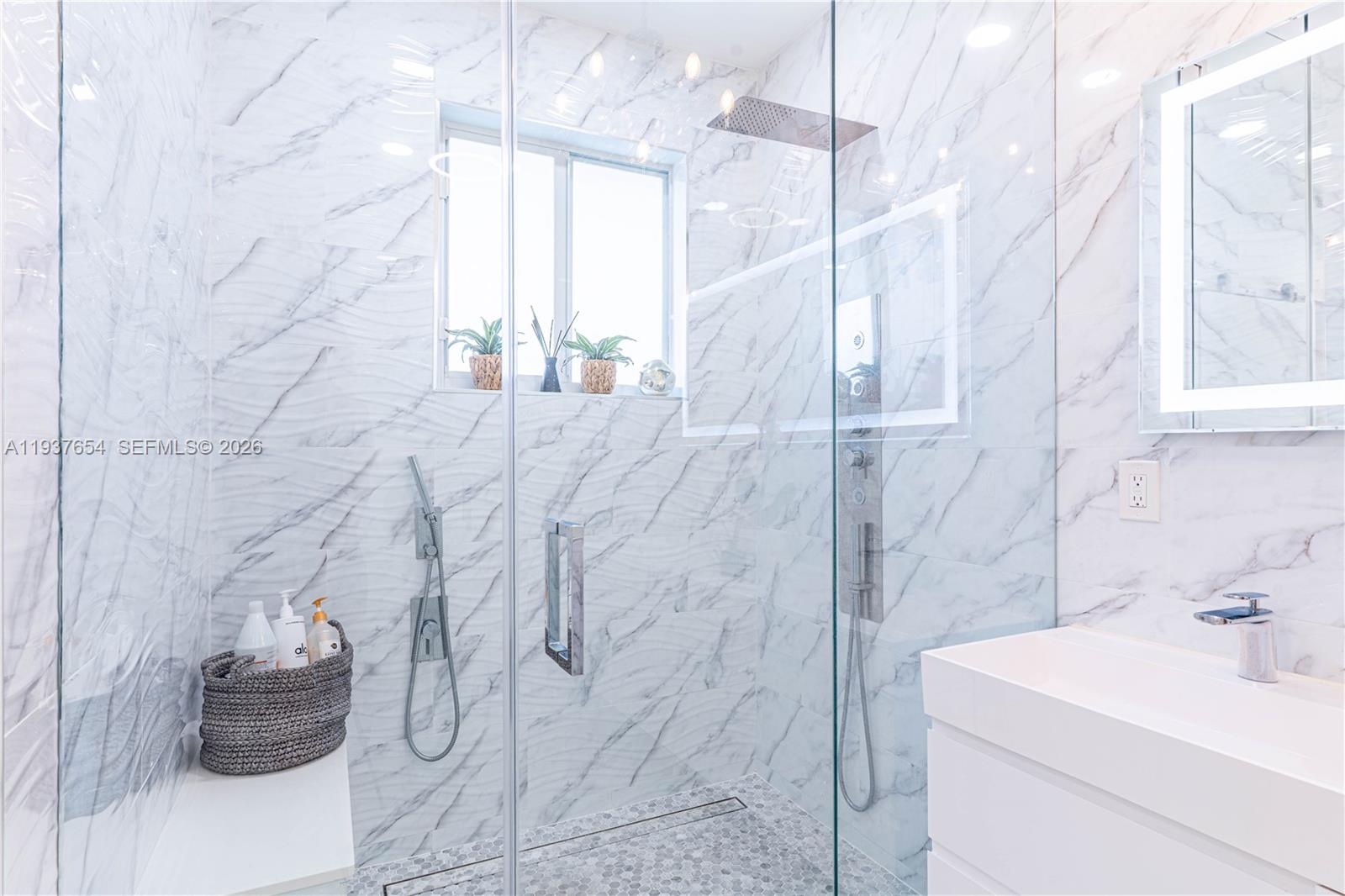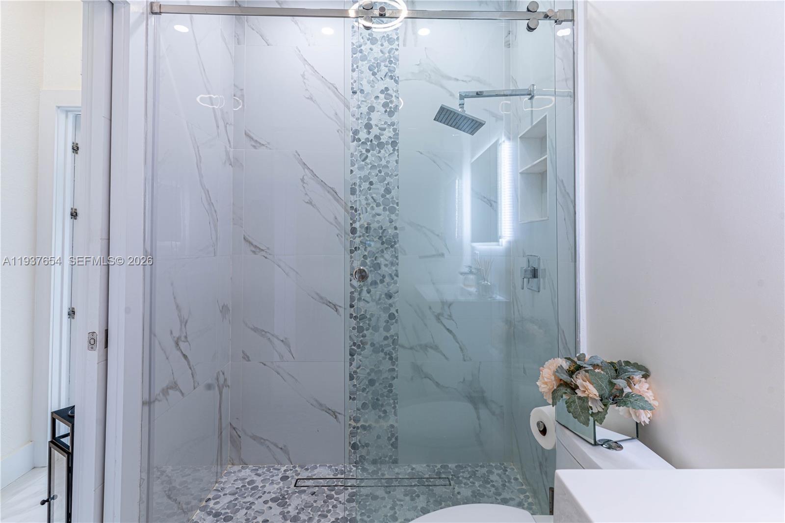Elegantly renovated 3-bedroom, 3-bathroom home featuring an open concept design and impact windows and doors throughout. The spacious living area offers tray ceilings, porcelain flooring, and french doors that open to a private patio with a covered seating area. The gourmet kitchen showcases waterfall quartz countertops, modern cabinetry, stainless steel appliances, and a large island, perfect for entertaining. Outdoors, enjoy a fully equipped summer kitchen and ample space to build a pool. Additional highlights include a new 5-ton central A/C, custom electric blinds, built-out closets, and much more. Move-in ready, this home blends modern elegance with comfort and seamless indoor-outdoor living in a highly desirable location. (Chandeliers are not included in the sale.)