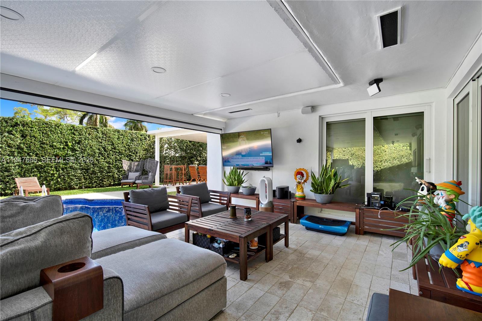 Stunning fully renovated 3-bedroom, 2-bath residence in the desirable Highland Gardens neighborhood, offering extensive upgrades and high-end finishes throughout. This exceptional home features porcelain flooring, a fully integrated smart electrical and lighting system, brand-new smart-enabled appliances, and a new energy-efficient smart A/C system for minimal energy consumption and exceptionally low electric bills. The bright open-concept layout showcases modern luxury finishes, hurricane-impact windows, and custom-designed built-in libraries. All bedrooms are thoughtfully designed, including a spacious fully remodeled primary suite with designer closets and an expansive updated bathroom. The upgraded gourmet kitchen is equipped with smart appliances and a professional gas range. A wall of windows overlooks the private backyard oasis. Outdoor upgrades include fully remodeled exterior flooring, an elegant terrace, a renovated pool, smart automatic terrace enclosures, intelligent blinds, a fully landscaped garden, a renovated privacy fence, and a fully automated smart irrigation system. Ideally located near major highways, shopping, dining, and excellent schools. Move-in ready, with countless upgrades, and truly one of a kind.