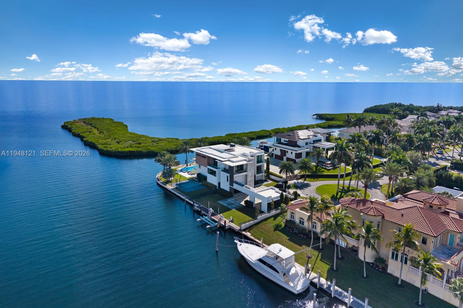 Spectacular bayfront modern family home on a rare corner-point lot with 300 feet of prime waterfront in an unbeatable location. This chic family home is perfect for entertaining, featuring a resort-style pool and spa, a built-in BBQ, fire pit lounge, outdoor kitchen, expansive waterfront terraces, and a basketball or volleyball court by the water, creating a one-of-a-kind backdrop for both relaxation and play. The property features two private docks, one accommodating over 100' boat, another with a 30,000 lb boat lift, and effortless access to Biscayne Bay and the open ocean. Inside, the home offers a gourmet kitchen with a huge island and a large waterfront-facing area for casual meals. The butler's pantry, formal dining room, and temperature-controlled custom wine wall are perfect for entertaining. There are seven bedrooms and 8.5 baths, filled with natural light and clean contemporary design. Five bedrooms are upstairs, each with a private bath, walk-in closet, and covered terrace overlooking the water. The primary bedroom and bath have fantastic views of the bay, and the bathroom features a spa sanctuary vibe, with a free-standing tub and a sauna. An elevator connects all levels for everyday ease. This is a true boater’s dream in a sought-after neighborhood close to Gulliver Prep, built in 2018 by renowned Calil Architects. Private, dramatic, and impossible to replicate—this is luxury waterfront living at its best. Gated community, and home in an unbeatable location.