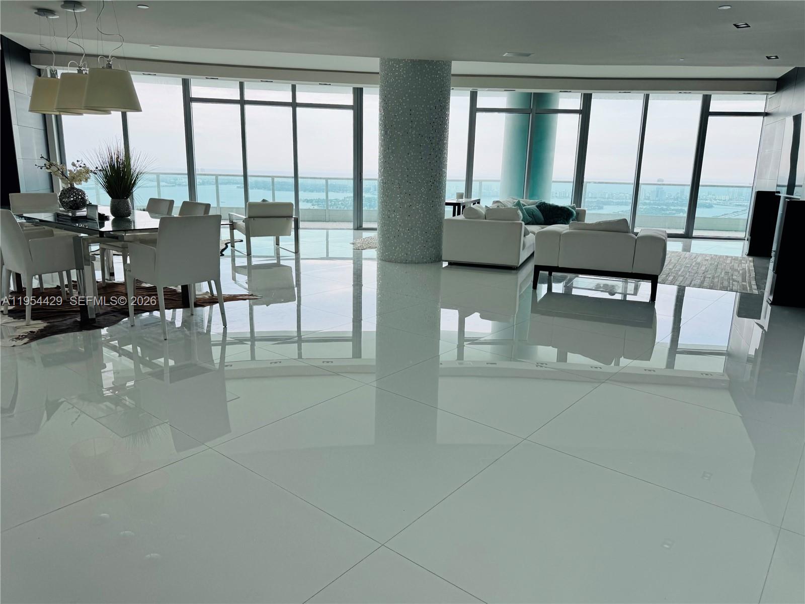 Exquisite penthouse residence offering refined contemporary finishes and exceptional craftsmanship. This 3 Bed + Den / 4.5 Bath home features breathtaking 180° panoramic views of Biscayne Bay, Miami Beach, passing cruise ships, and the Downtown Miami skyline. White glass flooring throughout, a spa-inspired custom primary bath with rainfall shower and Bisazza tile, and a fully integrated smart-home entertainment system with wired speakers.
