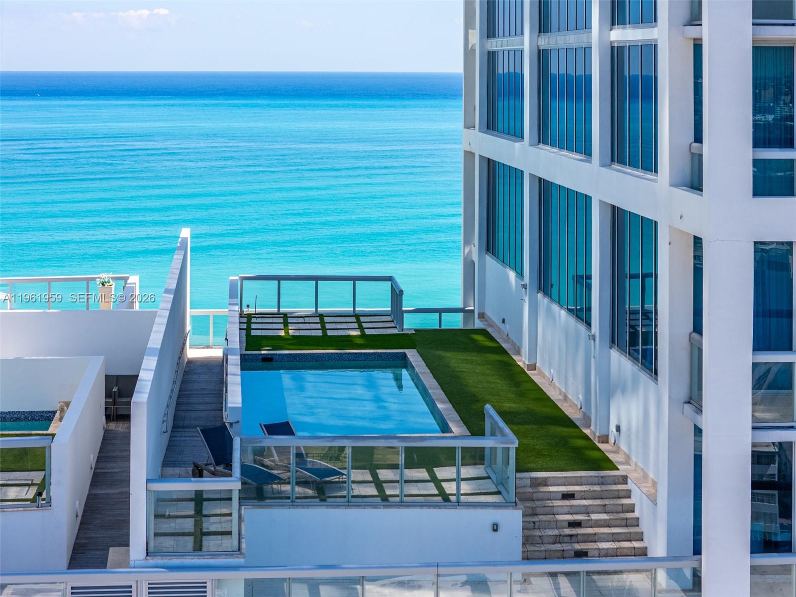 Experience the ultimate oceanfront luxury at the Carillon Wellness Resort. This exclusive 3-bed, 3.5-bath combined unit delivers *your own* 3,000 SF private rooftop terrace, complete with a 14’x30’ heated pool. From sunrise yoga overlooking the ocean to drinks at sunset this private terrace becomes your personal resort retreat. Indoors, discover two primary suites with serene water views, a dedicated home office, media room, guest room, & custom built-ins that elevate the space. The combined 6,000 SF of indoor-outdoor space provides effortless entertainment flow with floor-to-ceiling views from the Miami skyline to the Atlantic Ocean horizon. Living at the Carillon grants you access to the 70,000 SF spa and gym, beach club, four pools, oceanfront restaurant, 24hr concierge, and much more. *Image 1 is a Rendering of Private Rooftop Terrace*