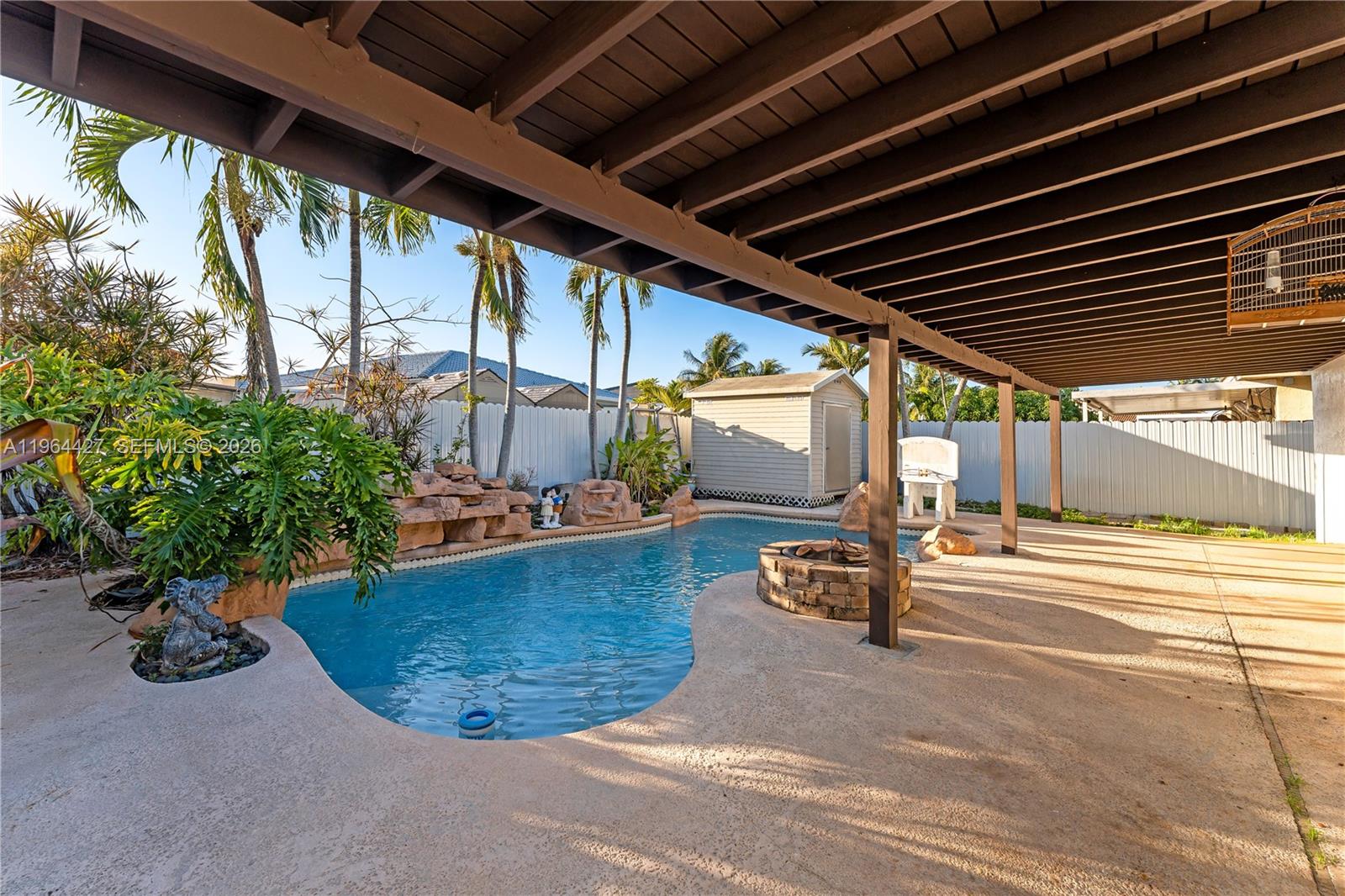 Beautifully updated 3-bedroom, 2-bath home, offering a perfect blend of comfort and style. The living areas feature tile flooring, two bedrooms have elegant bamboo hardwood floors, and additional spaces include new wood-look tile. The modern kitchen boasts granite countertops and brand-new appliances. Hurricane shutters are installed on every window, and the back cabana door includes built-in blinds. Enjoy outdoor living with a stunning custom pool featuring rock accents and two waterfalls, a spacious backyard with a storage shed, and mature landscaping. The primary bedroom offers private direct access to the exterior, ideal for indoor-outdoor living. No HOA. A must-see property ready for its new owner.