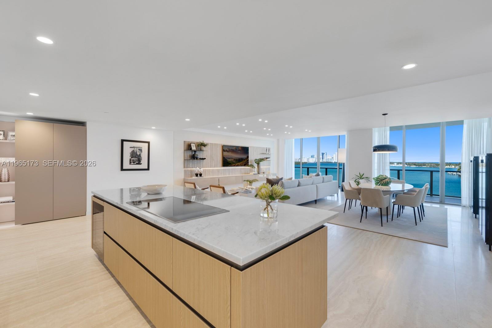 Step Inside With Me! One of only four premier penthouses at Onda, Bay Harbor Islands’ newest luxury boutique residential experience. Surrounded by aqua waters, this never-lived-in bayfront stunner has travertine flooring throughout and is offered furnished. Beyond the private foyer, the grand hosting salon reveals itself through walls of glass where a floating, backlit media wall with custom shelving and lacquered cabinetry defines the space. The Snaidero kitchen showcases an expansive eat-in island with marble counters and premium Miele appliances, extending into a sunlit dining room with water views. The primary suite displays an integrated entertainment wall, spa-inspired marble bath with dual vanities, and two generously proportioned closets. Penthouse 3 features three additional appointed guest suites, each with custom drapery and private access to one of the two expansive terraces. Standout features include a private office and sleek media den thoughtfully designed for comfort and entertainment. Designed by award-winning Arquitectonica and landscaped by Enzo Enea, Onda offers outstanding amenities: a grand pool, Technogym fitness center, wellness spa, EV charging station — plus 2 parking spaces, storage, and 24-hour valet. All moments from Bal Harbour Shops, Four Seasons Surf Club, and the beach. To be sold with 60' boat slip for an additional $500,000.