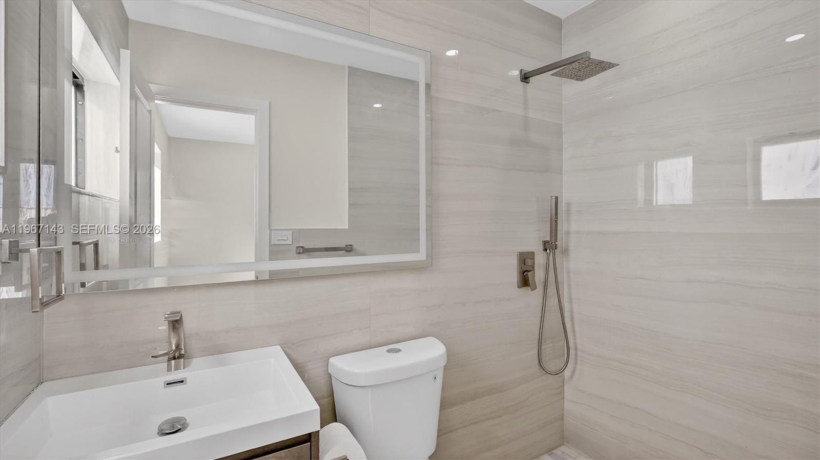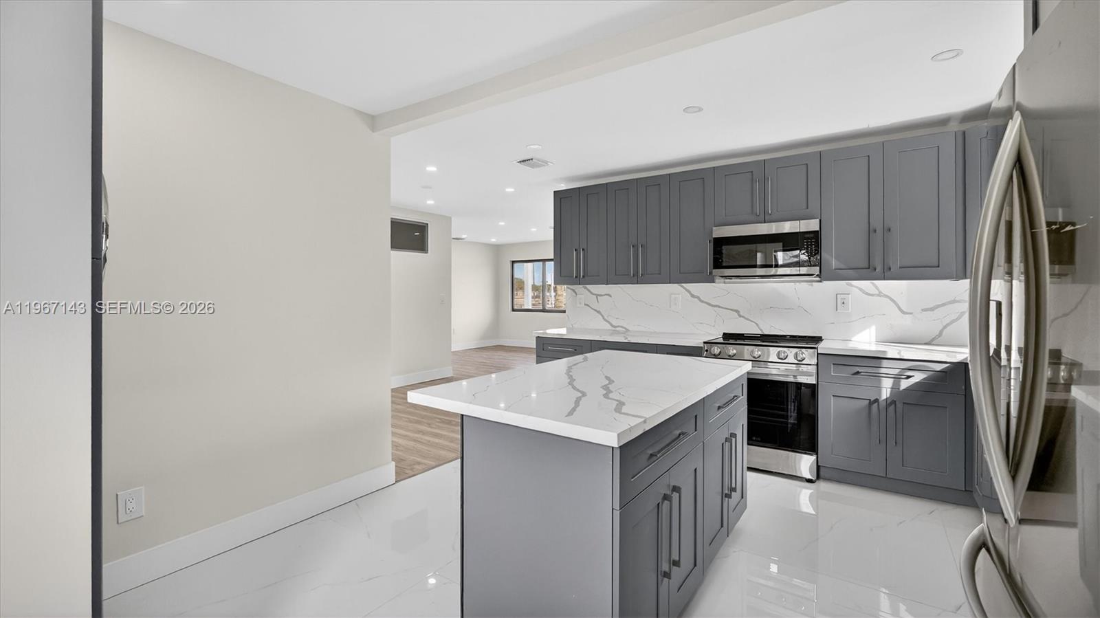 Welcome to 3740 NW 188th St, Miami—an updated, light-filled home with clean modern finishes and a layout made for everyday living and entertaining. Step inside to an airy open concept highlighted by smooth ceilings, recessed lighting, fresh neutral paint, and wide-plank wood-look flooring that flows through the main living areas. Black-framed windows and sliding glass doors bring in great natural light and connect you to the backyard. The showstopper kitchen features sleek gray shaker cabinetry, stainless steel appliances, a large pantry wall, and striking quartz countertops with a matching full-height backsplash. The oversized waterfall island with modern fluted detailing anchors the space—perfect for prep, casual meals, or hosting. A convenient built-in laundry area keeps everything streamlined. Both baths are designed with a spa vibe: large-format tile, contemporary vanities, stylish mirrors/lighting, and a walk-in wet-room style shower with rainfall head plus handheld sprayer. Outside, enjoy an expansive concrete patio/parking area and a detached storage building—ideal for tools, bikes, or a home workshop. Conveniently located in Northwest Miami-Dade near shopping, dining, and major commuter routes. Move-in ready and easy to love—schedule your showing