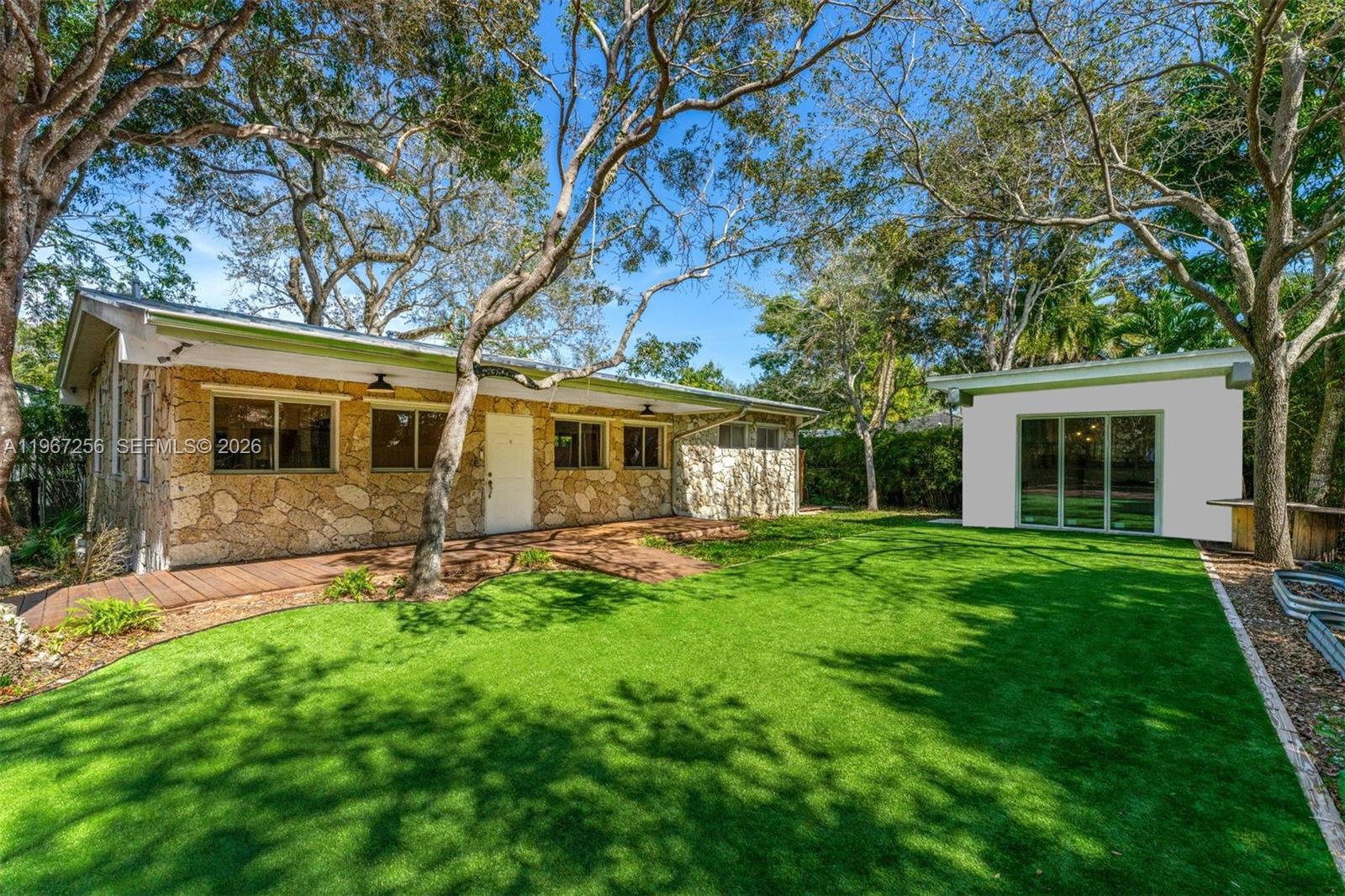 Ideally situated in the heart of South Miami on a quiet tree-lined street in an idyllic neighborhood, this fully remodeled 3 bedroom, 3 bath residence features a bright, open-concept layout enhanced by a new metal roof, elegant new flooring and a sleek kitchen with quartz countertops and new stainless-steel appliances. The spacious interior offers an expansive living room with a dining area, along with a generously sized primary suite complete with a large vanity and walk-in closet. Thoughtfully redesigned front and backyard spaces create inviting settings for relaxing and entertaining, highlighted by a covered deck and generous green space ideal for outdoor living and play areas. A detached garage outfitted with new glass doors adds exceptional versatility to be outfitted as a guest suite, in-law quarters, private home office, or creative studio. This large 9300 sf lot in the prime location of the City of South Miami places you just minutes from the University of Miami, South Miami Baptist Hospital, top-rated schools, parks, premier shopping and dining, and major expressways for convenient commuting.