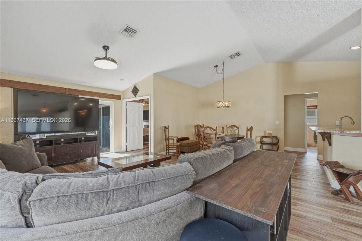 This upgraded Davie home features wood cabinetry, stainless steel appliances, a wine cooler, granite countertops, upgraded wood flooring throughout, and new baseboards. All windows are impact-rated and finished with wood blinds. The front bathroom offers frameless shower doors, granite countertops, and a cherry wood vanity. The primary suite includes walk-in closets, granite countertops, a cherry wood vanity, and tile flooring in the bath. Additional updates include a new hot water heater, recessed lighting, and ceiling fans in every room. Enjoy a private backyard with a wooden deck, paver patio, extra storage shed, and full gutter system surrounding the home. Move-in ready with quality upgrades inside and out.
