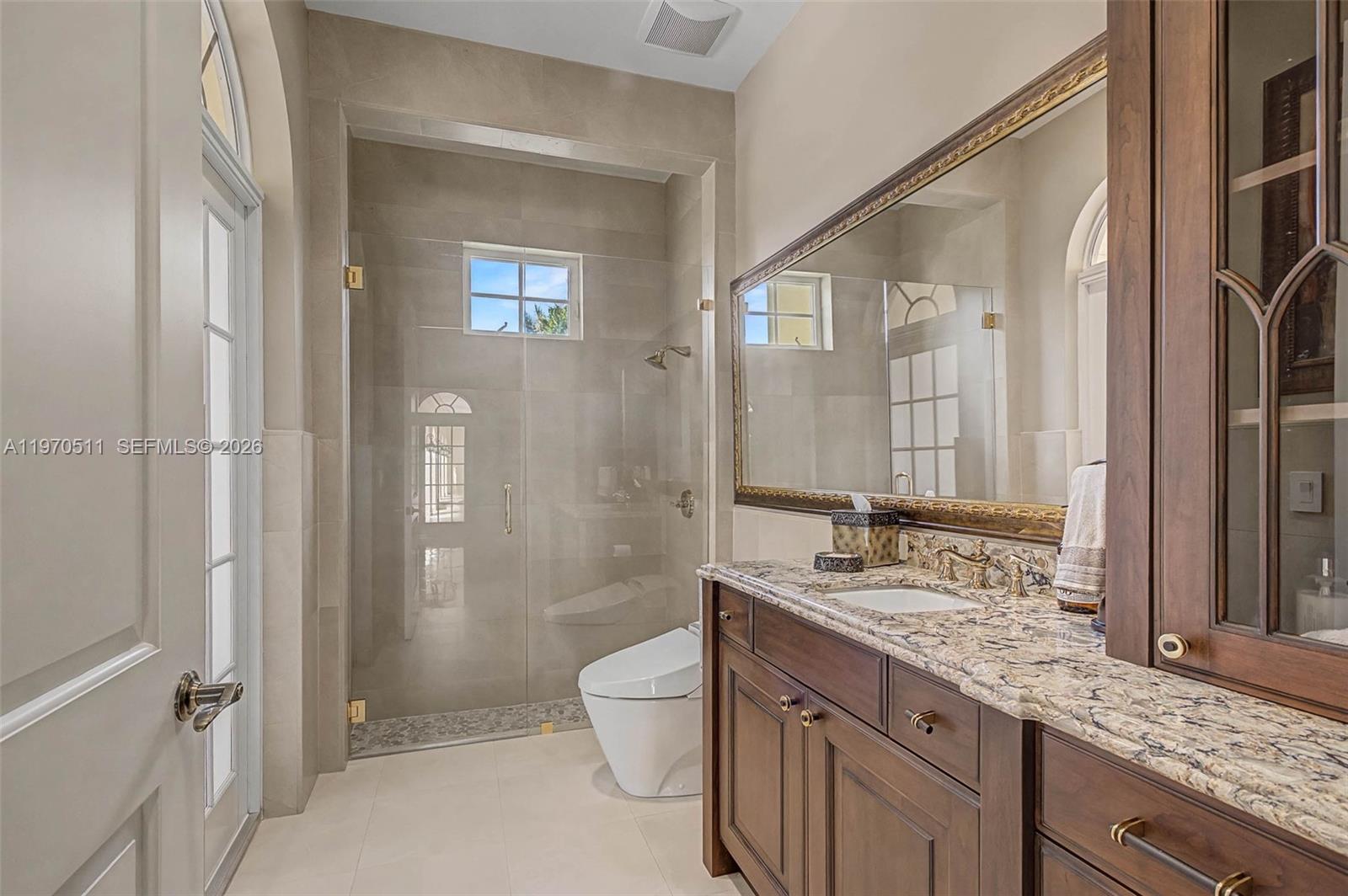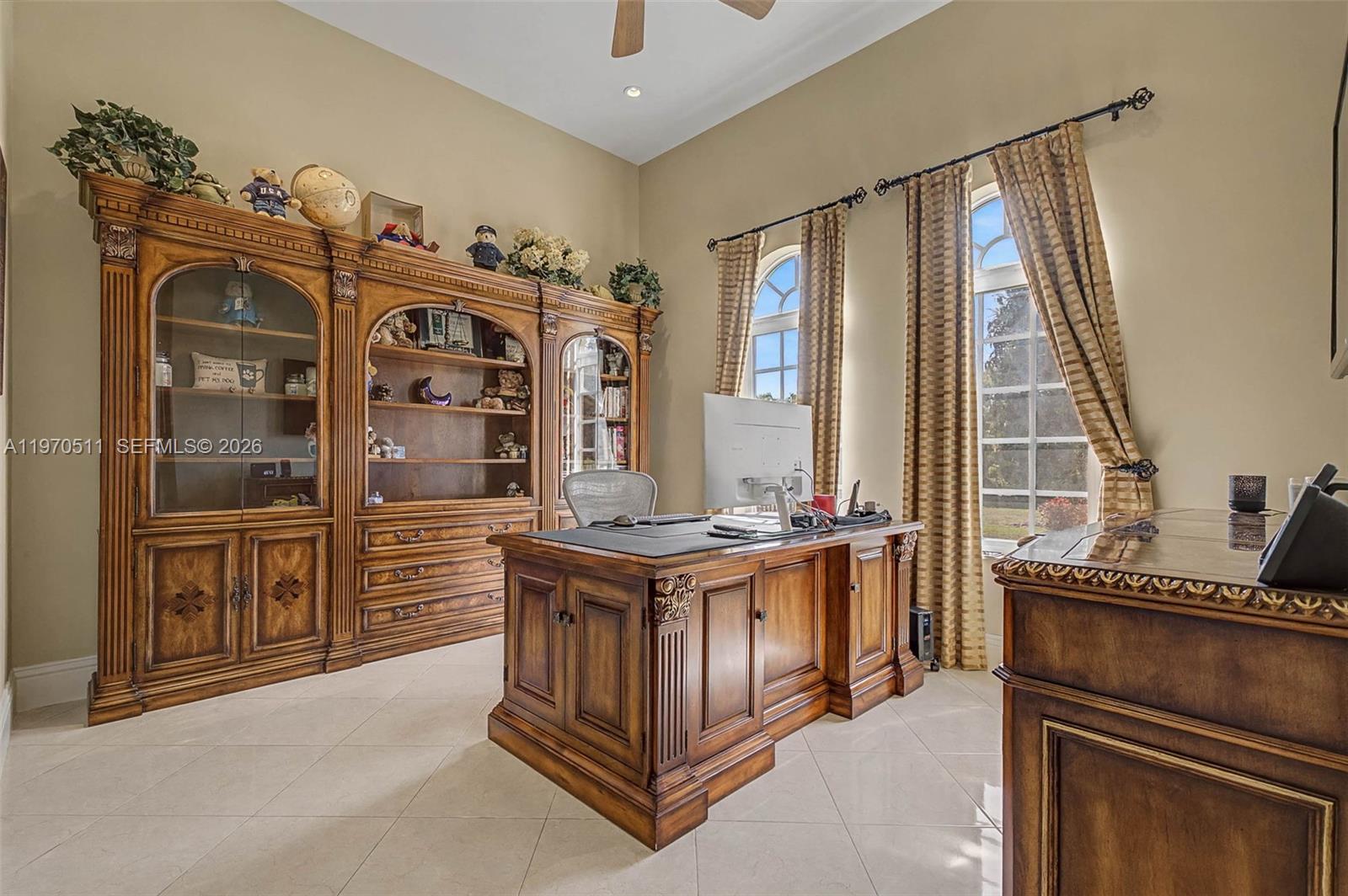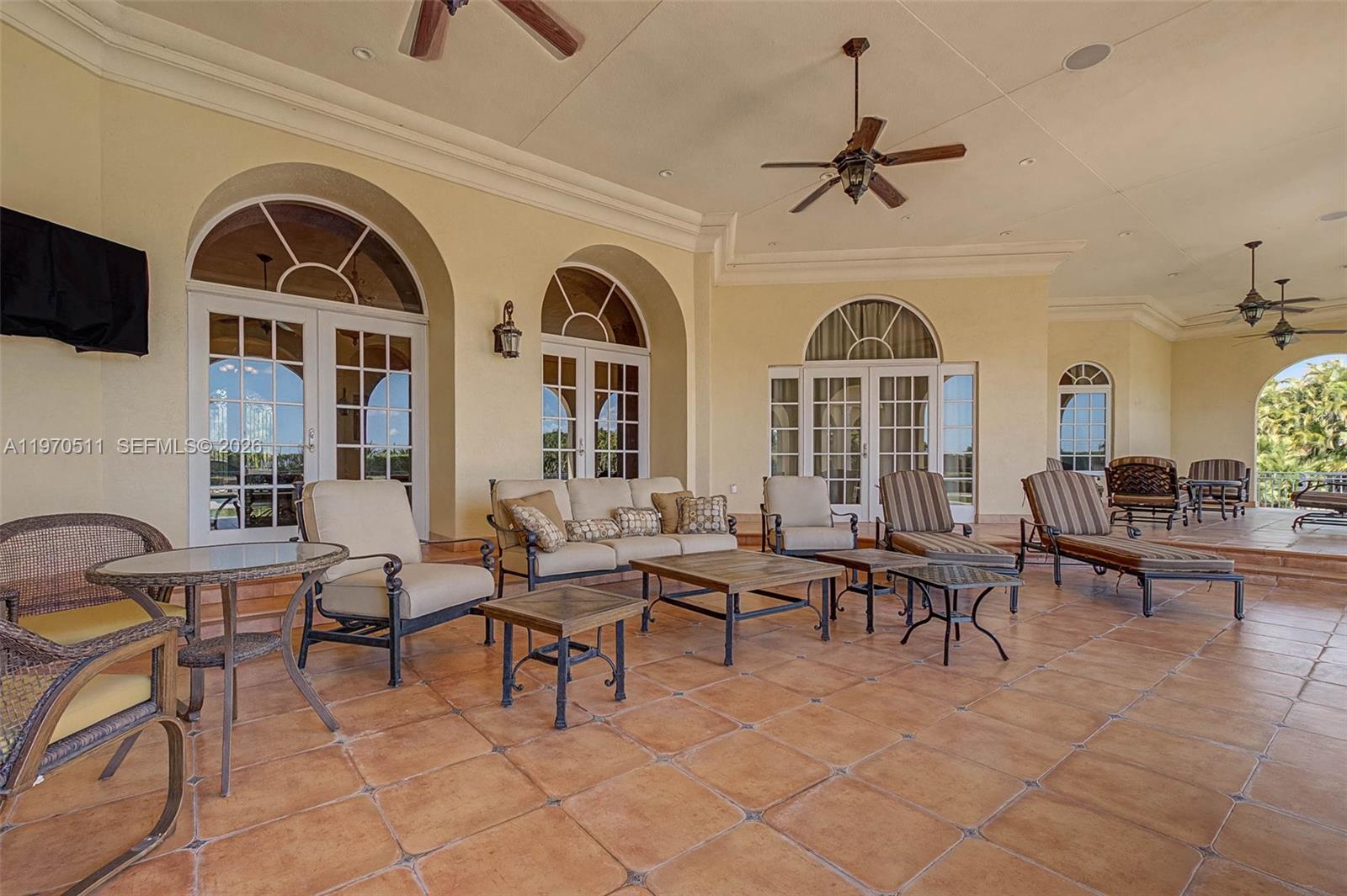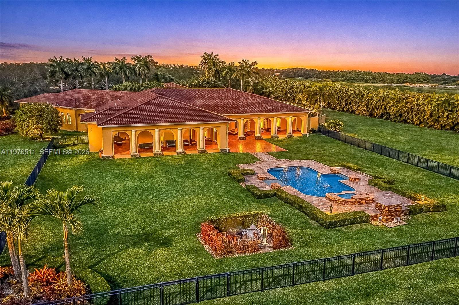 Private double gated estate home set on over 4.8 acres, this exceptional property offers 9,943sqft of living space with a well-designed triple split floor plan. The main residence features 6 bedrooms plus an office including a master and jr. suite, 7.5 baths, chef's kitchen with double subzero refrigerators, double subzero freezers, subzero drink drawers, double miele ovens, built in miele coffee maker, subzero wine refrigerator and expansive island and counter seating. Windows and doors all PGT impact glass. Metal roof on main house and rear structure. Lutron low voltage lighting, Control4 sound system and Cat6 wiring throughout the home. Full home Kohler 45kw generator. Designed for both entertaining and everyday comfort, the home includes a private theater, built-in bar, covered patio with summer kitchen, and a resort-style pool and spa. The expansive primary suite offers dual custom walk-in closets, large shower, and jetted tub. Jr suite boasts dual walk-in custom closets, double vanity bathroom, a shower/tub combo and a separate shower. A true highlight is the oversized four car dream garage with double-height ceilings, plus a detached mini-split AC temperature-controlled building currently used as additional garage space and a custom gym, with a powder room. A rare opportunity combining privacy, scale, and luxury built to the highest standards.
