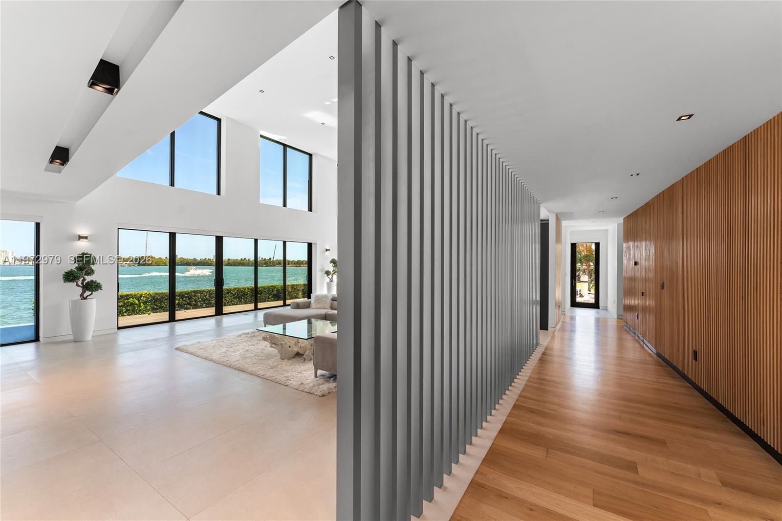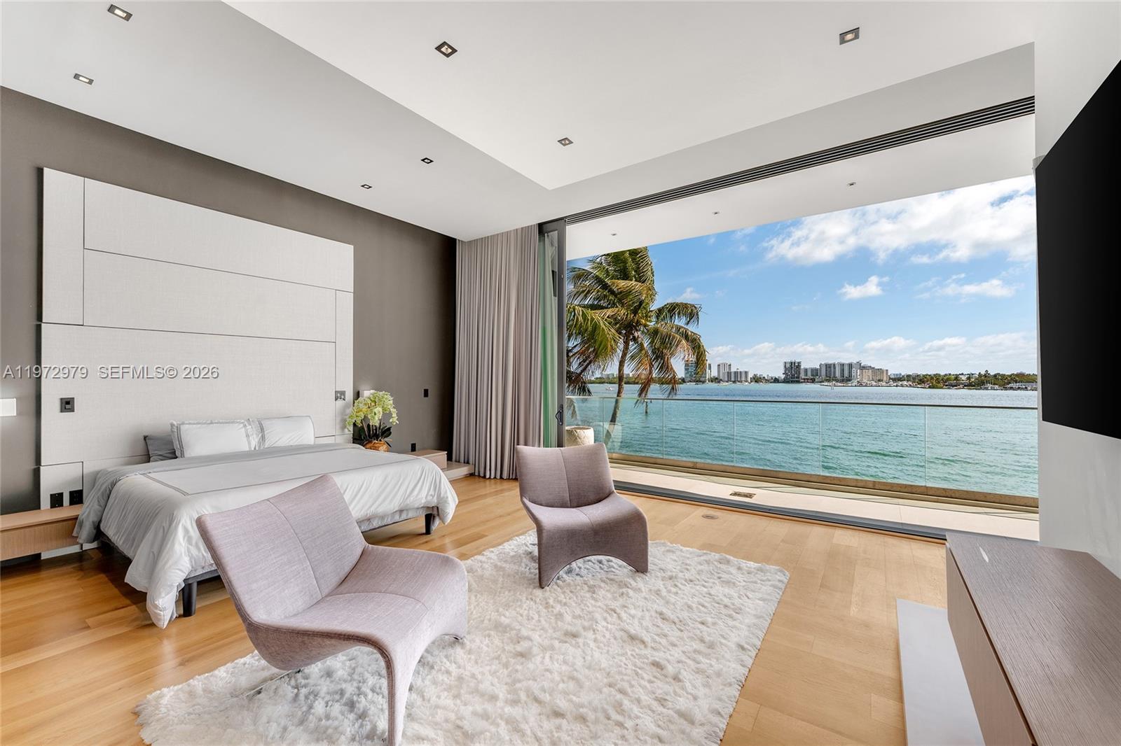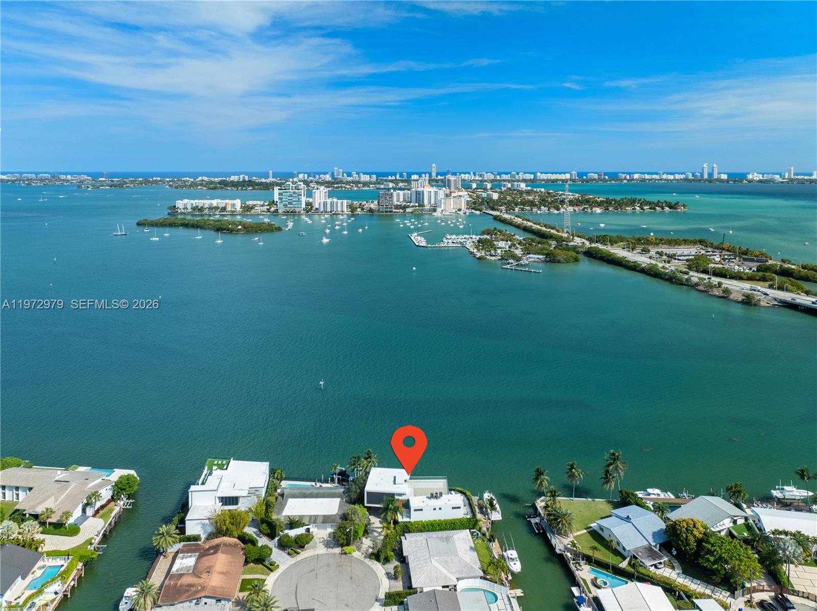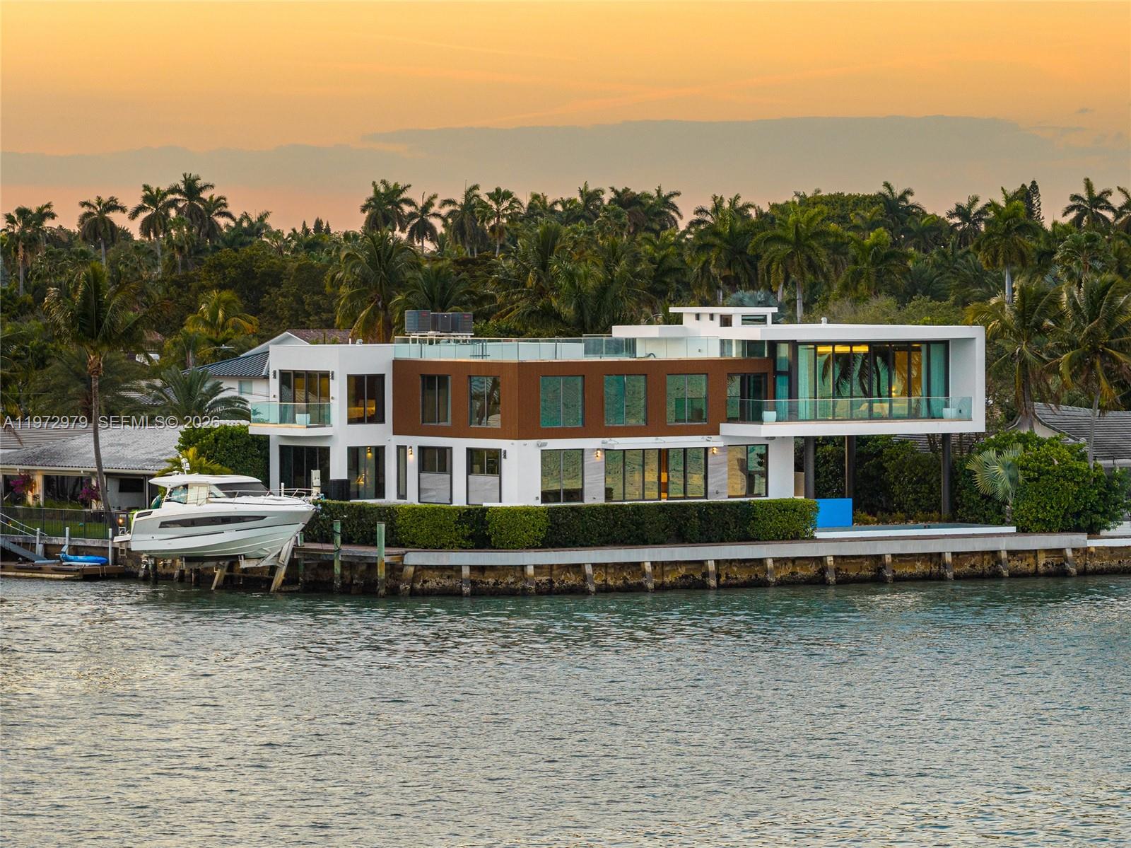 Tri-level modern bayfront estate in a quiet cul-de-sac sits on a coveted 9,650 SF point lot offering 171’ WF, 60 FT dock w/boat lift, direct bay & ocean access. Gated entry, 5BR/5.5BA incl. staff BR, 5,326 SF & dramatic Great Room w/spacious open floor plan seamlessly integrates living, entertaining, & dining areas all w/water views. Features soaring 24+ ft ceilings & enveloped by walls of glass opening to an expansive deck w/infinity pool overlooking the bay. Chef’s kitchen w/top-tier Miele appliances, integrated cabinetry & wine chillers. The 2nd floor luxe primary suite boasts a bayside terrace & stunning spa-inspired bath. Third-level rooftop lounge made to entertain with sweeping open bay & sunset views. Prime location minutes to beaches, Bal Harbour, Miami Beach, downtown & MIA.