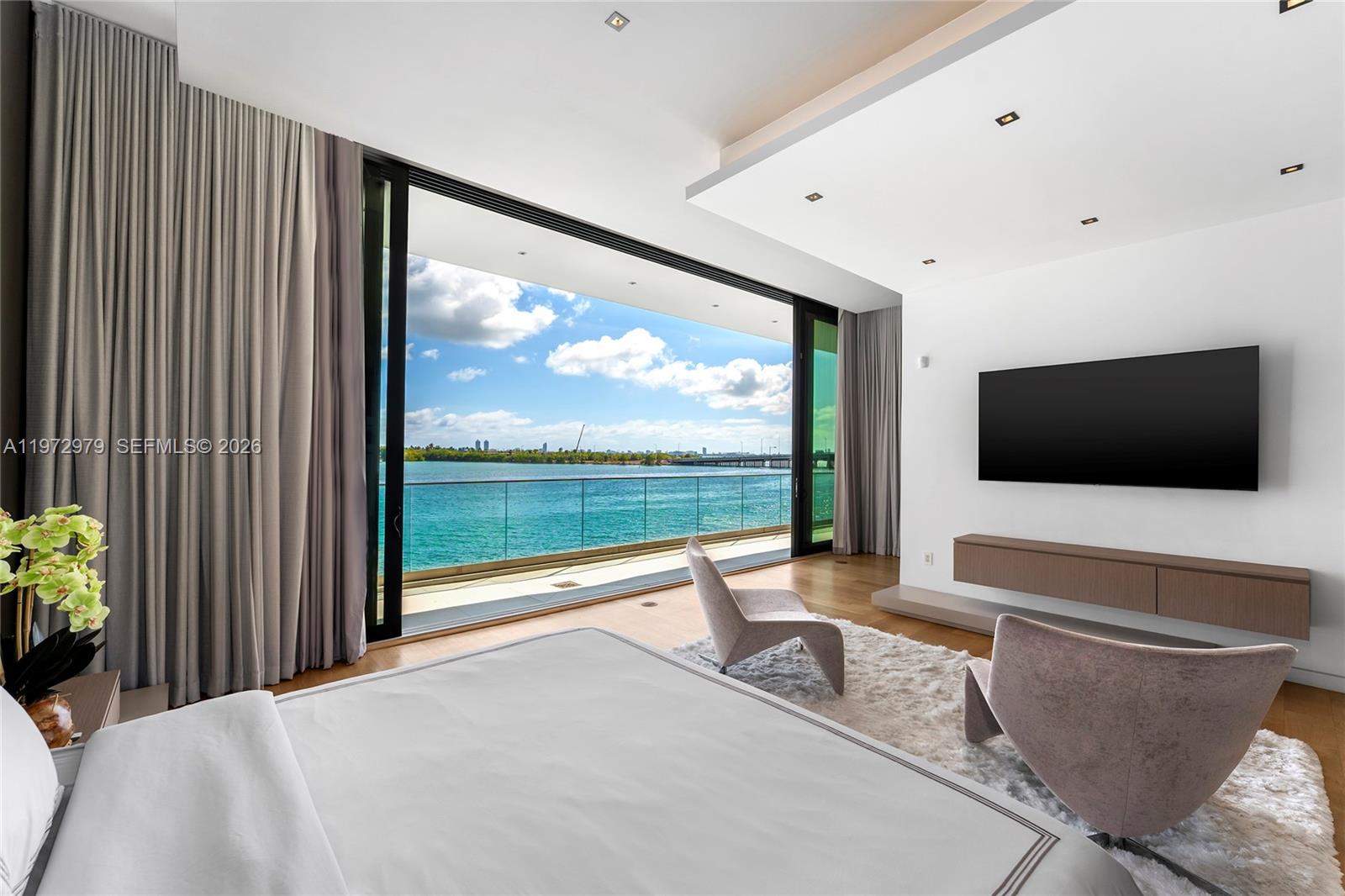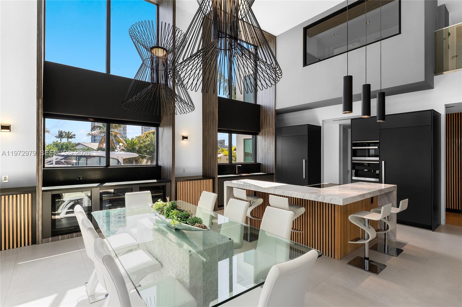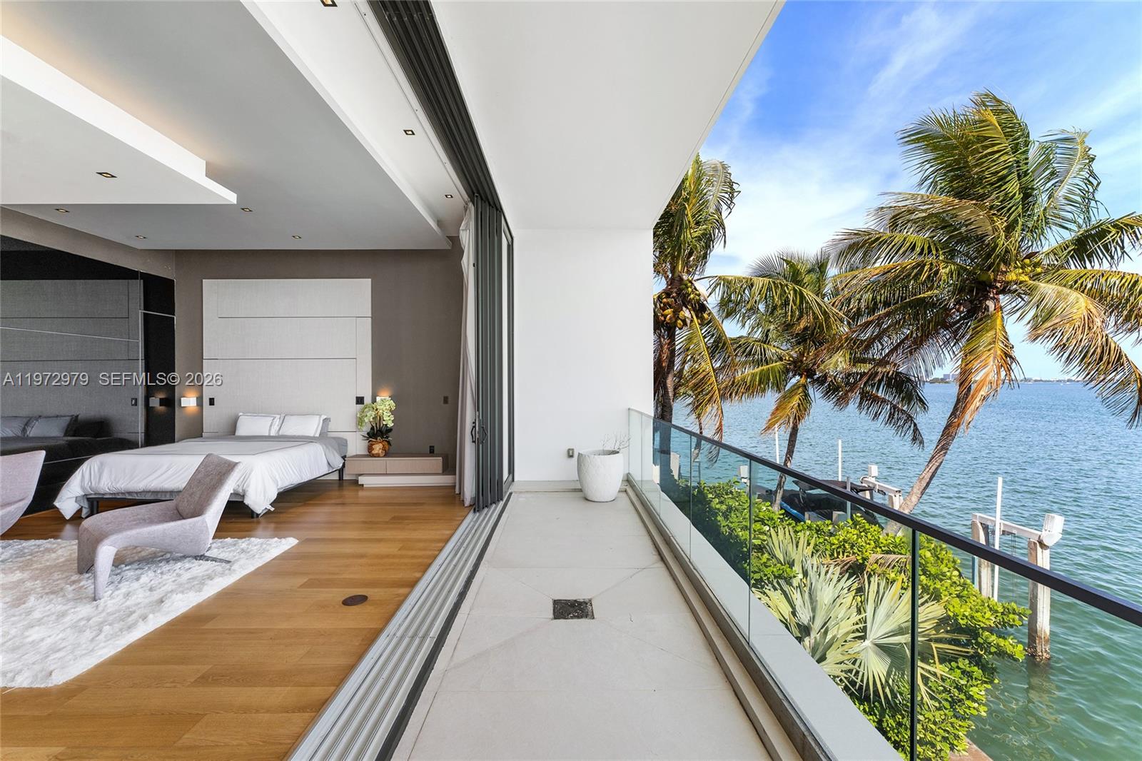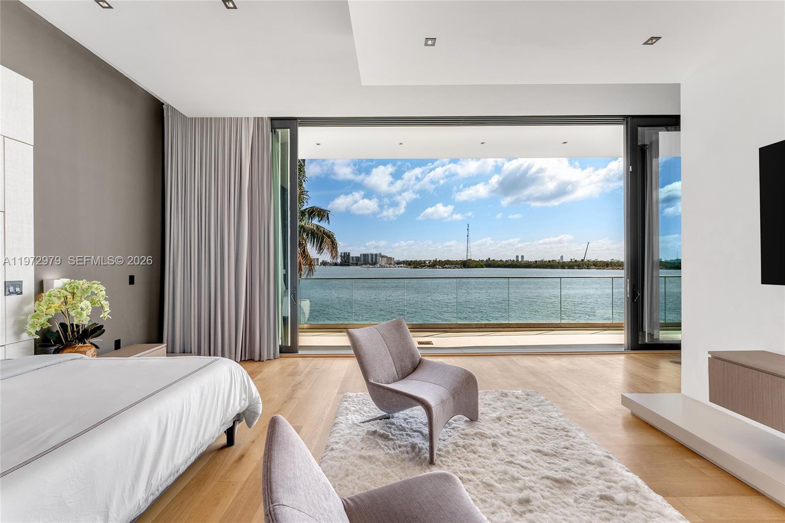Tri-level modern bayfront estate in a quiet cul-de-sac sits on a coveted 9,650 SF point lot offering 171’ WF, 60 FT dock w/boat lift, direct bay & ocean access. Gated entry, 5BR/5.5BA incl. staff BR, 5,326 SF & dramatic Great Room w/spacious open floor plan seamlessly integrates living, entertaining, & dining areas all w/water views. Features soaring 24+ ft ceilings & enveloped by walls of glass opening to an expansive deck w/infinity pool overlooking the bay. Chef’s kitchen w/top-tier Miele appliances, integrated cabinetry & wine chillers. The 2nd floor luxe primary suite boasts a bayside terrace & stunning spa-inspired bath. Third-level rooftop lounge made to entertain with sweeping open bay & sunset views. Prime location minutes to beaches, Bal Harbour, Miami Beach, downtown & MIA.
