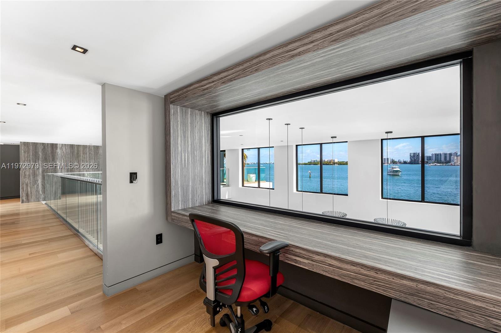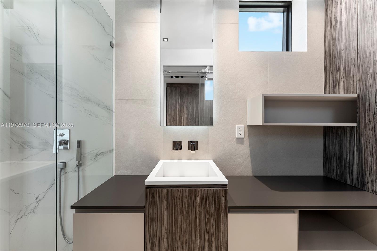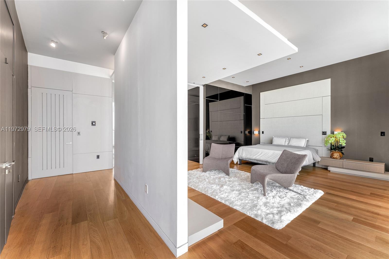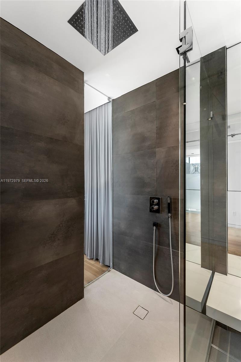 Tri-level modern bayfront estate in a quiet cul-de-sac sits on a coveted 9,650 SF point lot offering 171’ WF, 60 FT dock w/boat lift, direct bay & ocean access. Gated entry, 5BR/5.5BA incl. staff BR, 5,326 SF & dramatic Great Room w/spacious open floor plan seamlessly integrates living, entertaining, & dining areas all w/water views. Features soaring 24+ ft ceilings & enveloped by walls of glass opening to an expansive deck w/infinity pool overlooking the bay. Chef’s kitchen w/top-tier Miele appliances, integrated cabinetry & wine chillers. The 2nd floor luxe primary suite boasts a bayside terrace & stunning spa-inspired bath. Third-level rooftop lounge made to entertain with sweeping open bay & sunset views. Prime location minutes to beaches, Bal Harbour, Miami Beach, downtown & MIA.