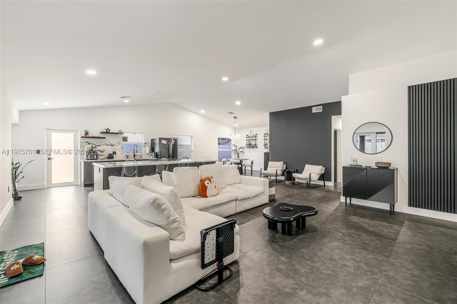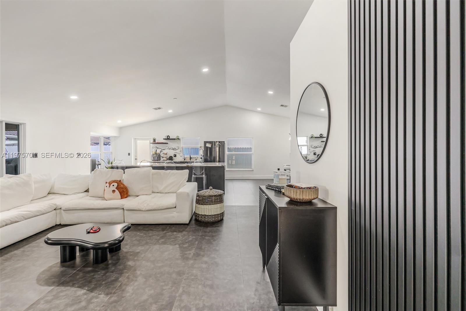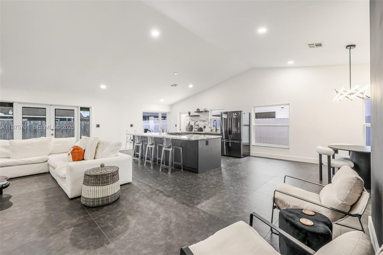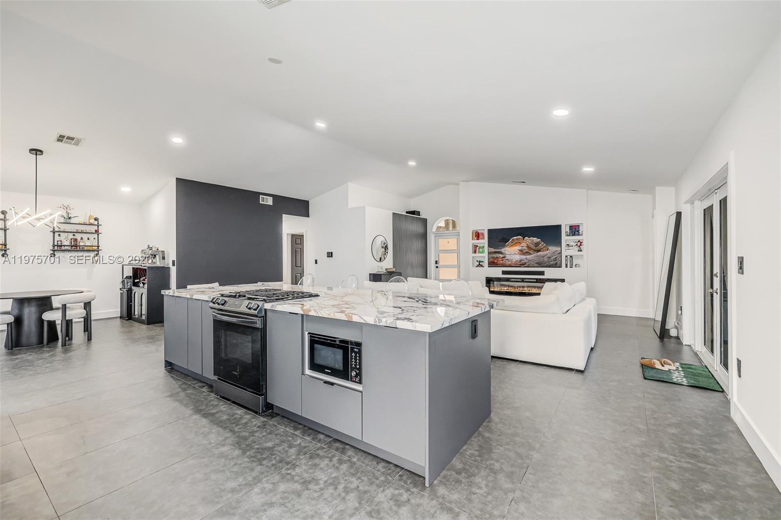 Fully remodeled with sleek, modern finishes, this home centers around a 12-foot kitchen island perfect for entertaining. The main living area includes a custom-built entertainment wall with fireplace and mounted TV - both included in the sale. Enjoy seamless indoor-outdoor living with a private pool, complemented by hurricane impact windows throughout. Ideally located in Lago Mar, the heart of West Kendall.