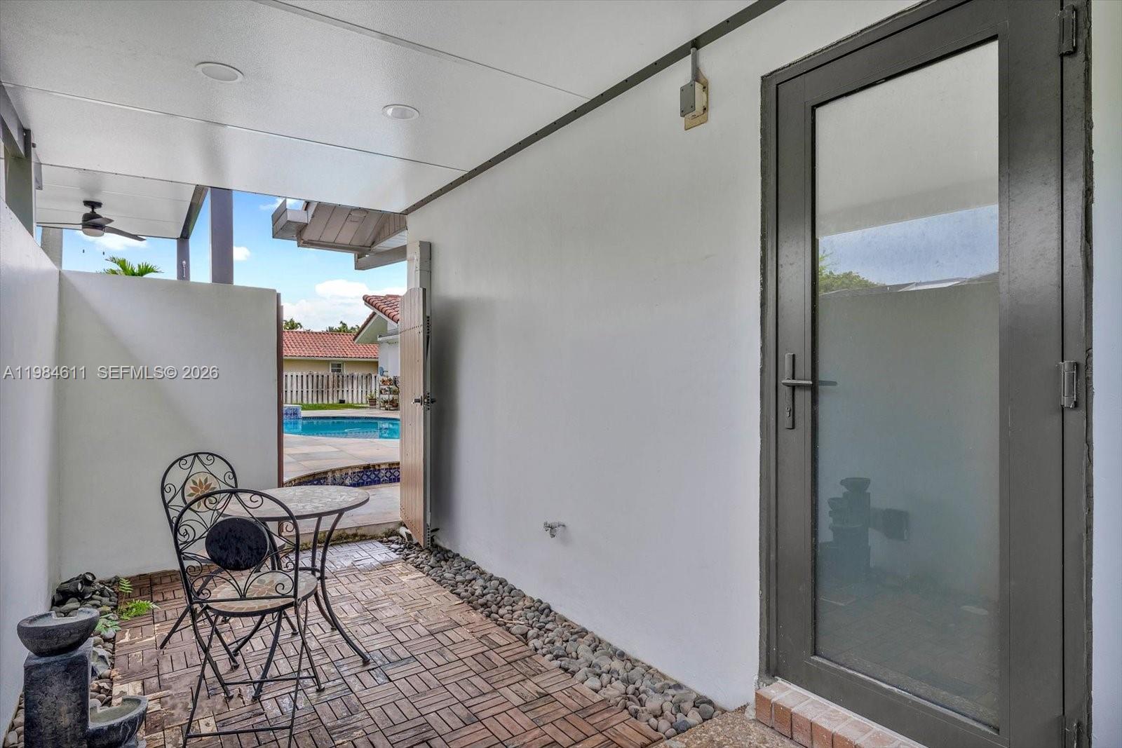 Ideally located in the sought-after community of Galloway Glen Estates, this beautifully renovated residence sits on a lush 21,875 SF cul-de-sac lot, just moments from The Falls and Dadeland Mall. Offering 5,235 total SF, the home features 6 bedrooms and 4 bathrooms, with community benefits that include 24-hour security patrol. A circular driveway and marble entry path lead to a welcoming façade framed by tropical landscaping. Outdoor living is exceptional, featuring an expansive covered terrace with wood beam ceilings, marble pool deck, heated saltwater pool with mosaic tile finish, gazebo, and a fully equipped summer kitchen—ideal for entertaining. Inside, vaulted wood-paneled ceiling and refined finishes create an inviting atmosphere. The home offers spacious living and dining areas, a family room with fireplace, and a custom wet bar. The modern kitchen showcases quartz countertops, a large island, premium KitchenAid appliances, and abundant storage. The private primary suite features two walk-in closets and a marble bath with dual vanities and a frameless glass shower. Additional highlights include impact windows and doors, solar panels for energy efficiency, and a comprehensive 2021 renovation—delivering comfort, style, and convenience in a prime location.