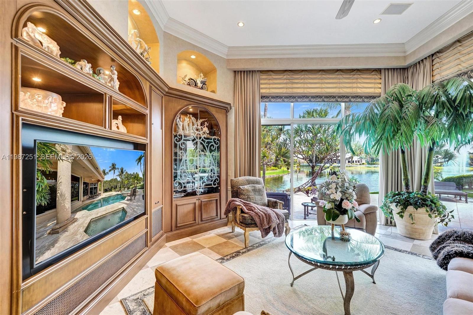 Nestled within the prestigious gaurd-gated community of Hawks Landing, this exceptional one story ranch style estate offers elegance, comfort, and true South Florida Living. Set on an oversized 15,000+ sq.ft. lakefront lot, the home spans approx. 3800 sq.ft interior with a split floor plan featuring 4BD, 4.5BA and a private office. The layout is thoughtfully designed with the primary suite privately situated on one side, two bedrooms on the opposite wing, and a separate bedroom and bath ideal for guests, in-laws, or nanny quarters, offering both privacy and flexibility. A large driveway and three-car garage enhance the home's strong curb appeal. Inside, marble floors flow through the main living areas, with carpeted bedrooms and a timeless Mediterranean design curated by Steven G. Designed for seamless indoor-outdoor living, the backyard showcases tranquil lake views, a resort-style pool and spa, elegant fountains, and a fully equipped summer kitchen, ideal for entertaining or relaxing in privacy. Recent upgrades include a 2018 roof and two newer AC units. Hawks Landing offers a renovated clubhouse, fitness center, tennis, pickleball, basketball, playgrounds, and 24 hour security, all just minutes from major highways, Ft.Lauderdale, top schools, dining, and shopping.