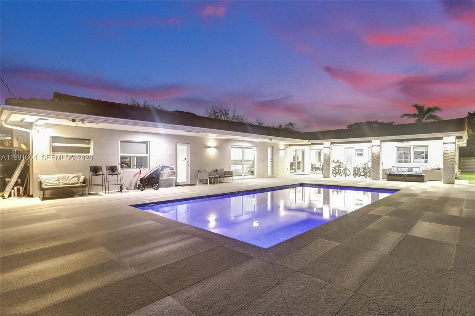 Welcome to this beautifully maintained modern one story home in the sought after Skylake neighborhood of North Miami Beach. Located on a semi private street and set on a lot of up to 13000 sq ft, this property offers privacy, comfort, and style. The home features 4 bedrooms and 3 bathrooms, including a spacious primary suite with a sitting area, dual sinks, and a sleek shower. A split bedroom layout provides flexibility and privacy. The layout includes a formal dining area, a family and dining combination, and a counter that connects the kitchen and living areas. The kitchen features a Taj Mahal marble countertop and essential appliances including a wall oven, electric range, microwave, dishwasher, and disposal. Porcelain flooring runs throughout, and impact windows provide security and efficiency. The home also includes a security camera system. Enjoy the backyard with a mosaic tiled pool featuring a saltwater system and heater, open porch, outdoor kitchen, artificial turf, and plenty of space for entertaining. Additional features include a 2 car garage, driveway parking, laundry area, and central air and heating. Do not miss this opportunity in North Miami Beach.