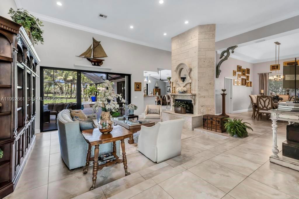 Stunning 5-bedroom, 4.5-bathroom estate featuring a grand entrance with soaring ceilings and an abundance of natural light throughout. The home offers elegant formal living spaces, including a cozy fireplace in the formal living room and a spacious dining area perfect for entertaining, along with a second expansive living room that provides plenty of space for relaxing or hosting gatherings. At the heart of the home is a chef’s kitchen designed for both function and style, complete with dual islands, stainless steel appliances, a spacious pantry, and an open layout that flows seamlessly into the main living area. Built for both comfort and peace of mind, the home is equipped with full hurricane impact windows and doors throughout, offering enhanced security, energy efficiency, and storm protection. The expansive primary suite serves as a private retreat with sliding glass doors leading to the backyard, oversized walk-in closets with custom built-ins, and a luxurious spa-like bathroom featuring a large walk-in shower. Guest bedrooms are thoughtfully positioned on the opposite side of the home, including a Jack and Jill bathroom for added convenience. The freshly painted exterior enhances the home’s curb appeal, while the backyard offers a true resort-style setting with travertine pavers, a sparkling pool, ample green space, a newer screened enclosure, breathtaking wide lake views, and a convenient outdoor half bathroom creating the perfect space to relax or entertain.
