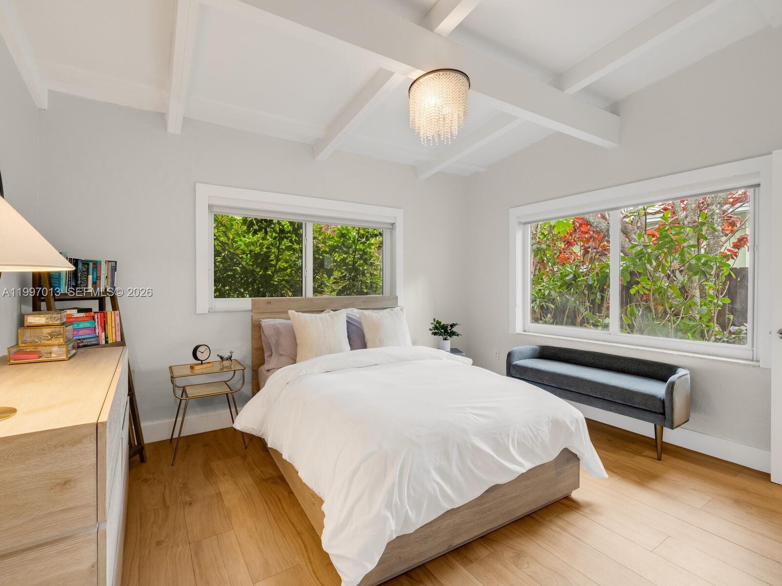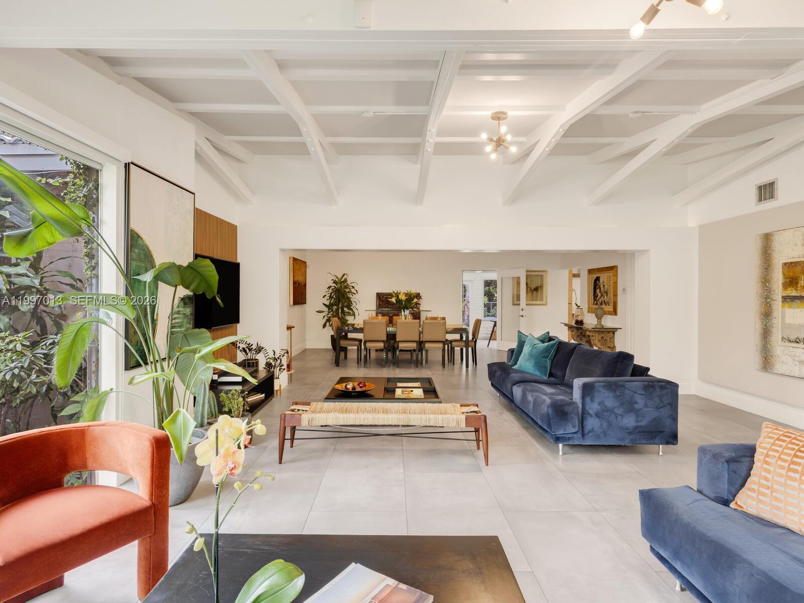 Welcome to Casa Selva in Biscayne Park— a tucked-away tropical mid-century retreat where architecture and nature exist in perfect harmony. Set on an expansive 11,475 SF lot, this 3-bedroom, 2-bath residence offers 2,242 SF of living space enveloped in lush, private gardens. Enter into a dramatic open living, dining, and media space defined by soaring vaulted wood beam ceilings and walls of glass that frame the tropical landscape—creating a serene, gallery-like atmosphere that feels torn from the pages of Architectural Digest. The updated chef’s kitchen features a gas range, eat-in island, and abundant storage. The split floor plan places the primary suite with double-vanity renovated bath on the north side, while two guest bedrooms share a stylish Jack & Jill bath to the south. A spacious Florida room with brick accents opens to a backyard oasis complete with entertaining patio and mango trees. Additional features include new A/C, one-car garage, utility storage, and curated landscape lighting. Hidden, soulful, and architecturally rich—this is Biscayne Park living at its most distinctive.