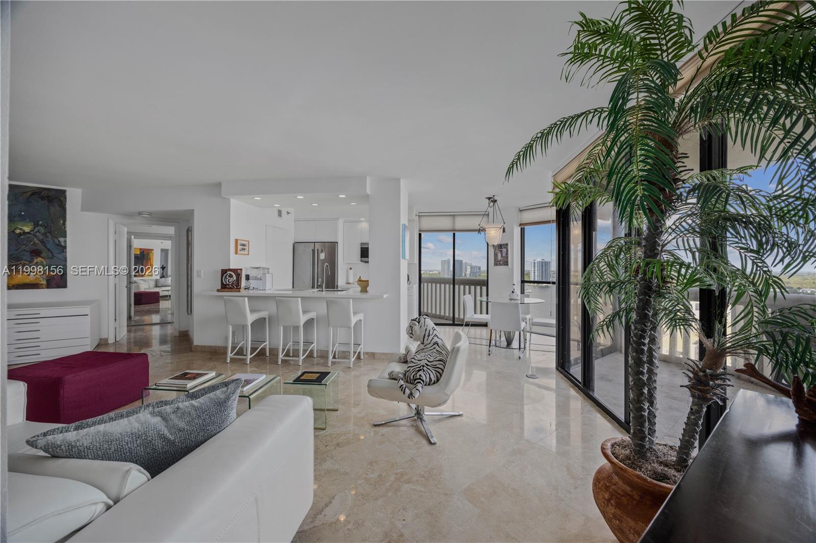 Beautiful, Relaxing Water Views from this 19th floor unit. Come sit on either of the two balconies and watch the boats go by, the fish swim below or just gaze at the amazing views from all directions. This 2 bedroom 2 bathroom, updated units boasts an open, updated kitchen with custom built pantry, marble floors, updated bathrooms, smooth ceilings and walls, walk in closets, split floor plan with full size washer/dryer in the unit. Jacuzzi tub and stand up shower in the master, water views form both bedroom. This building has its own pool, gym, hot tub, conference room, library, rec room with coffee and billiards. All this in the unmatched Luxury Resort Living on Williams Island. This Luxury Resort offers, great security with roving guards a 27,000 sq ft Spa, New Clubhouse with restaurants, Deli, Huge Gym, Classes, Outdoor pool, Indoor Pool, 15 Tennis courts, 4 Padel Court, Pickleball courts, pro shop, nail salon and more. Everything you could want for a luxury healthy lifestyle. Building has fully funded reserves. Call for your private tour.