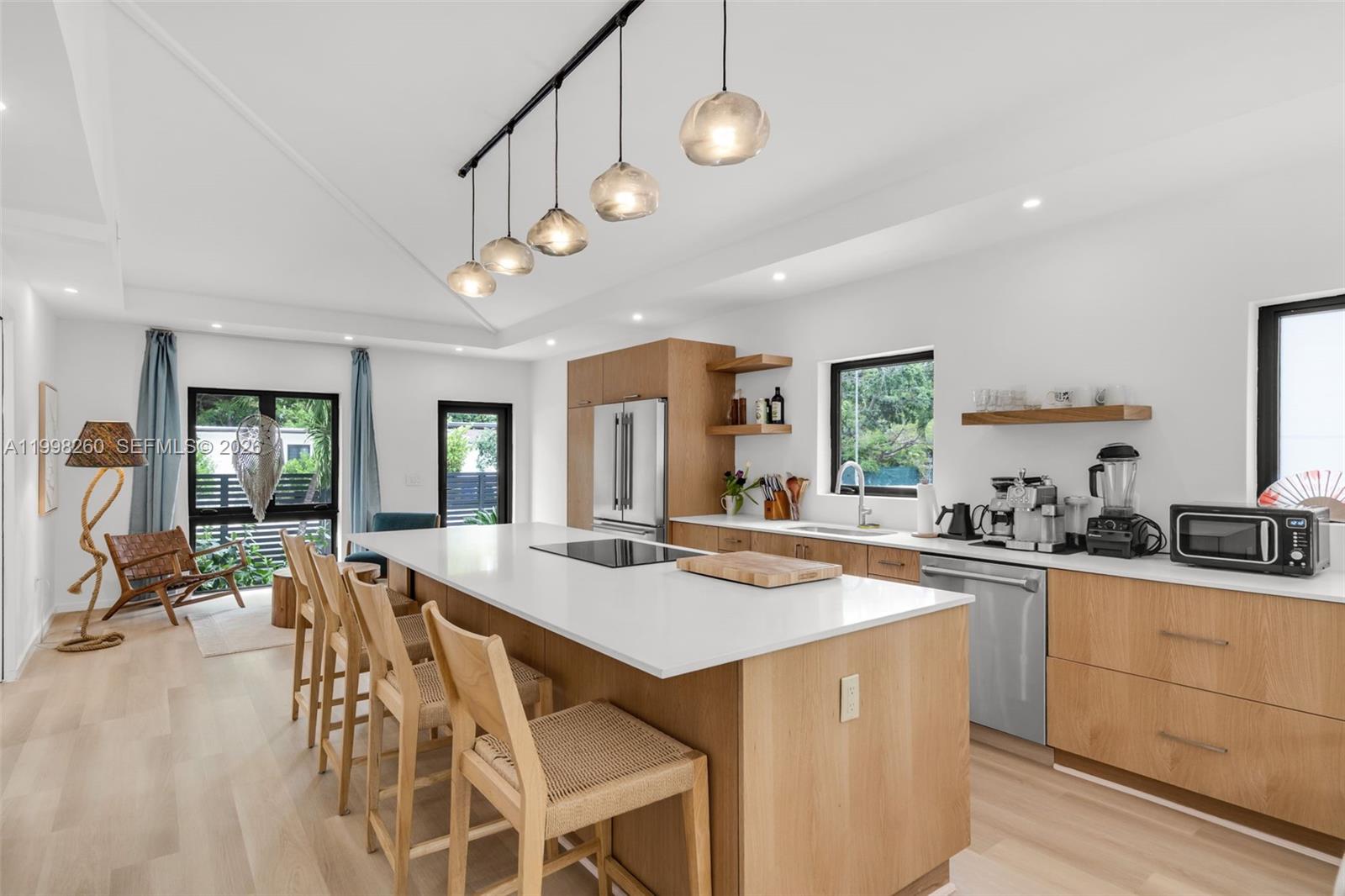 Wabi Sabi retreat on an oversized 7,650 SF corner lot in one of Miami's fastest-moving corridors. Move in now, build up later. Fully renovated single-story residence with vaulted ceilings throughout, 3 bedrooms, 3 full bathrooms finished in hand-applied microcement, and new hurricane-impact windows and sliding doors. Wood floors, central AC, and a 2-car garage. Offered furnished — designer pieces negotiable. Rare corner lot with dual driveways, mature mango, almond, and avocado trees, a designer outdoor shower, and room for a pool. New 6-foot privacy fence and gate. East-facing exposure with a garden setting that feels nothing like the city just minutes away. T4-R zoning on 7,650 SF allows up to a 6-unit, three-story building — or take advantage of Miami's Apartment Hotel designation for short-term rental income. Rental demand in this submarket runs significantly above national averages, so the carry pencils while you permit and plan. Walking distance to the Design District. Minutes from the $3B Little River District, Midtown, Wynwood, and I-95. This is the path of progress — priced to reflect the land value, with a turnkey home providing incredible added value.