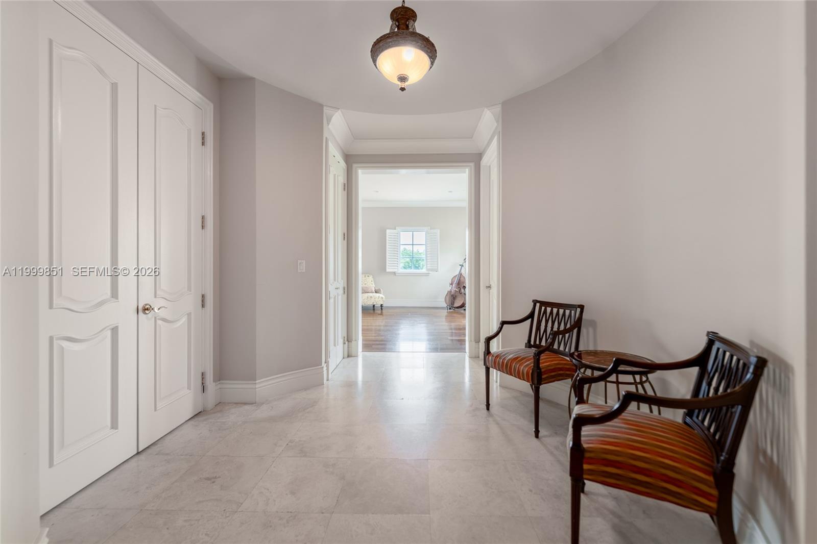 A statement of timeless elegance and architectural grandeur, this Mediterranean-inspired estate welcomes you through a gated entrance framed by majestic royal palms and a sweeping circular driveway. The striking façade showcases symmetrical design, arched windows, and a second-story balcony that sets an impressive tone of refinement. Step inside to a breathtaking double-height foyer featuring a dramatic curved staircase with wrought-iron detailing, gleaming marble floors, and a grand arched entry door that fills the space with natural light. Every element reflects meticulous craftsmanship and a sense of arrival. The main living areas are designed for both comfort and sophisticated entertaining, highlighted by soaring ceilings, expansive open spaces, and elegant archways that seamlessly connect each room. The formal living room exudes warmth and luxury, complemented by a second-floor balcony overlook that enhances the home’s open, airy ambiance. Architectural details such as custom iron railings, columns, and curated finishes elevate the interiors, while large windows and glass doors invite in natural light and offer tranquil views of the lush surroundings. This residence embodies the essence of South Florida luxury living—grand yet inviting, refined yet comfortable—offering a perfect setting for upscale entertaining and everyday elegance.