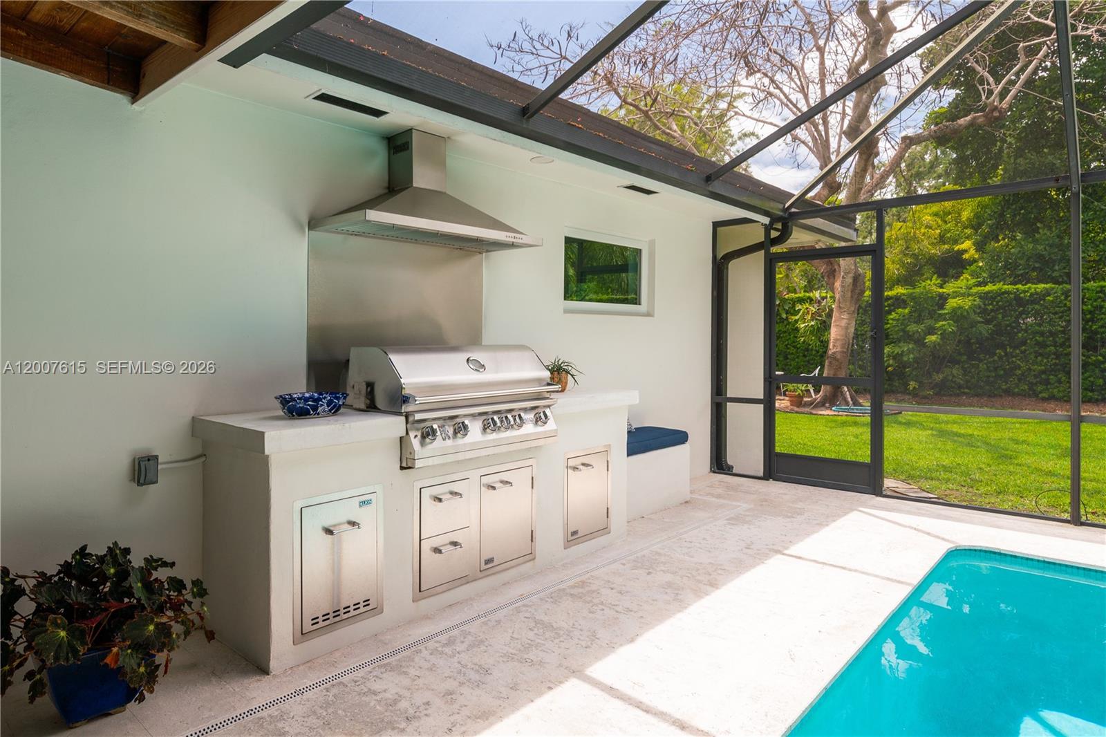 This exceptional 4-bedroom, 2.5-bath home is ideal for comfort, entertaining, and outdoor living. Ideally located near top-rated public and private schools, parks, shops, and bike paths, it is tucked away at the end of a quiet cul-de-sac with minimal road traffic. The spacious primary suite features his-and-hers walk-in closets and an en-suite bath with dual sinks, dual shower heads, and a separate tub. The large kitchen boasts wood cabinetry, granite countertops, and a generous breakfast nook. The open living, dining, and family areas offer easy flow, with disappearing sliding glass doors connecting indoor and outdoor living. Step outside to a covered screened enclosure that helps keep bugs out and enjoy the large patio—perfect for entertaining—with its built-in grill and bar and easy access to the kitchen, plus a sparkling pool for relaxing and fun. The fenced backyard provides added privacy. The home also includes a dedicated laundry room with cabinetry and a utility sink. All windows and doors are impact-resistant, and the home has a concrete tile roof (2019).