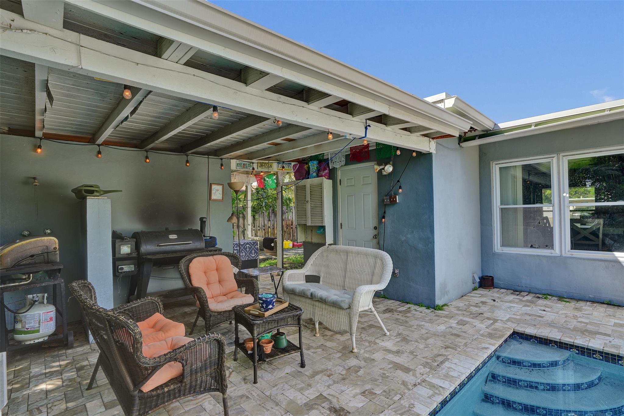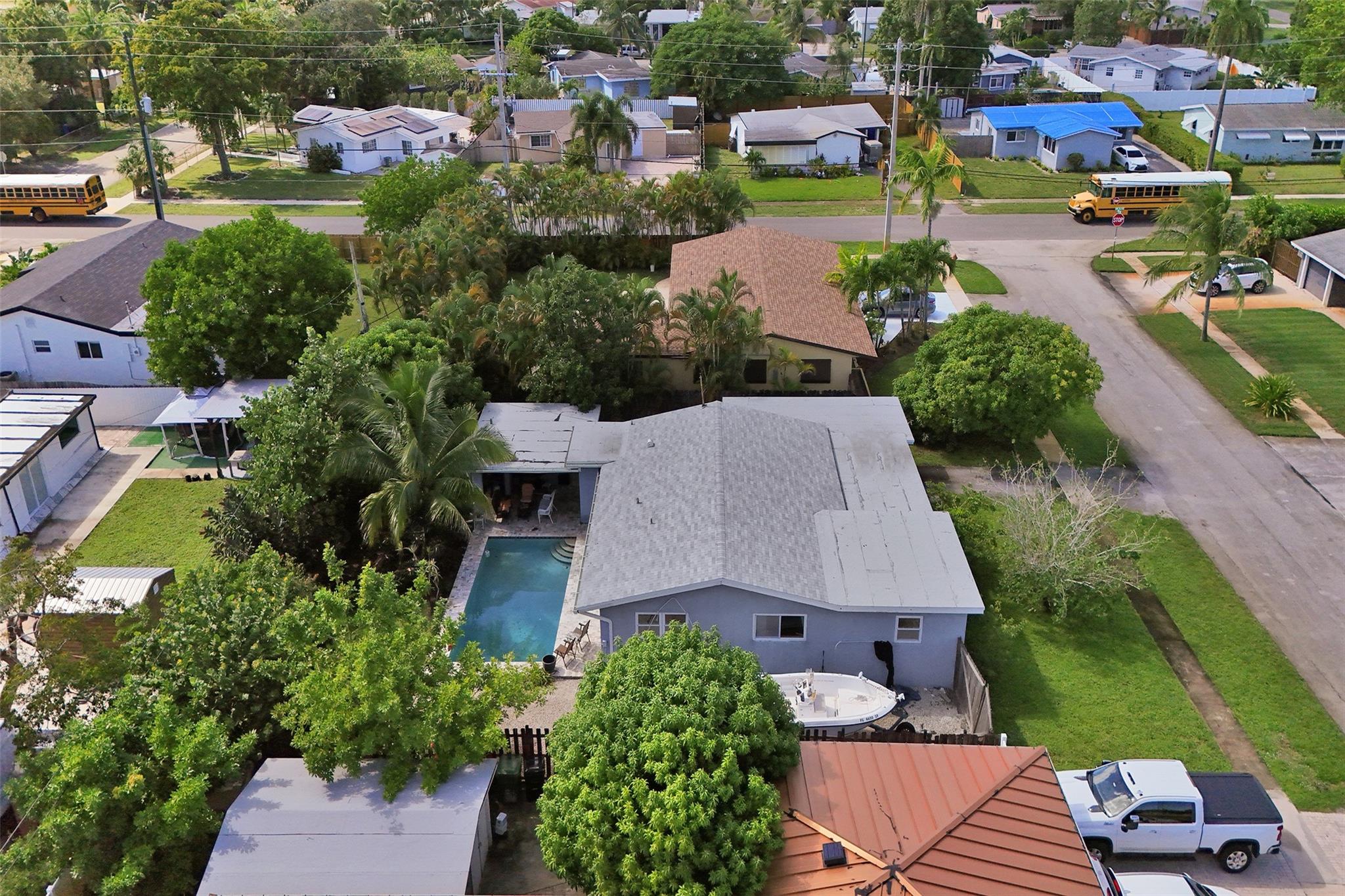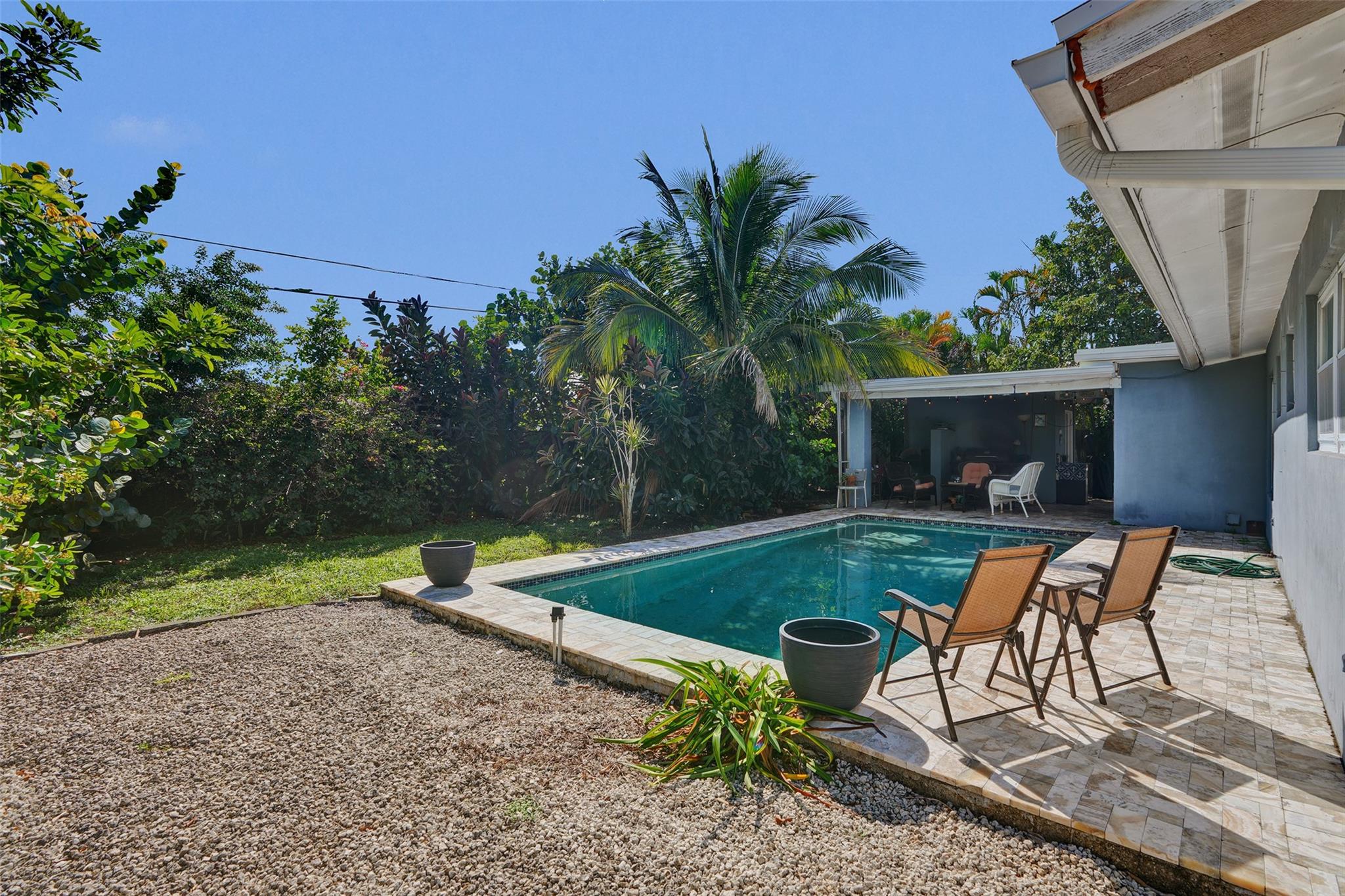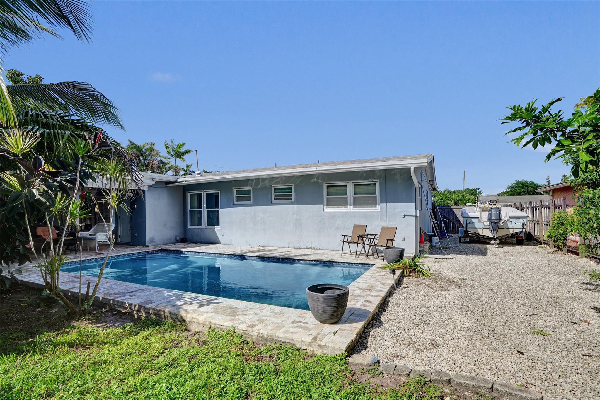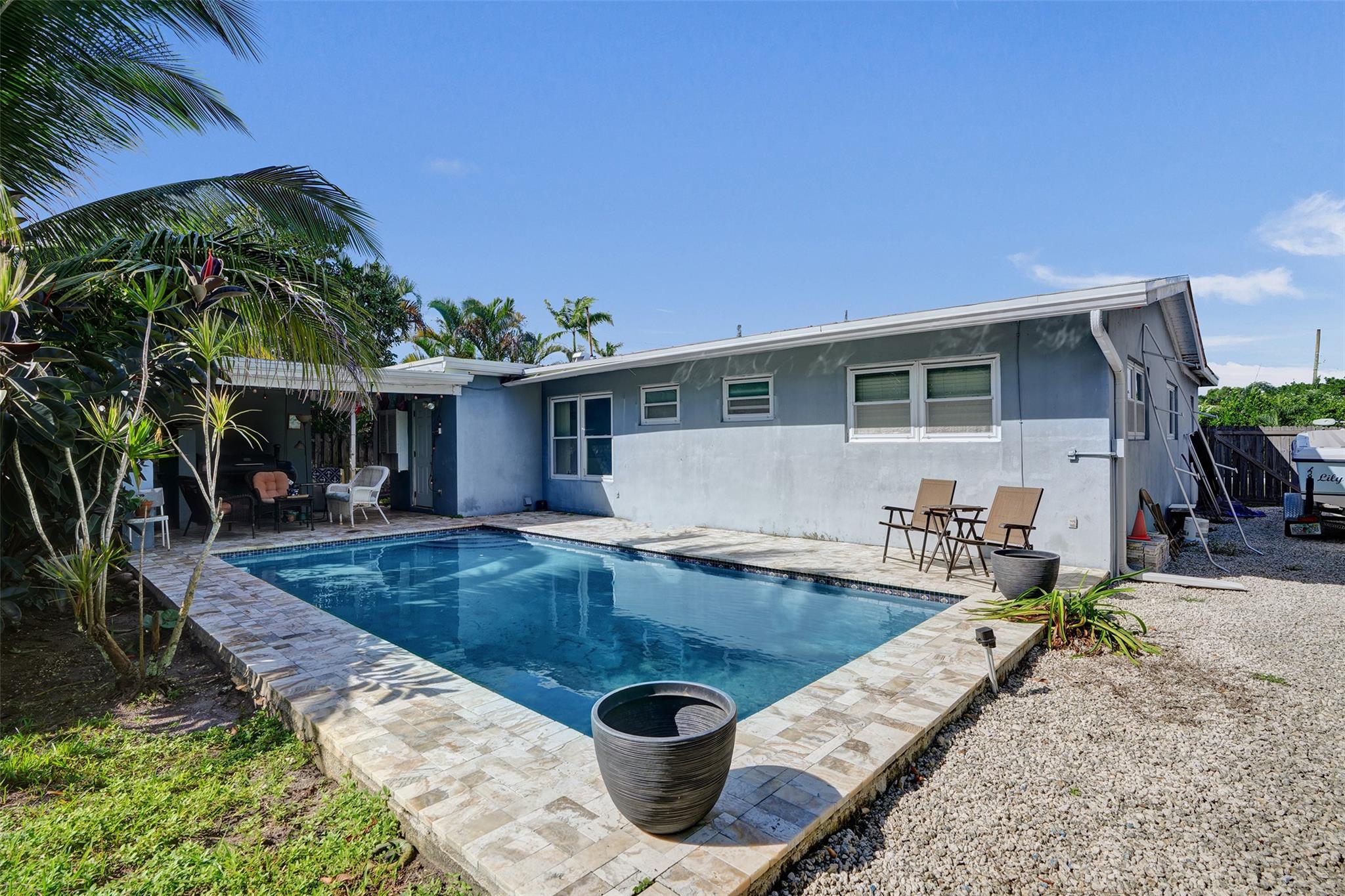One of the few pool homes in the area priced under $500K. New Roof (2024, with permits), Impact Windows & Doors (with permits), and A/C (2019, with permits). Bright 3BR/2BA layout with tile flooring and huge bedrooms— rare for this area. Kitchen features white and beige cabinetry with granite and Formica. Large 8,250 sq ft lot—bring your boat; marina minutes away. Includes a carport with storage plus an extra shed. The outdoor space is ideal for entertaining, offering a sparkling pool, travertine/marble paver deck, covered patio, and a fully fenced yard with mango and avocado trees. Irrigation runs on well water. Priced to sell and ready for your upgrades—great potential to customize to your taste.