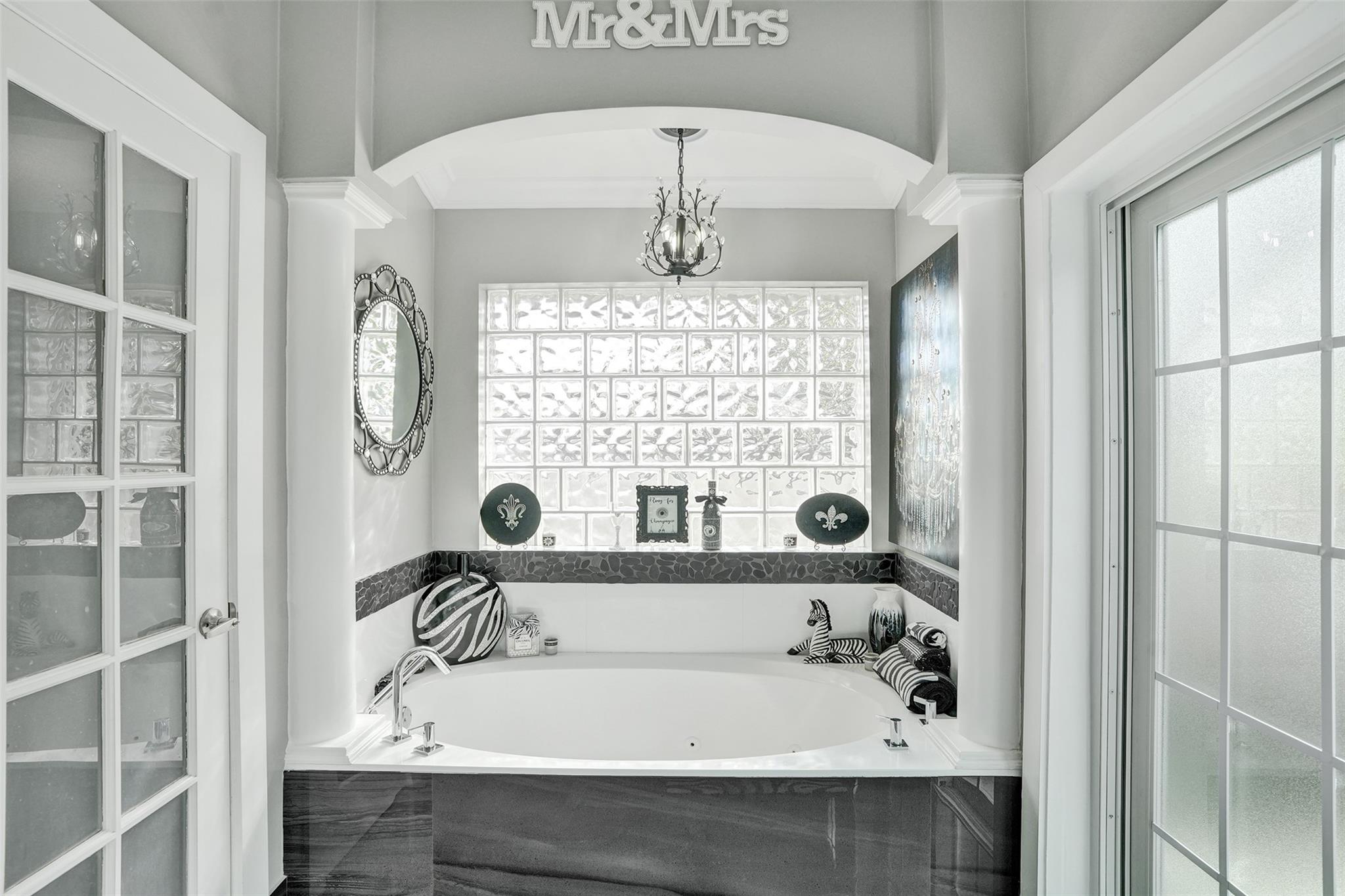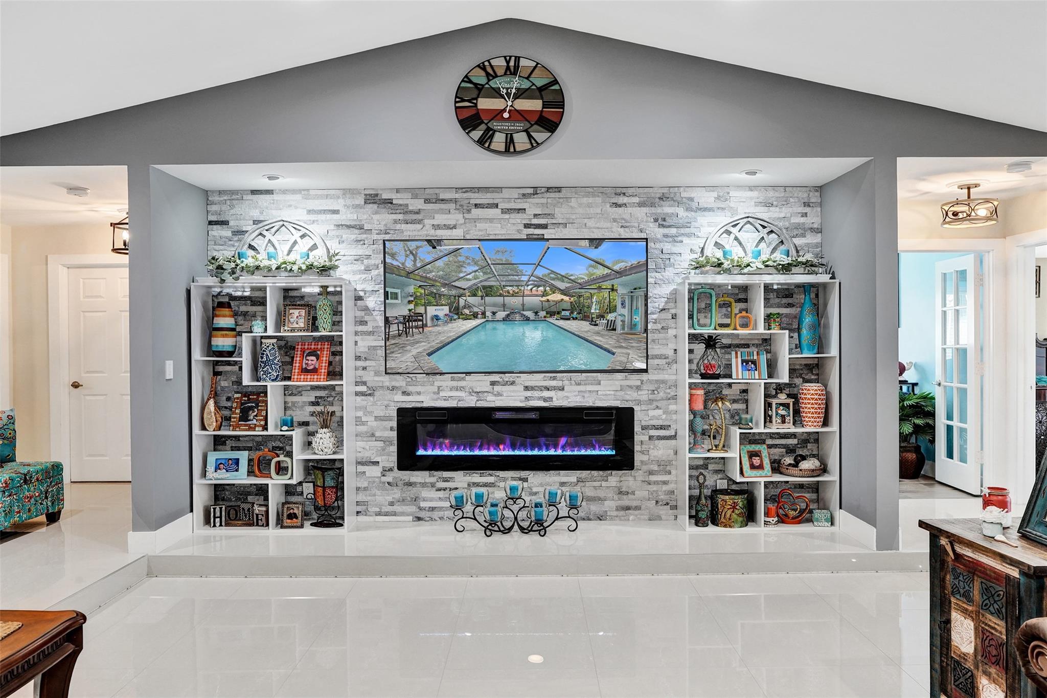 Beautifully renovated 4 bedroom, 2.5 bath home with high ceilings, abundant natural light, and views of a stunning pool area. Pool is heated. The spacious open living area flows into an oversized modern kitchen featuring vaulted ceilings, a large island, quartz countertops, wine chiller, and white and blonde cabinetry. Stylish upgrades include an electric fireplace, stone accent walls, custom neon lighting, and modern fixtures. The renovated primary suite offers a spa tub and separate shower. Porcelain flooring enhances the main living areas, with laminate floors in the bedrooms and new ceiling fans throughout. Additional highlights include an oversized garage, fenced yard, new plumbing and A/C ductwork in 2025, impact windows in most of the home (2025), A/C from 2017, and a 2006 roof.