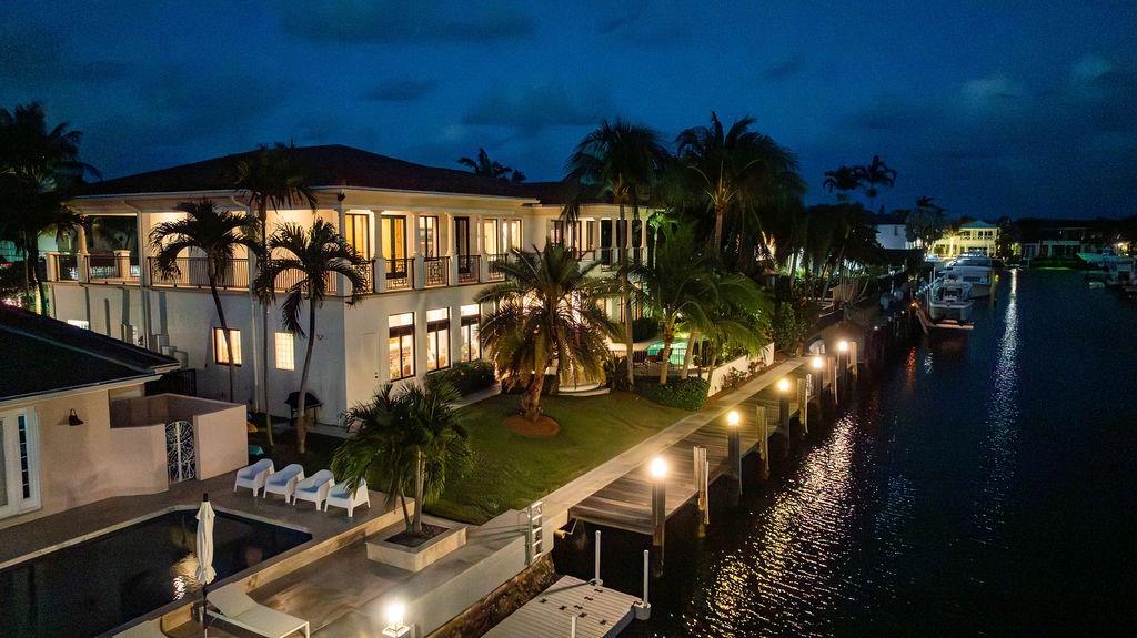 Timeless British West Indies masterpiece featuring 4 bedrooms plus bonus and exercise room, and 5.5 baths. Ideally located just 5 minutes to the ocean on the canals offering the greatest water depth in the city. Desirable South exposure. All-concrete construction, including concrete between floors, and elevated on pilings. First-floor primary suite allows for easy living. Three-car garage plus tackle room/workshop. Secondary kitchen and laundry combo adjacent to the main kitchen makes entertaining effortless. Expansive wraparound balcony overlooks a lush tropical backyard with covered patio, pool and integrated spa, and 100’ of dockage on Ipe wood dock. Original seawall replaced with a king batter pile seawall. A truly rare deepwater opportunity.