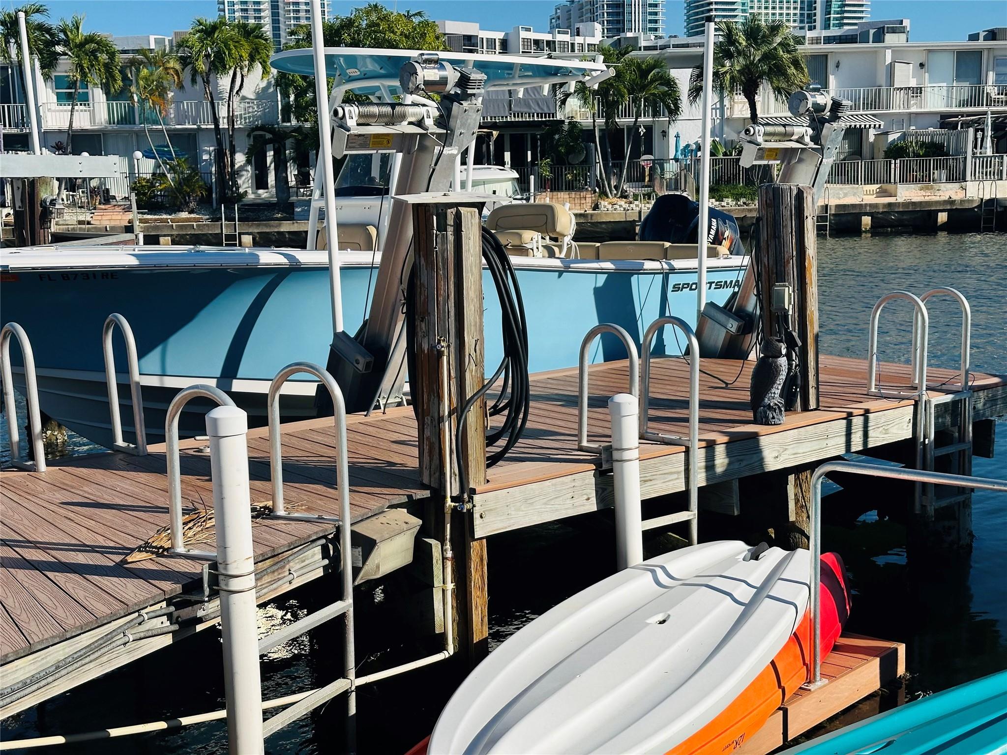 Beautiful 3 bedroom 2.5 bath waterfront townhome in Venetian Park. This tastefully updated home features a stunning eat-in kitchen with granite countertops, new stove, refrigerator and microwave. The open-concept family and dining area reveals a private patio, ideal for entertaining. Enjoy waterfront living with a fully automated boat lift, floating U-shaped dock, and an outdoor sitting area. The second floor offers 3 generously sized bedrooms, including a primary suite with a large walk-in closet with custom built-ins. Other highlights include waterproof poly wood flooring on stairs, hallway, and primary bedroom, impact windows and doors, blackout and zebra blinds, lush landscaping, a 3.5-ton A/C, semi-commercial electric water heater, insulated flat roof, and new front porch tile.