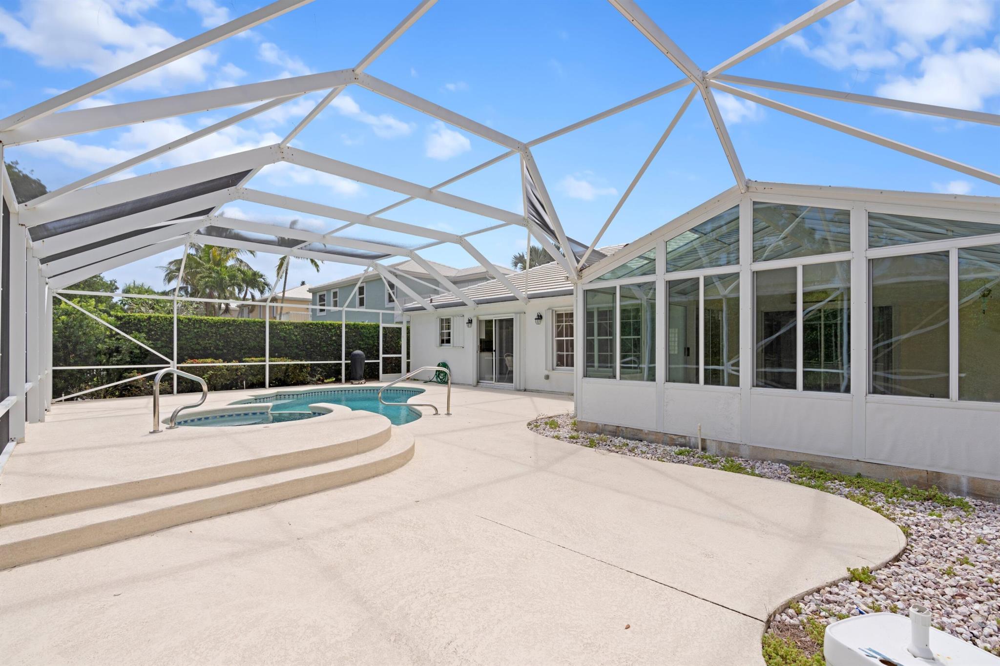 Listed under appraised value! Motivated Seller. Nestled in the highly desirable coastal town of Tequesta. This charming home is located on a quiet street in the gated community of North Passage. This home boasts an open floor-plan along with a solarium. This home features a new hot water heater installed this year and a newer roof from 2017. Enjoy indoor-outdoor living with sliding glass doors that lead out into a screened-in patio with a pool and spa. The backyard is private and great for entertaining. Also, just down street is the clubhouse with private amenities including a gym, playground, tennis courts, and a pool and a spa. Vacation from home and welcome home.