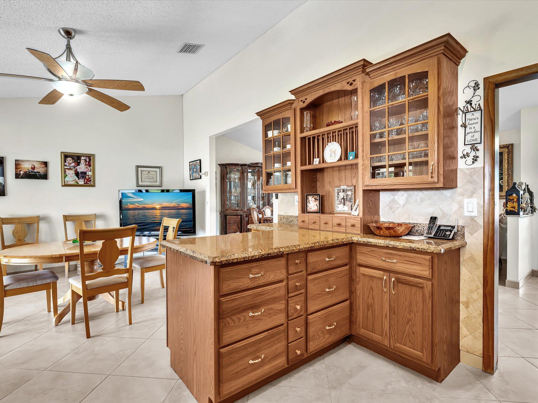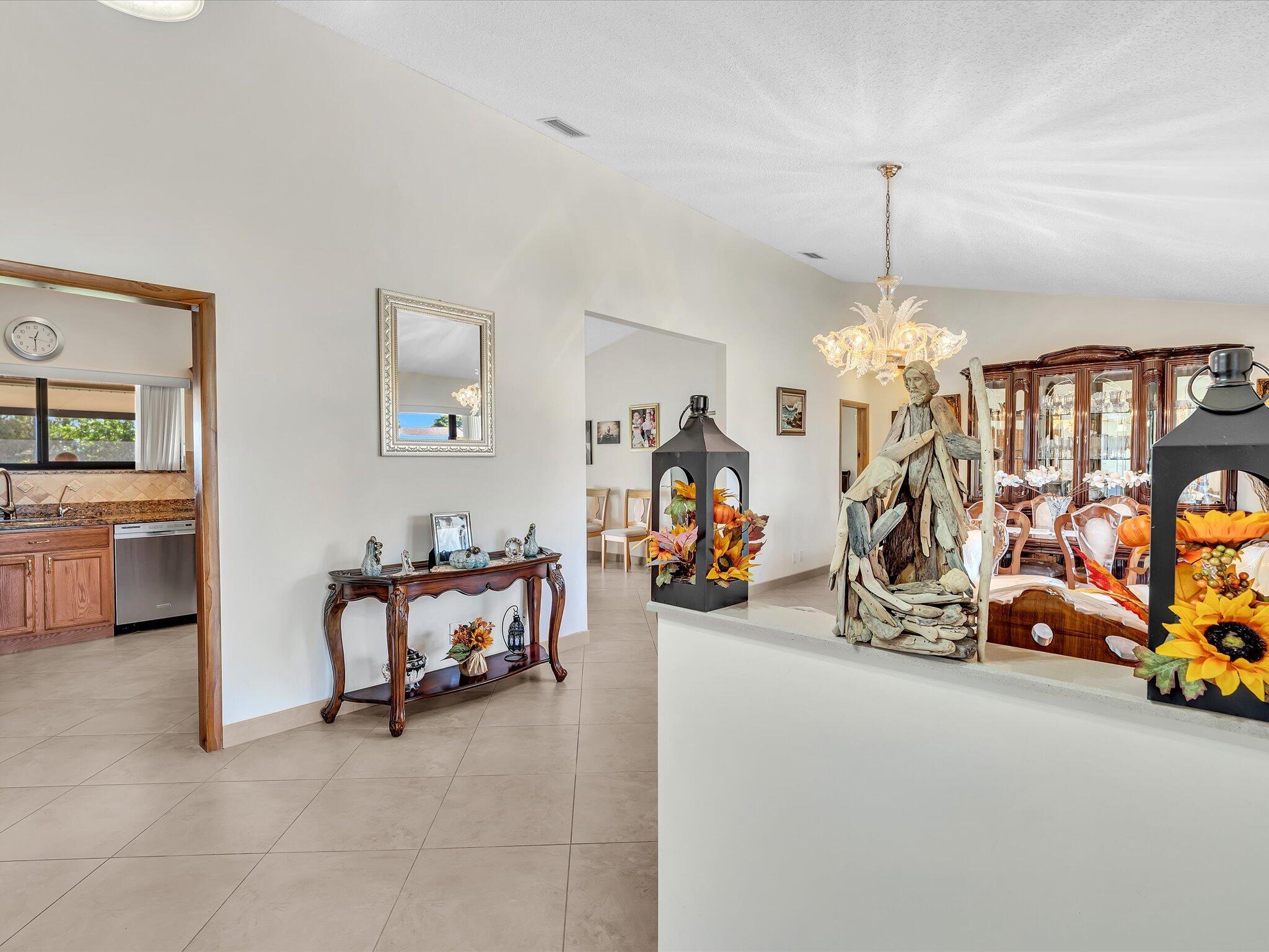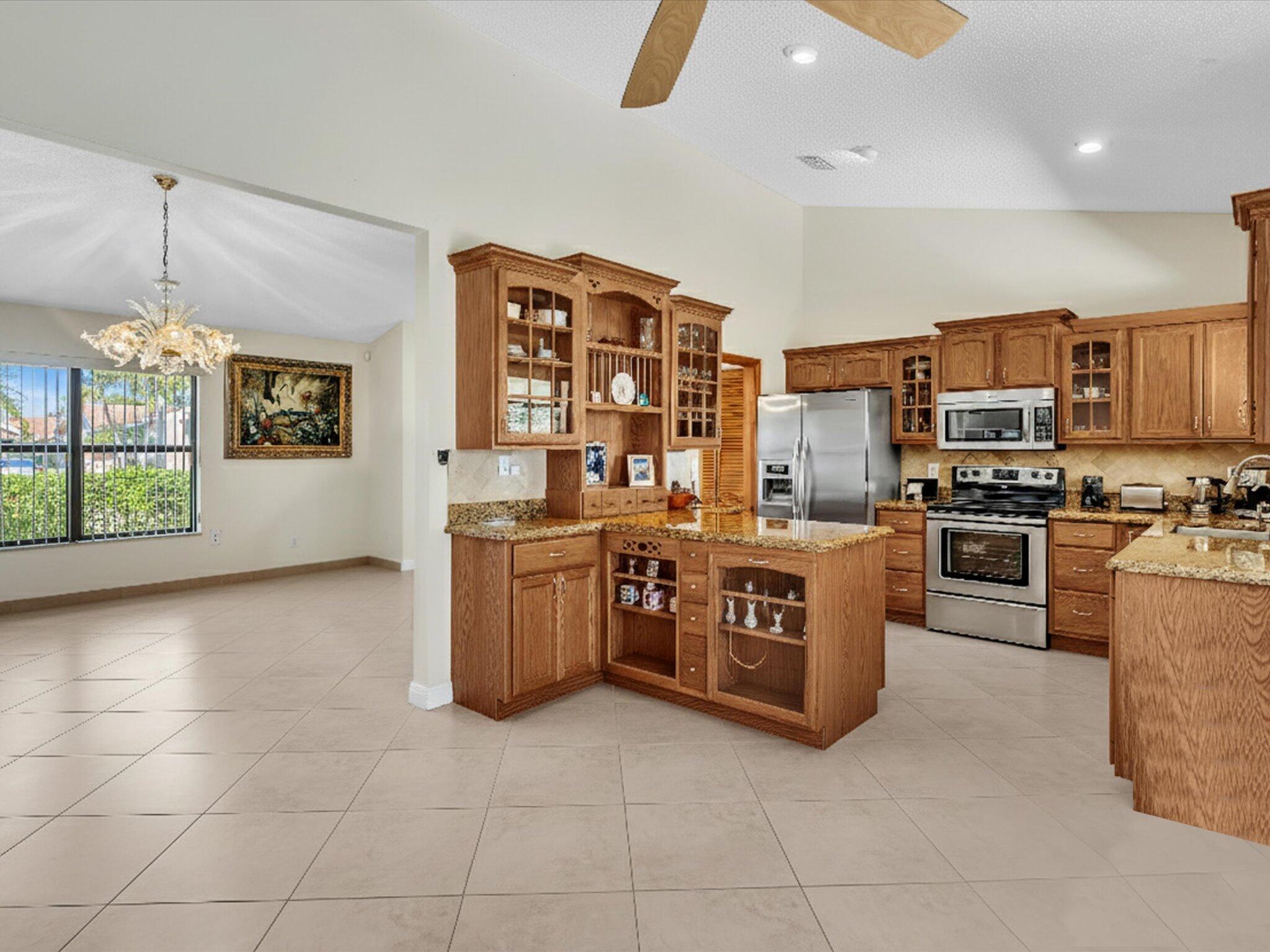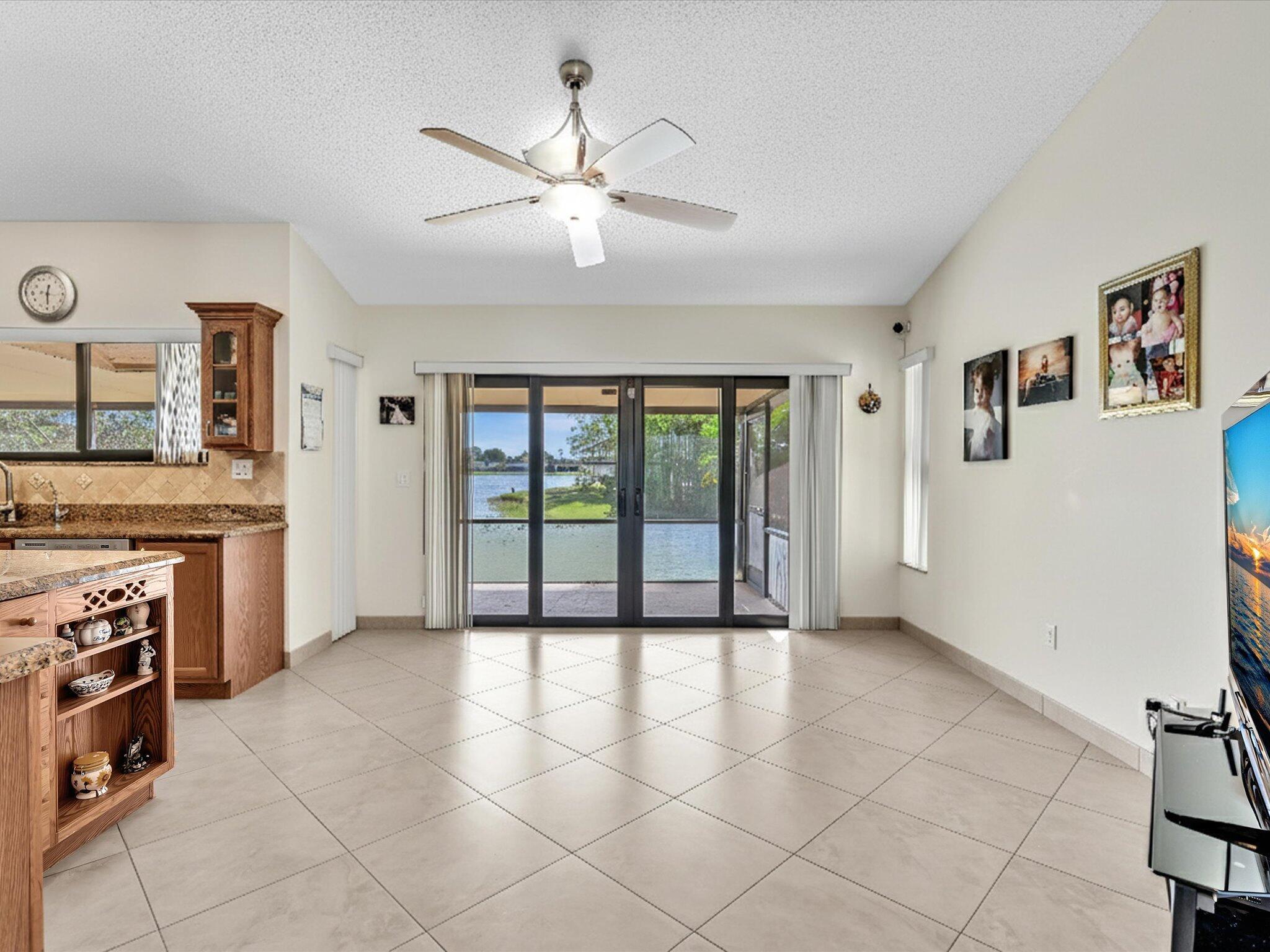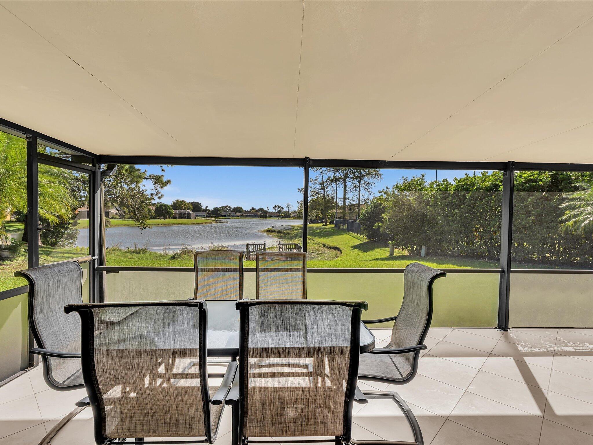 Absolute pristine condition. Panoramic lake views from all rooms with Southeast long lake views. New roof (2022) and impact windows & sliders. Neutral 20'' porcelain tile at diagonal throughout. Kitchen features solid oak wood cabinetry with glass display and storage nooks, Baltic Brown beveled edge granite counters and tumbled marble backsplash with pristine SS appliances. Both baths updated with upgraded vanities and floor to ceiling tile. Split floor plan with large bedrooms with Master featuring large 9'x6' walk in closet. Vaulted ceilings & solid wood interior doors throughout. Summer kitchen with gas stove on patio. Attractive front door with glass block sidelights. Oversize tiled 1 car garage (22'x15') w/ utility sink, pull down stairs & side door. Sprinkler off lake. Come see!