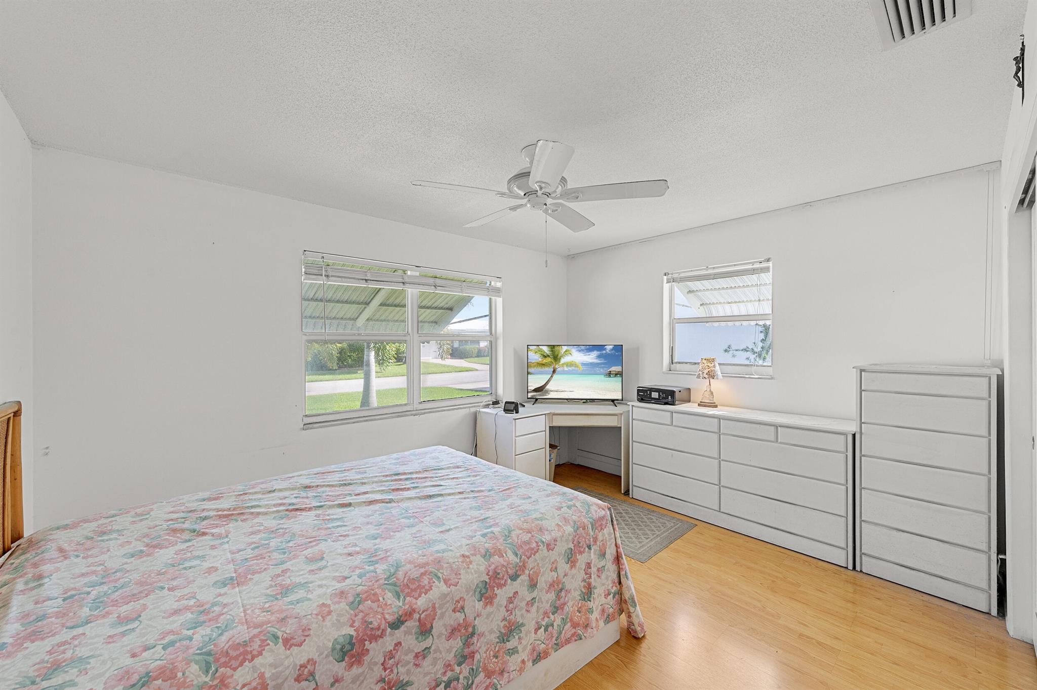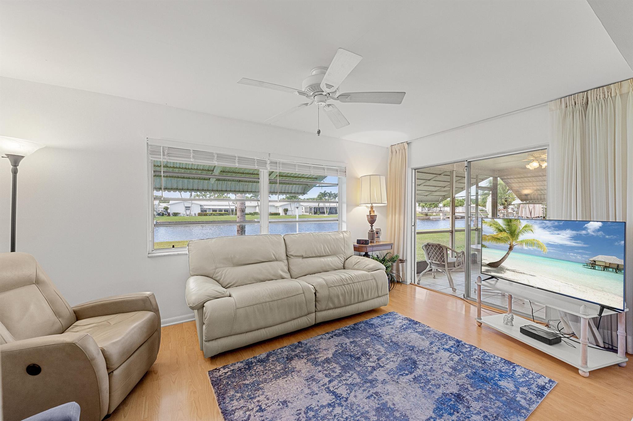 Nestled along a navigable 15+ mile waterway stretching from Delray to Lantana, this 2/2 waterfront home offers ever-changing views from the screened porch, breathtaking western sunsets, and gentle breezes. The expansive level yard with SW exposure is ideal for fishing or bird watching. Numerous updates through the 55 yrs of ownership include updated kitchen, bathrooms, windows, tile & faux wood flooring. Double driveway & 1 car garage with extra storage. The low HOA fee includes pressure washing & painting of the home. Residents have access to 3 clubhouses and 3 pools, free 18 hole Par 3 golf course, work out facility, billiards, bocce, cornhole, and more. The monthly newspaper keeps you informed of activities. Over 13 miles of roads for walking, jogging, and bike riding. 10 minutes to