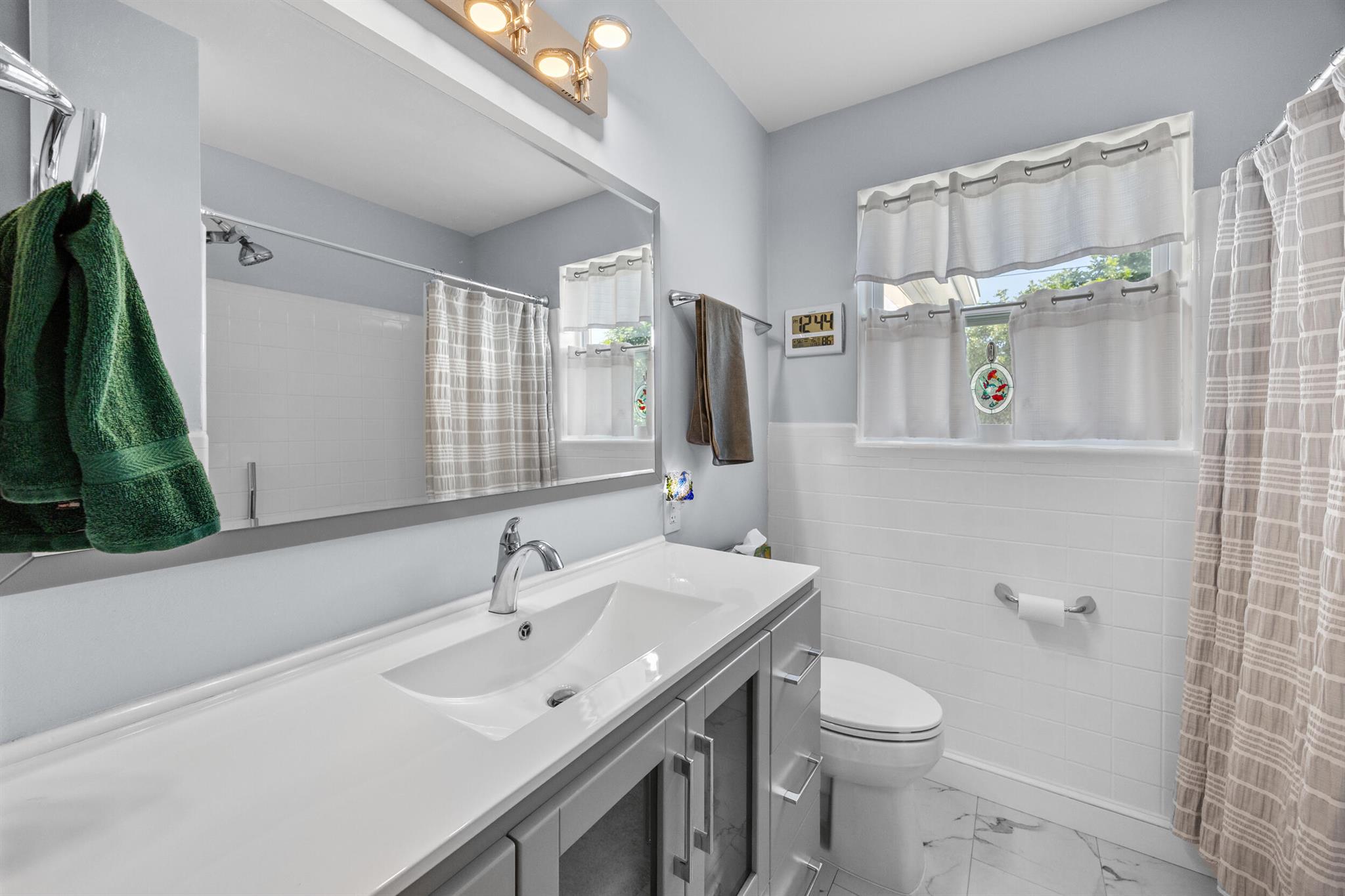 Tequesta Completely Renovated 3-bedroom, 2-bath home, offering a bright split-floor plan and exceptional indoor-outdoor living. The spacious open-concept living area flows seamlessly into the upgraded kitchen, featuring a quartzite island with abundant storage, soft-close cabinetry, a white farm sink, and stainless steel Whirlpool Appliances. A pass-through window connects the kitchen to lanai. You'll love The huge master suite with high end finishes. Everything is color co-ordinated from the luxury vinyl plank flooring throughout, just move right in. Spacious laundry and work area. Don't forget the outdoor shower & 10 x15 Shed Rated for 180MPH Roof & Gutters replaced 2019 Impact windows & doors. Power is underground Back yard is fenced with 50 x 12 Deck. Hurry to see this home.