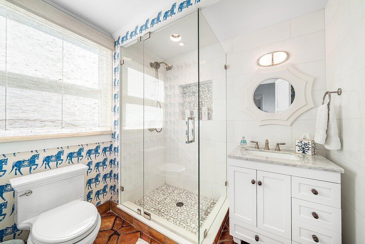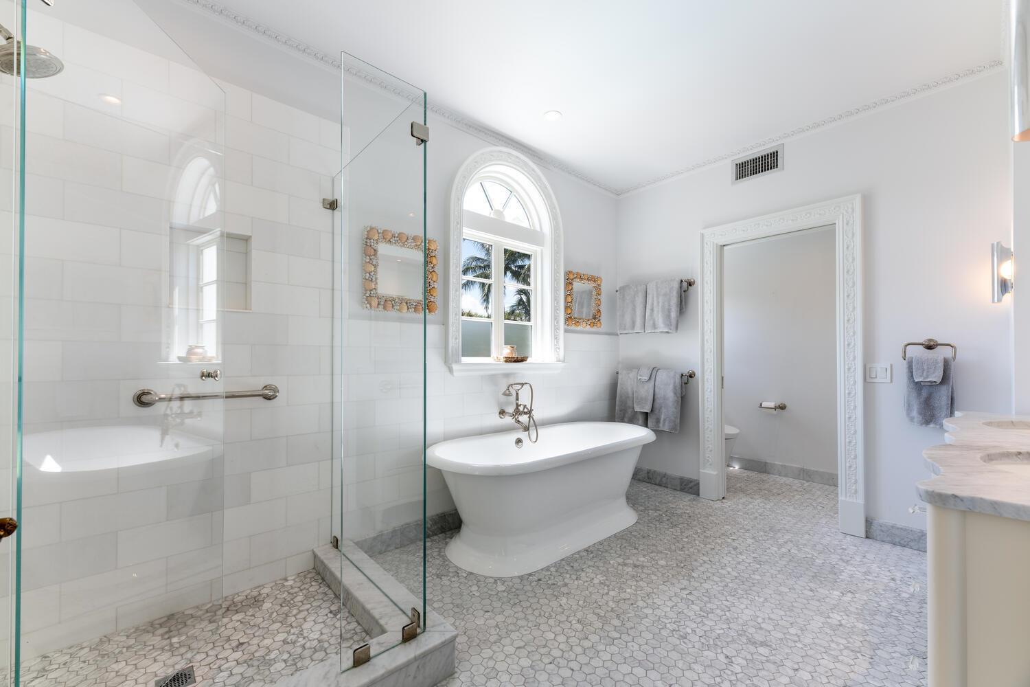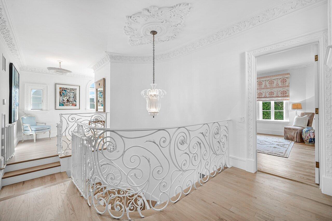 Stunning ocean block estate blending timeless architecture with modern luxury on pristine Brazilian Avenue in the heart of town. Sited on a 12,825 sq ft lot, this renovated Mediterranean Revival estate rises 3 stories and includes a 4-bedroom, 4.5-bath main residence and a beautifully appointed 2-bedroom/2 bath guest house. Filled with natural light and exquisite details, the home features a double living room with fireplace, 10' ceilings, formal dining room, library, and inviting family room. Chef's kitchen with Lacanche range, marble counters, custom island and built ins. French doors throughout lead to a covered coquina stone patio and heated salt water pool. Primary suite with marble fireplace, walk-in closet and elegant bath. 3 additional en-suite bedrooms, light oak wood floors