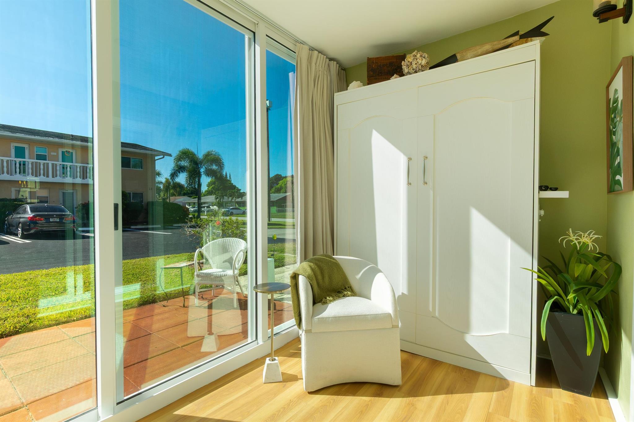 Lovely updated first floor condo with impact glass doors and windows! One bedroom, 1.5 bathrooms plus sunny Florida Room porch with full impact sliders that open up to the rear patio. Murphy Bed makes an inviting place for guests to stay. Laminate and tile floors make it easy to clean. Central Air in unit, combo washer/dryer unit in closet on Porch. Short walk to pool & amenities. Village Royale is a popular 55+ community that is only 3.5 miles to the Public Beach. Tri-Rail passenger train is .9 mi away and lots of restaurants and shopping opportunities are within 1 mile of the condo. Easy access to I-95 for commuters. Showings start Sunday 11/23.