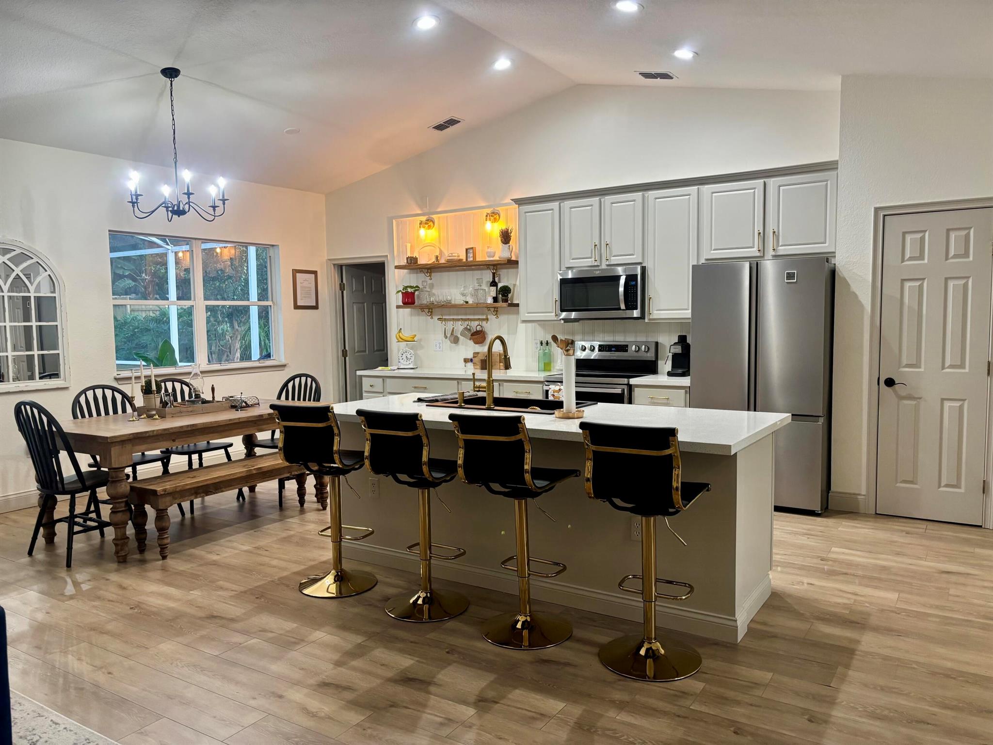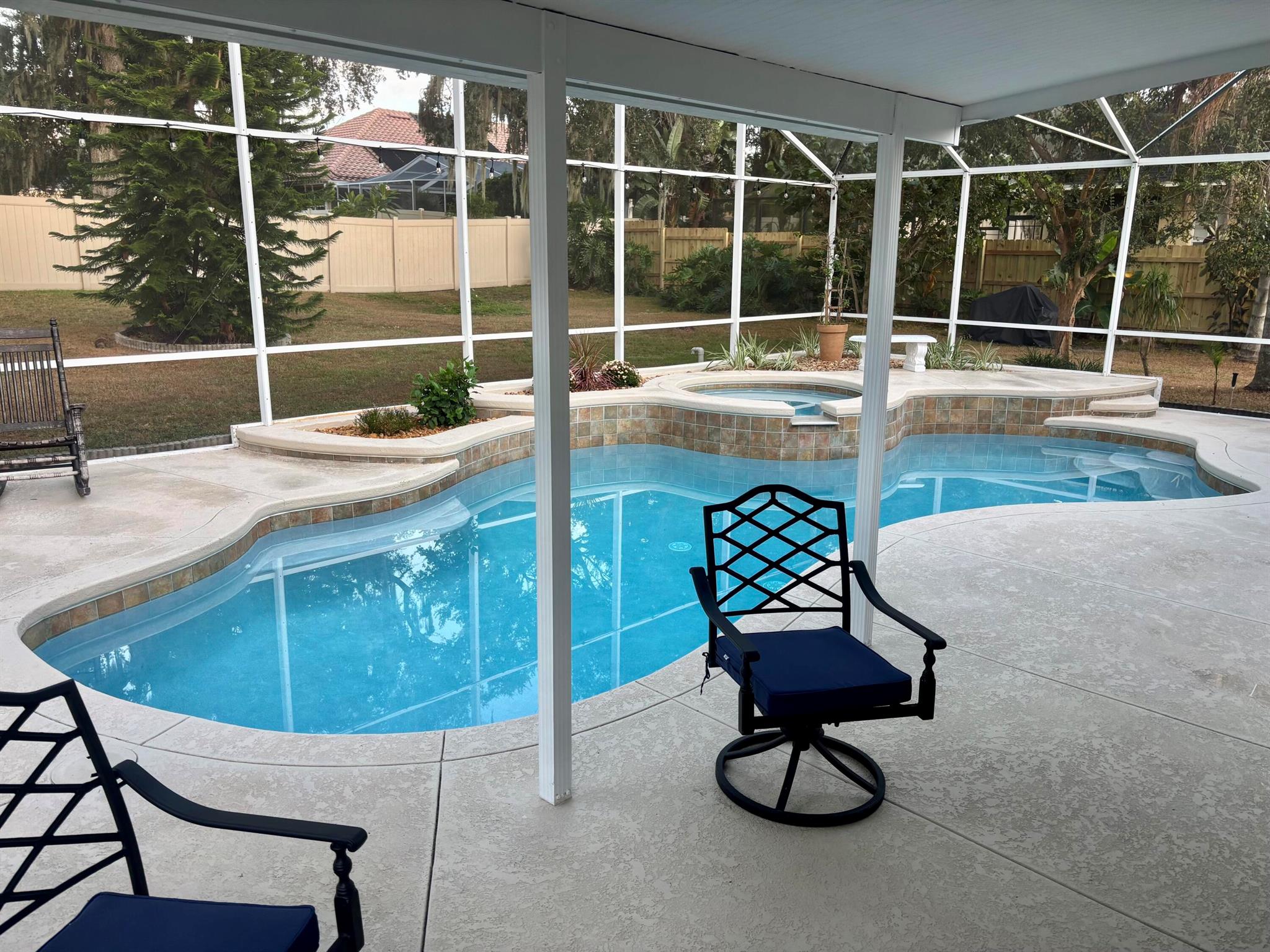 Magnificent fully remodeled 3/2 POOL home in the highly sought after Christina Estates neighborhood. Home boasts vaulted ceilings with brand new flooring throughout. Ample space in both living and family room. Updated kitchen with quartz countertops, new bottom cabinets, new appliances, and coffee/bar area. Both bathrooms have been remodeled. Enjoy outdoors all year long with your heated pool + jacuzzi. Pool was resurfaced and screen enclosure was rescreened in 2025. Large fenced in backyard for privacy. Big ticket items: Roof 2019, HVAC 2016, Water Heater 2020.