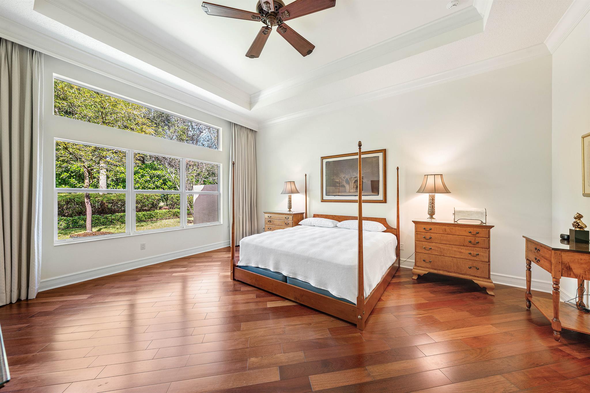 Lushly landscaped home on private lot. Features include impact windows, Generac generator, Vortex home surge protector, new A/C, electric vehicle outlet in garage, double glass entry doors, wood floors throughout, transom windows, solid core doors w/applied moldings, Saturnia window sills, crown moldings, designer window treatments & light fixtures, upgraded baths & more! Gourmet kitchen has wood cabinets, granite countertops w/full height backsplash, stainless steel appliances (including hood & Subzero), built-in pantry cabs, snack bar, breakfast area & door to patio. Great room w/surround sound. Luxurious master suite. Huge ensuite guest room (with carpet) could be second master suite. There is a den/3rd bedroom & guest bath. Rear yard with covered, screened porch and lush landscaping.