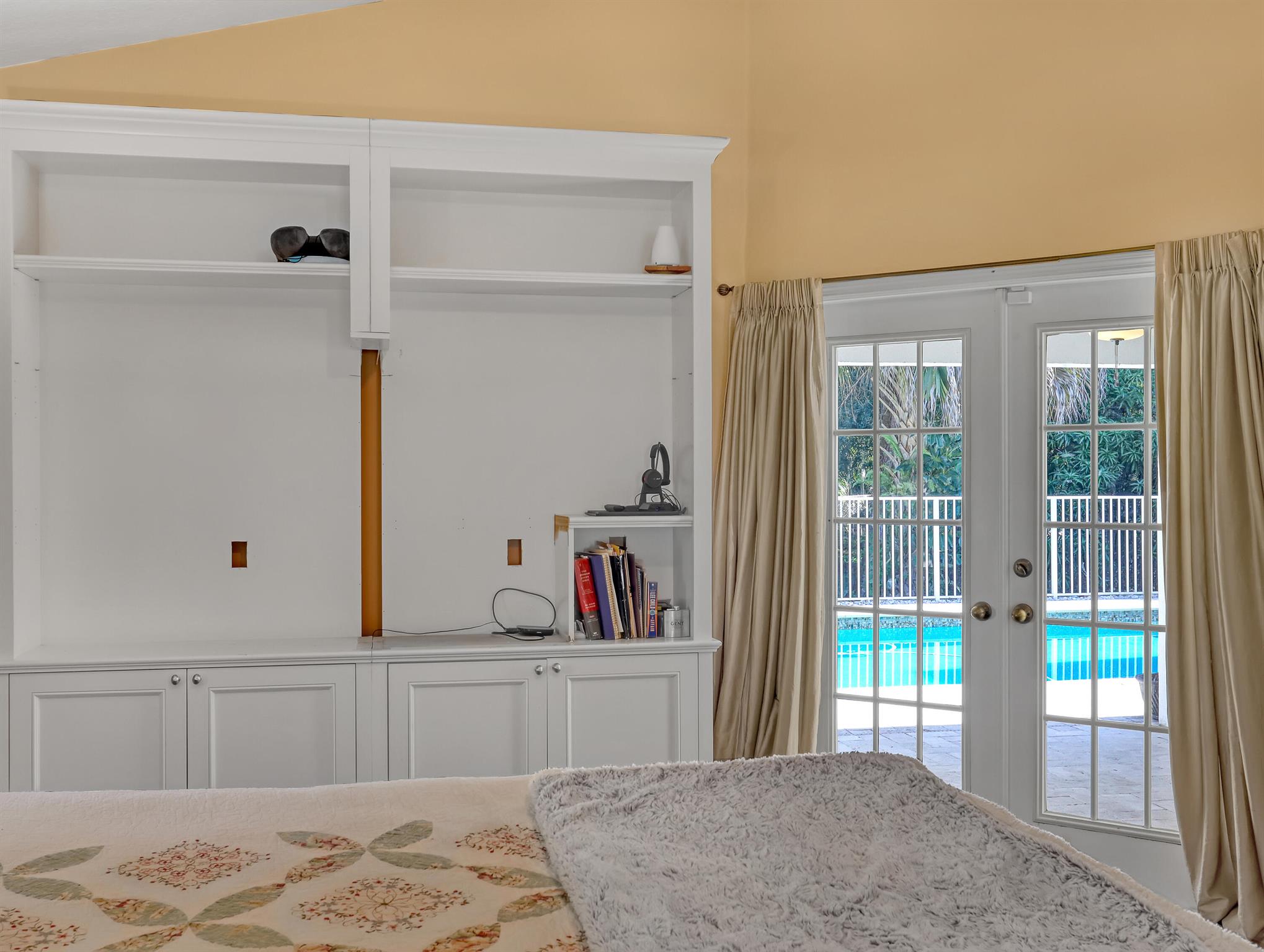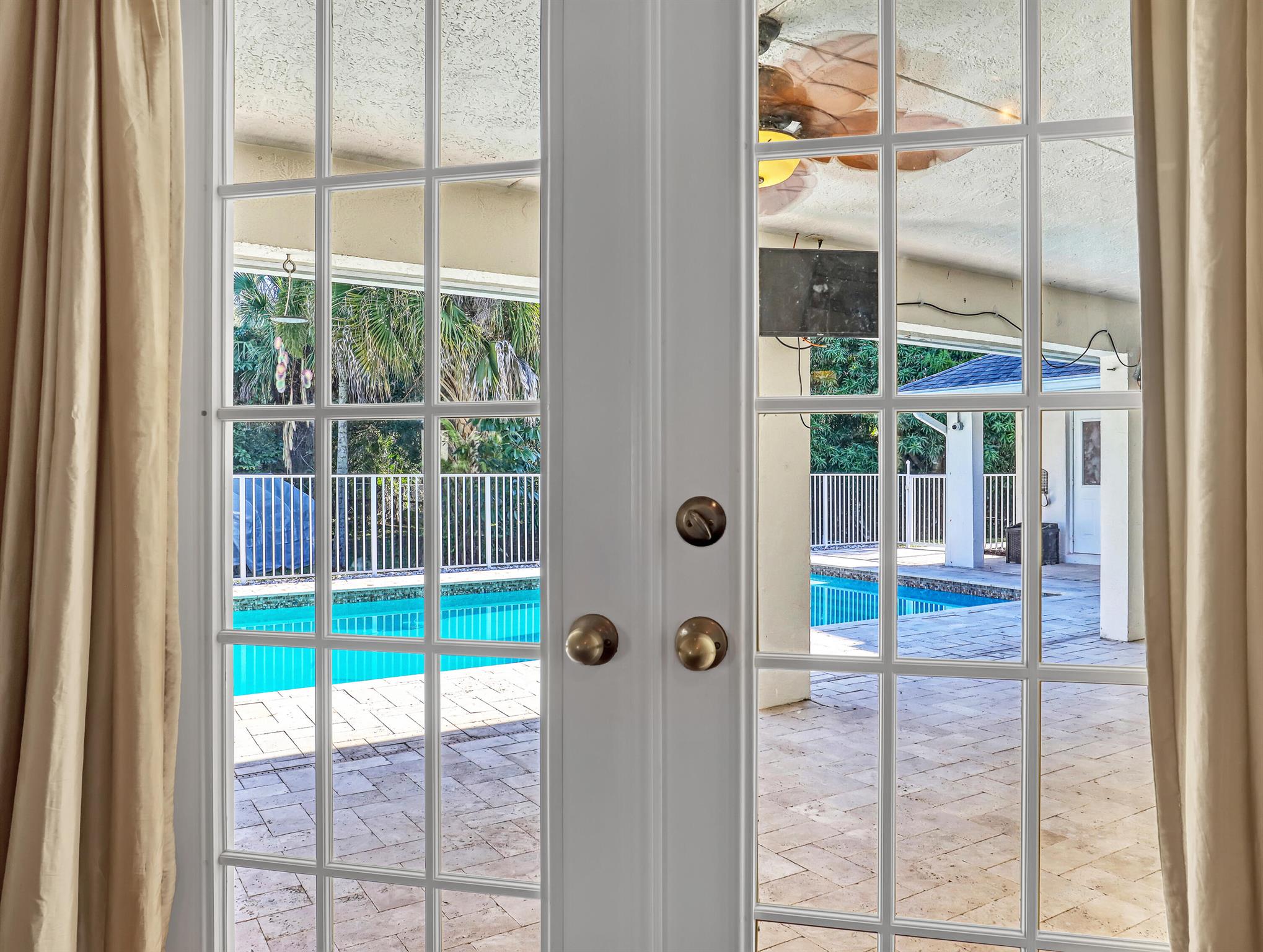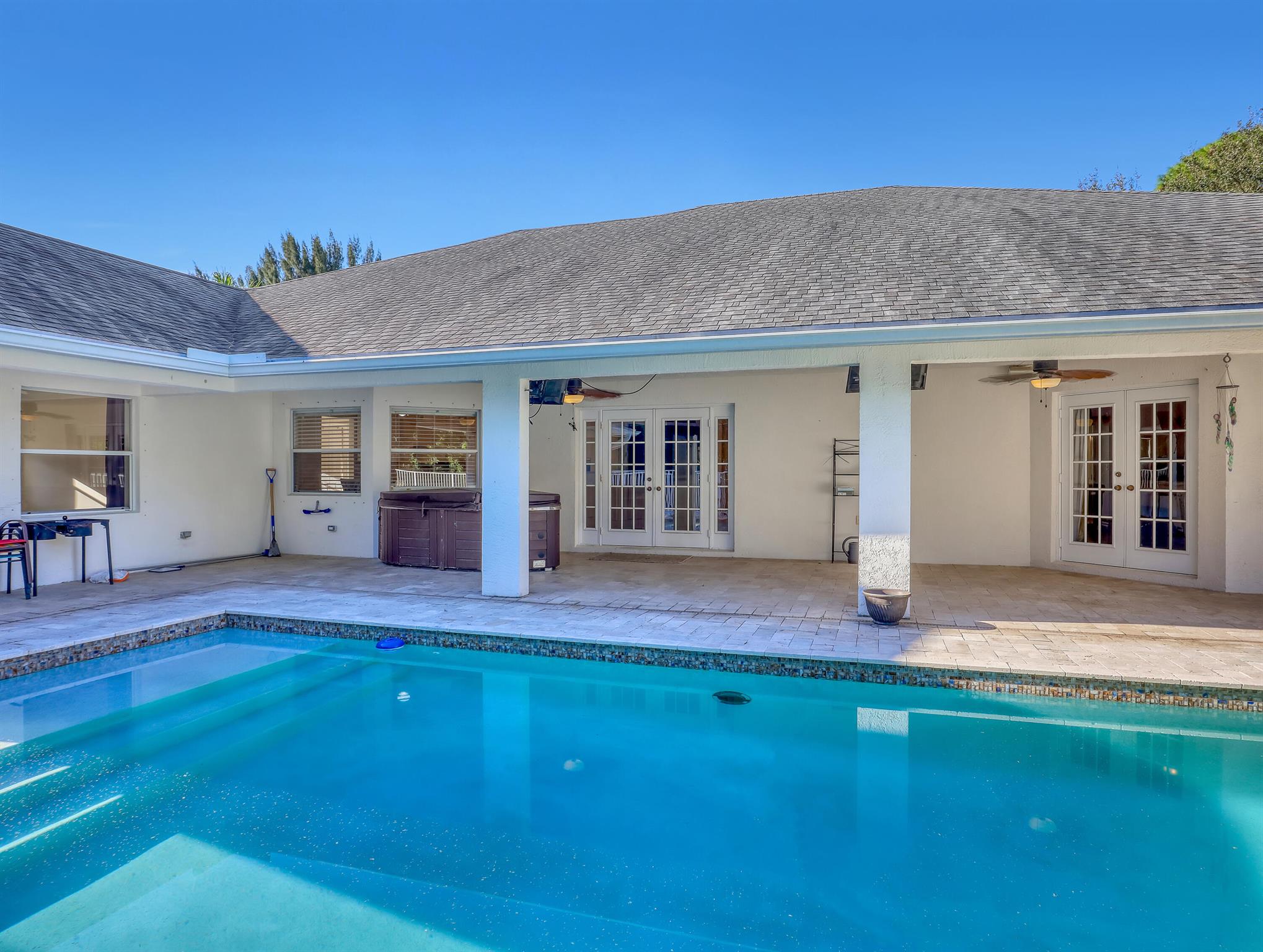 Welcome Home... to your 4 bdrm, 3 bath, 3 car garage, pool home PLUS 1,050 sq ft annex bldg (w/ 3 bay doors, fully insulated, electric & a/c) on almost 1.5 acres. Corner lot w/ fully fenced yard w/ entry gates, heated pool, cov'd patio and trees that provide privacy. With NO HOA this is a great property for anything your heart desires! The custom built home includes updated kitchen, French doors, TV w/ Sound Bar, new driveway, roof 2021, a/c & water heater 2023, pool & annex bldg. 2016. Private secondary bedroom with its own bathroom adds flexibility, while two additional bedrooms provide privacy for everyone. It also includes hot tub, cabinets in garage, beautiful tile floors throughout. This home is waiting for your touches to make it your own. *Corner lot has paved road (on one side)