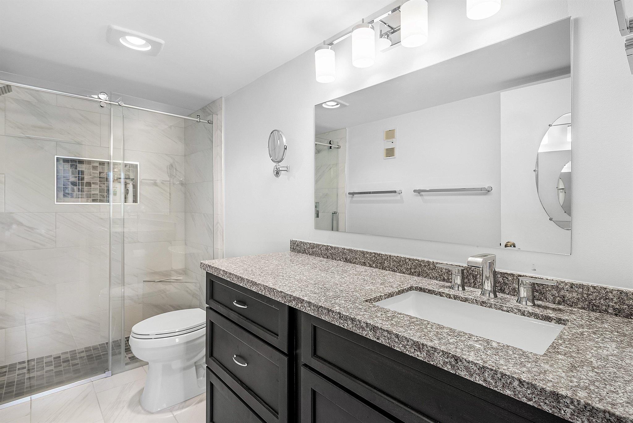 Unique opportunity to own a FIRST FLOOR REMODELED, 3/2 CORNER UNIT in desirable 55+ Palm Chase Lakes. Steps to amenities and a SHORT walk to worship makes this the best on the market! Newly remodeled and ready for you to just enjoy. Light, bright and open is what you immediately feel with the floor-to-ceiling glass and premium LAKE VIEW. Windows on 3 sides add to the spacious feeling. NEW Kitchen is re-designed with modern luxury & convenience in mind. Custom solid wood cabinetry, double pantry, subway tile backsplash and quartz counter tops make a statement. NEW appliances. Tile & LVP flooring throughout - no carpet! Great room is open to the kitchen and dining area allowing perfect entertaining flow. Enjoy additional flexible space on the large lanai w/ glass/screen doors.