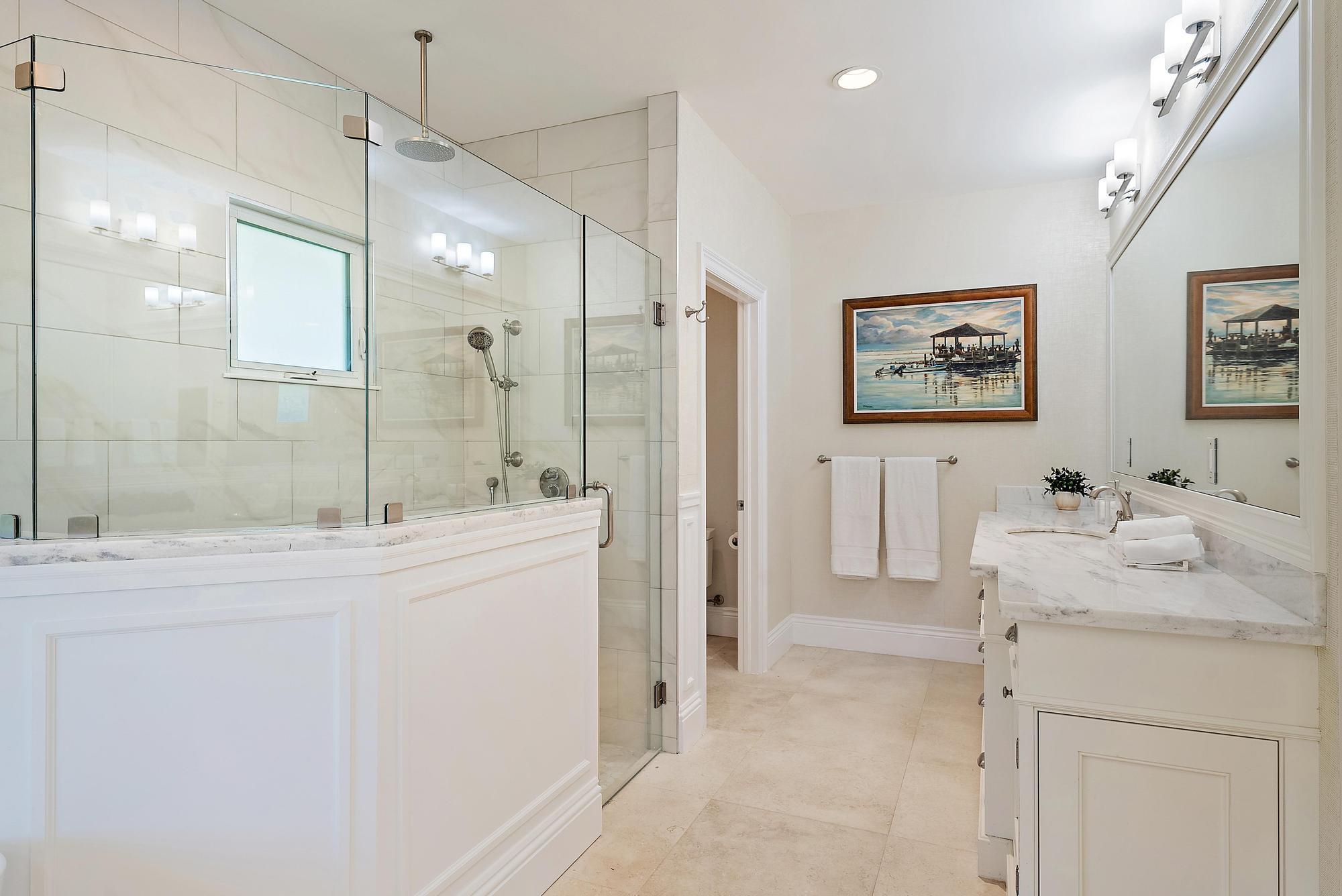 Stunning Harbour Village custom home with panoramic lake and golf course views. Ongoing updates, including whole house interior paint, fresh landscaping, new lighting, hurricane-code impact windows and sliders, reimagined spa-like primary bathroom, and a whole-house generator with 1,000-gallon propane tank. Main home features an open floor plan with 2 bedrooms, including a spacious primary suite, guest bedroom with en suite bath, and office/5th bedroom. The kitchen boasts stainless steel appliances, granite countertops, gas range, double ovens, and new stacked tile backsplash. A private 2BR/2BA guest house sits beside the pool. Additional highlights include Phantom screens, SWATT bug system, and a 3+ car garage with golf cart space. Turnkey elegance with unparalleled country club living.