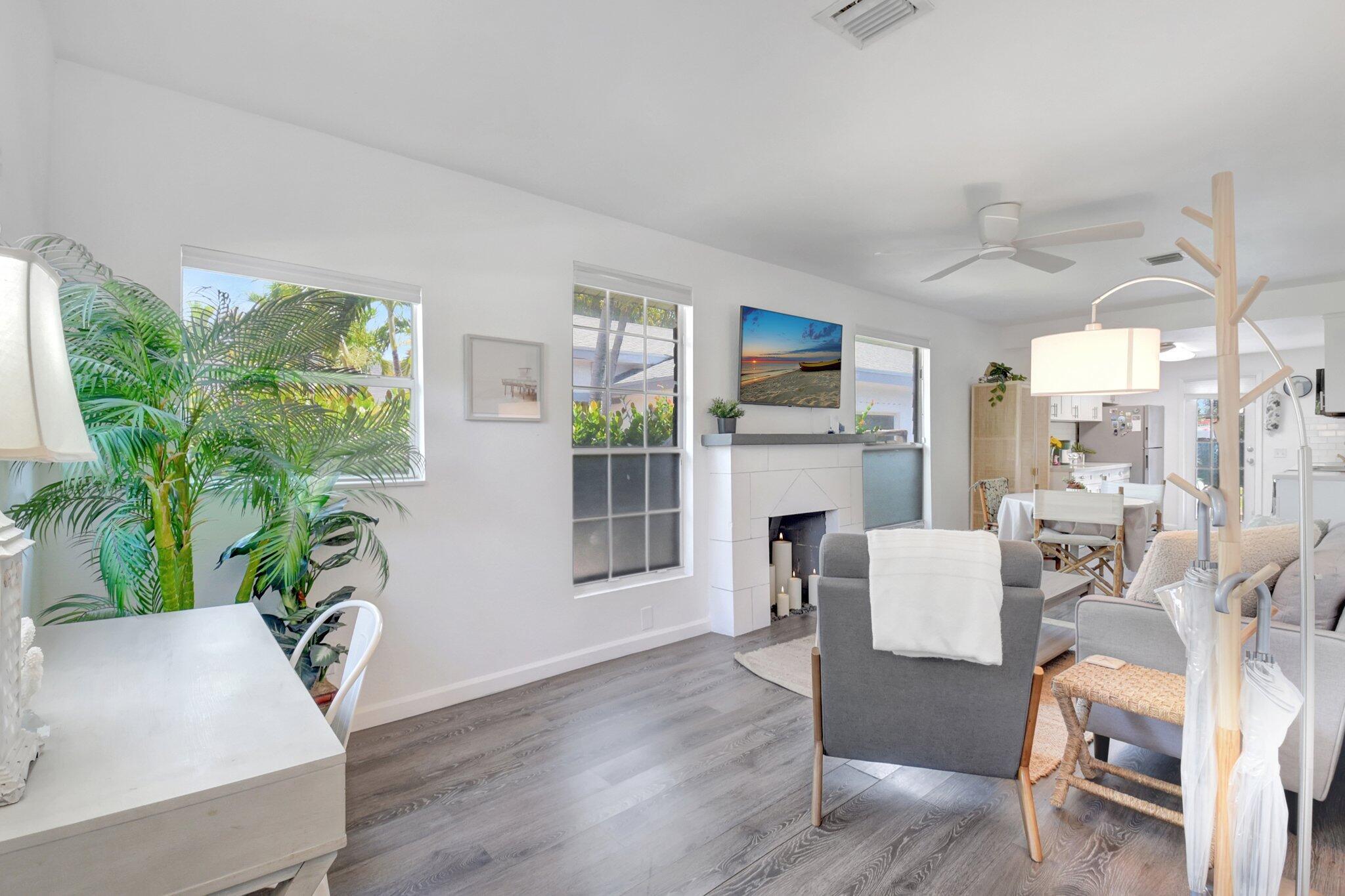 Charming coastal-style 2BR/1BA cottage in the heart of Lake Worth Beach. This beautifully updated home features bright open living spaces, a modern kitchen, updated flooring, and a cozy decorative fireplace. Lush landscaping, a mango tree, and a private fenced yard create a serene outdoor retreat. Just minutes from downtown, beaches, dining, and shops. Move-in ready and perfect as a primary home, vacation getaway, or investment property. Home can be sold fully-furnished.