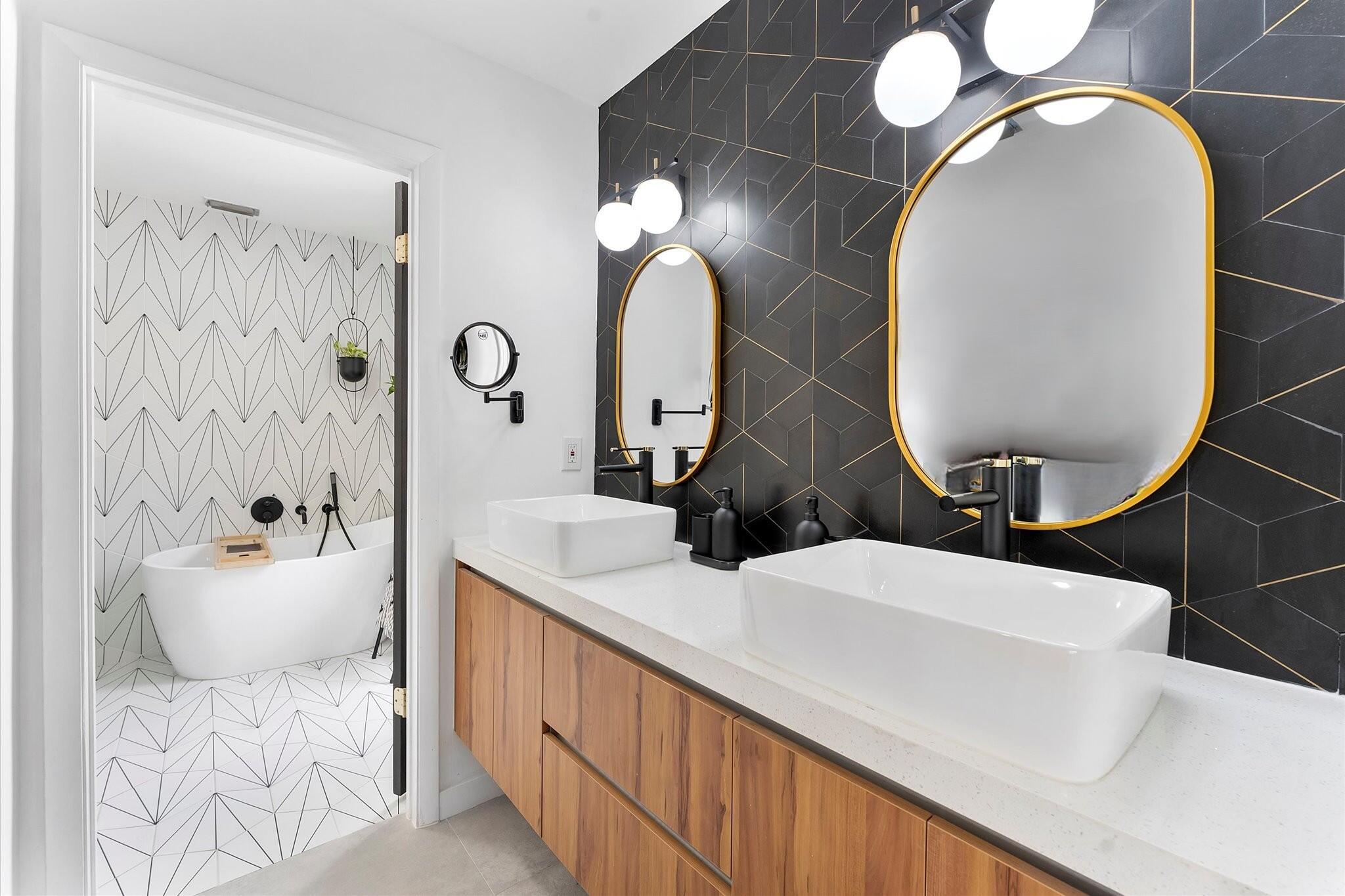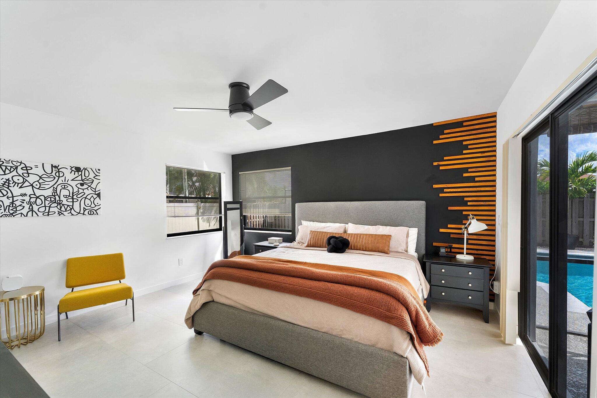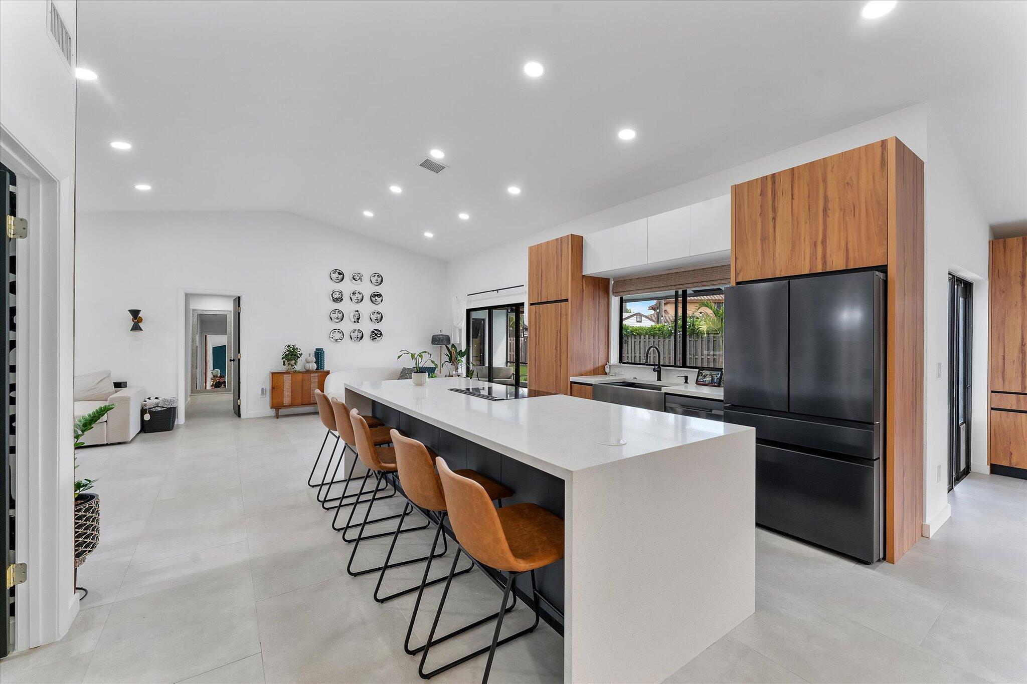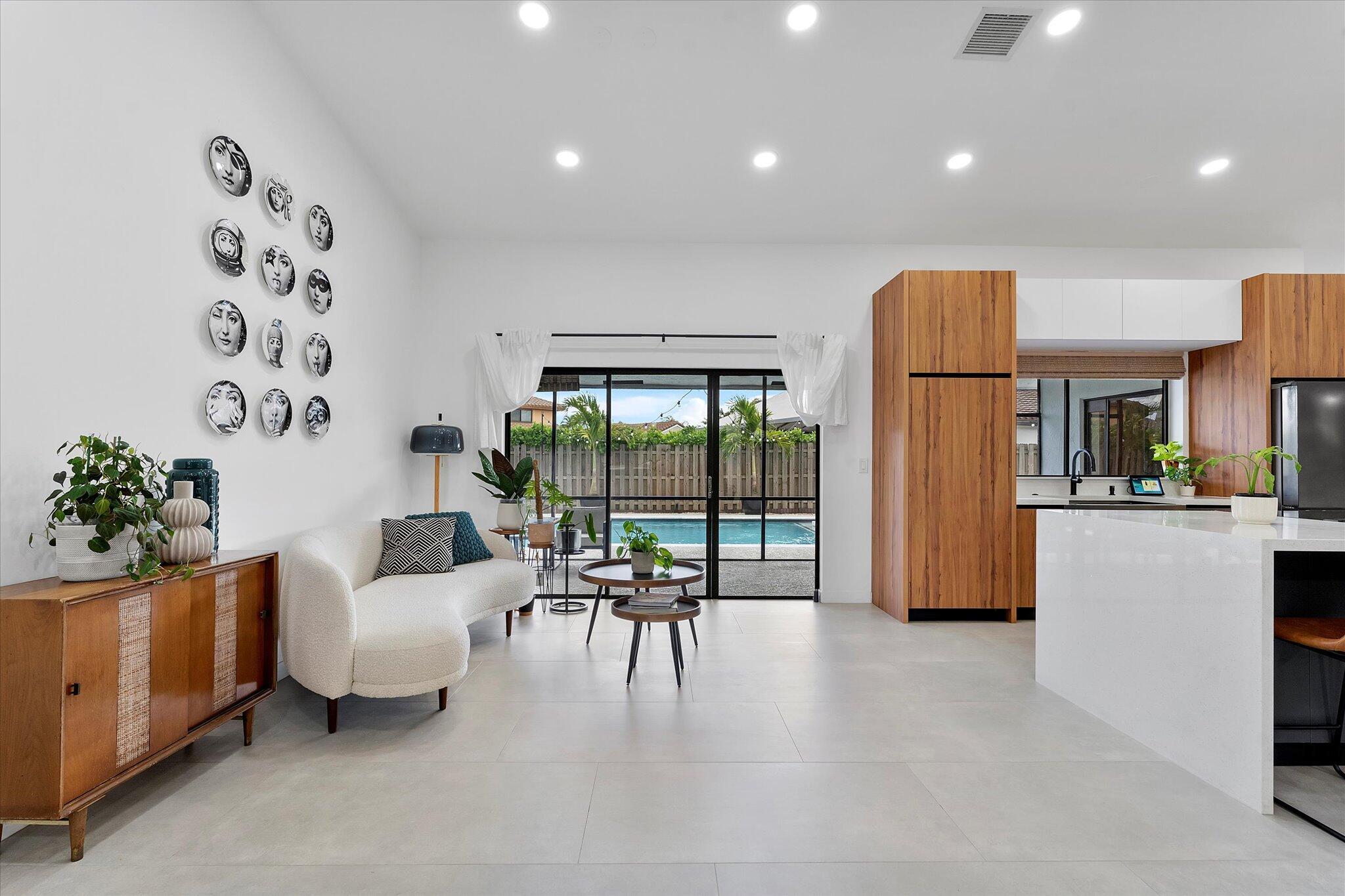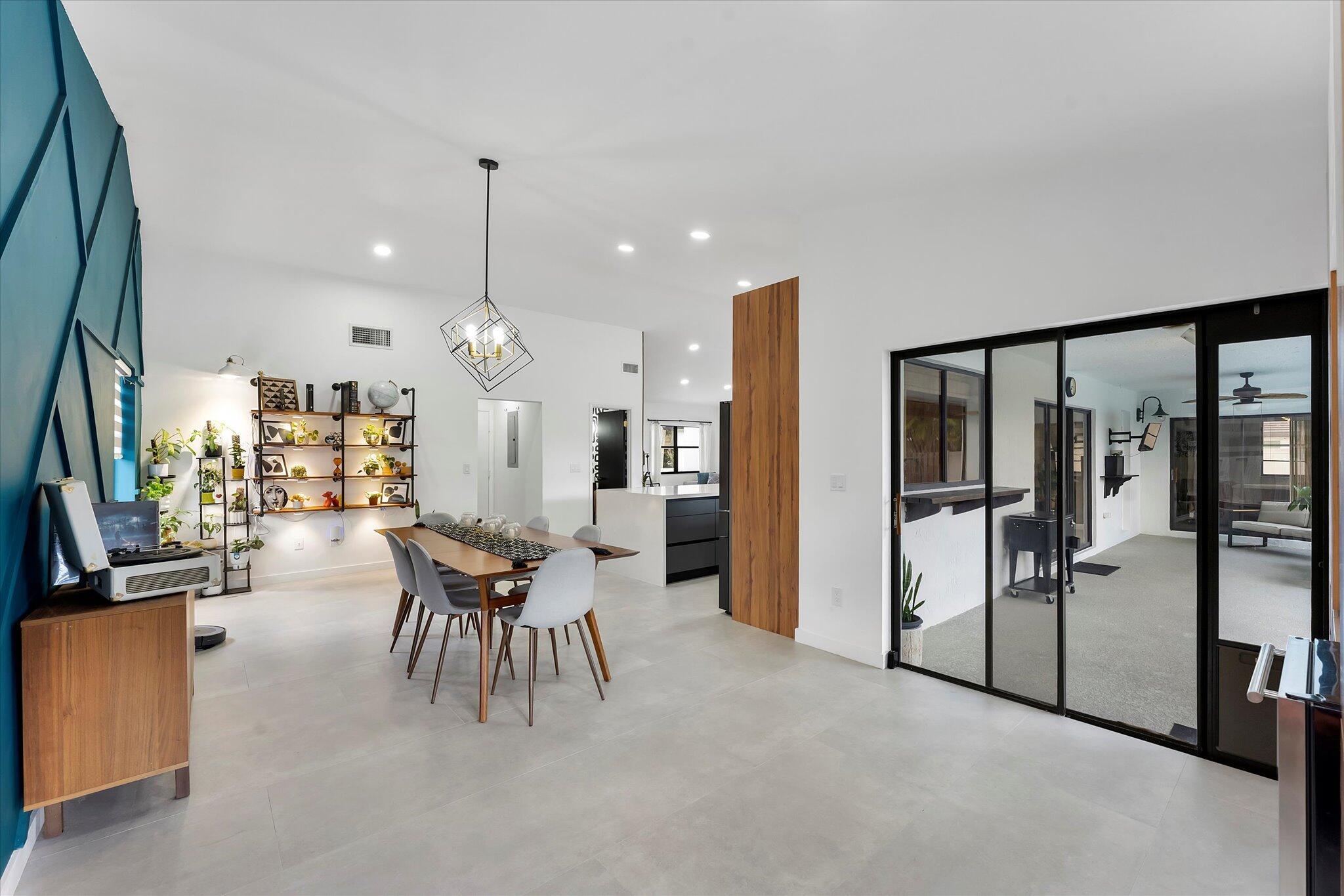 Modern and beautifully updated, this home features an open floor plan with tile flooring throughout, a spacious dining room with a custom accent wall, built-ins, and a wine cooler. The renovated chef's kitchen impresses with a large cooking island, farm sink, waterfall quartz countertops, and generous seating space. The adjoining living and family rooms flow effortlessly together, offering exceptional areas for both entertaining and relaxing. Vaulted ceilings and thoughtfully designed accent walls enhance the home's airy, contemporary feel. Expansive windows showcase the private backyard oasis, complete with a resurfaced (2023) and remodeled pool featuring a relaxing sundeck,
