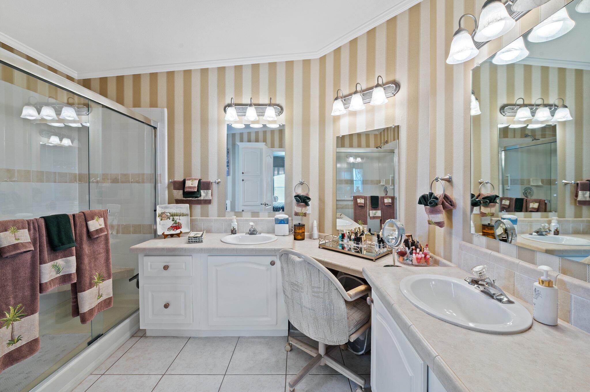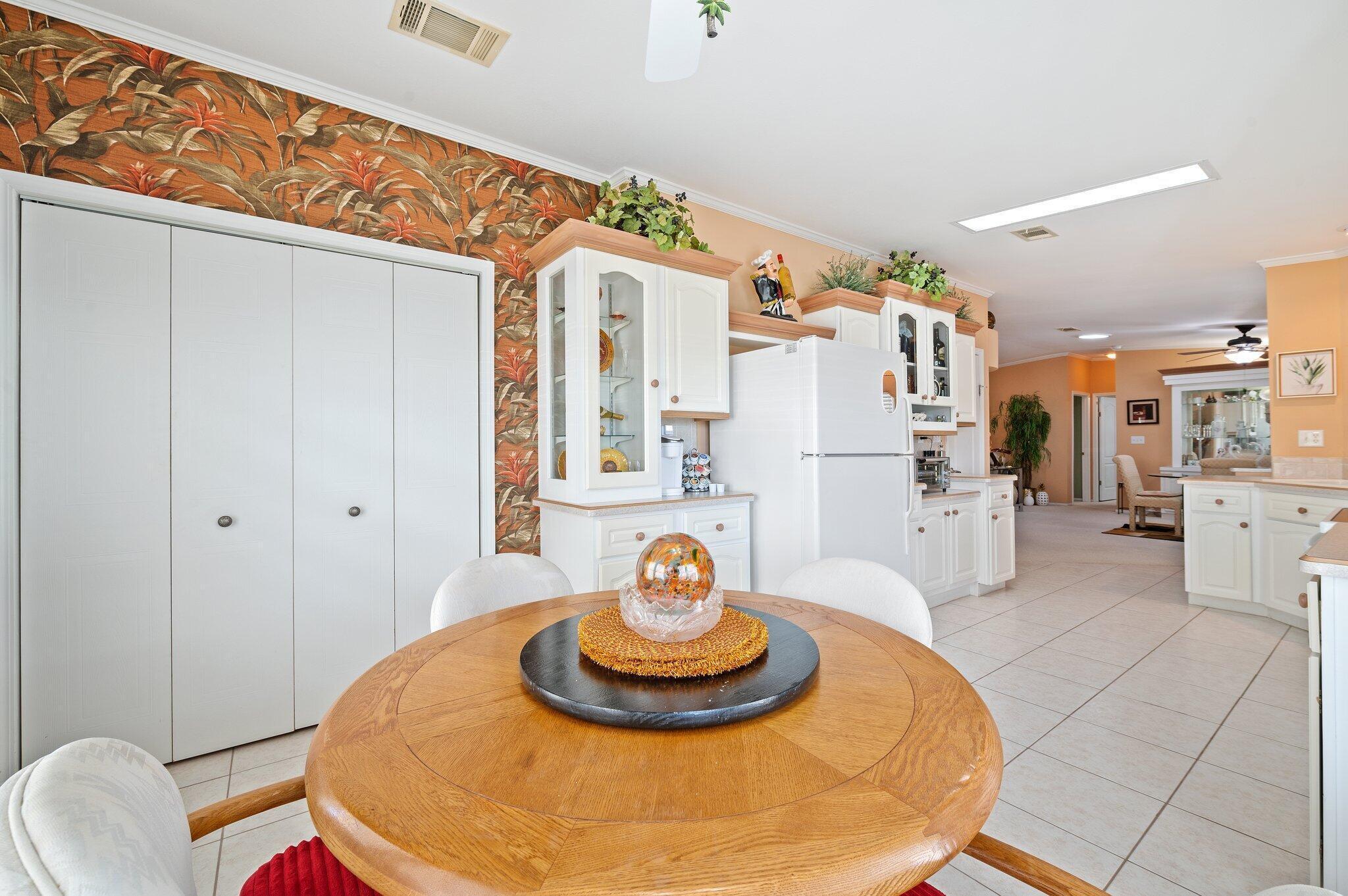 Charming Home in Prime Cul-de-Sac Location. Home is ideally situated at the end of a quiet cul-de-sac. Built with quality drywall construction and featuring elegant crown molding, it offers a spacious, raised enclosed patio with wall-to-wall windows. A top of the line Palm Harbor Home. Recent updates include a newer A/C unit, water heater, new stainless steel dishwasher, kitchen faucet, and dryer. The thoughtfully designed split floor plan features generously sized bedrooms throughout. The kitchen boasts white cabinetry, ample counter space, a large walk-in pantry with floor-to-ceiling shelving, and a cozy eat-in area. Adjacent to the kitchen is indoor laundry equipped with abundant shelving. The formal dining room includes a built-in buffet. The living room features vaulted ceilings