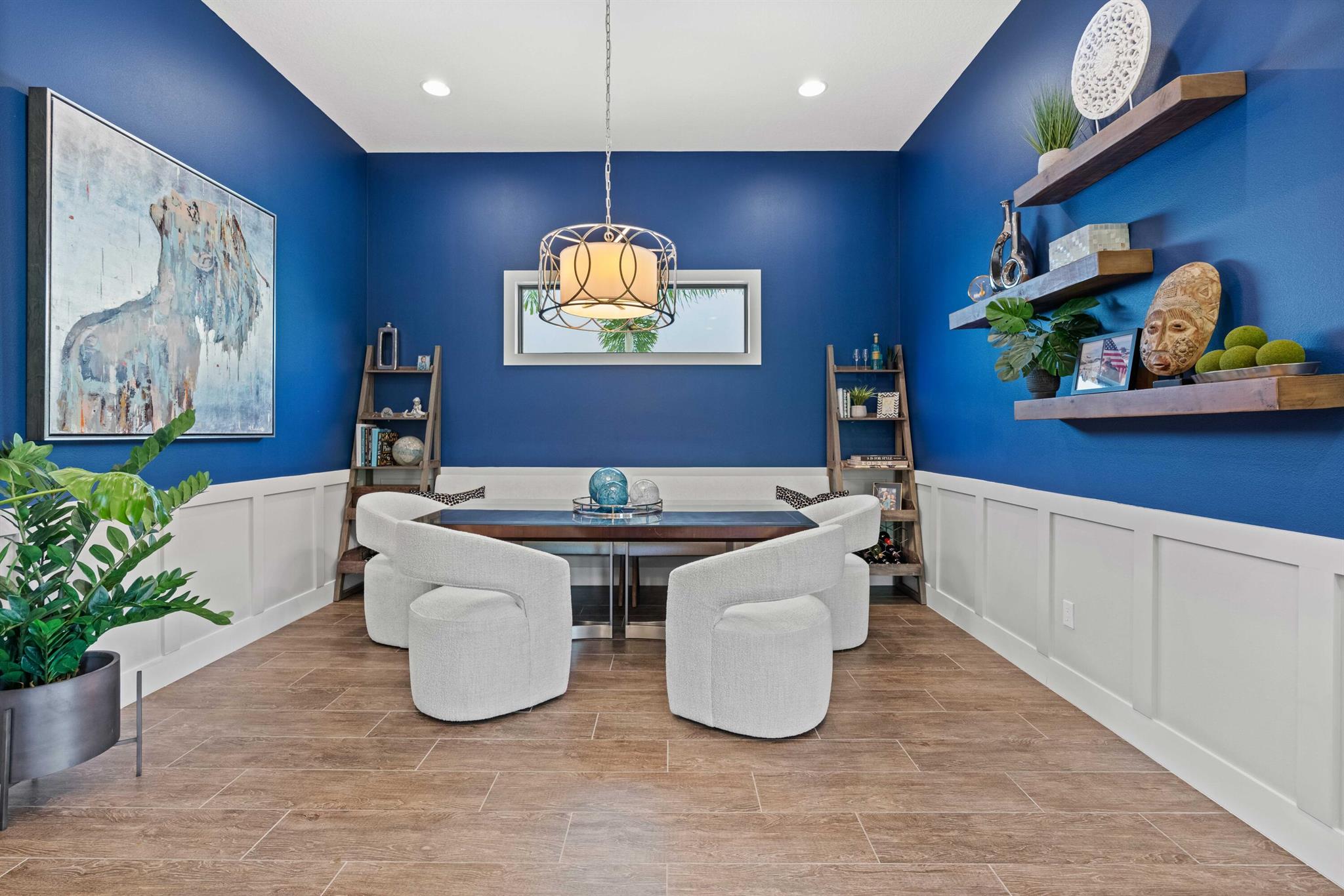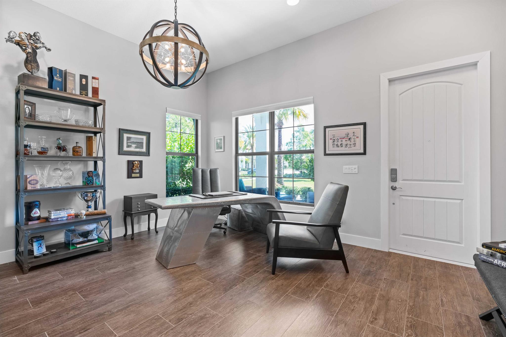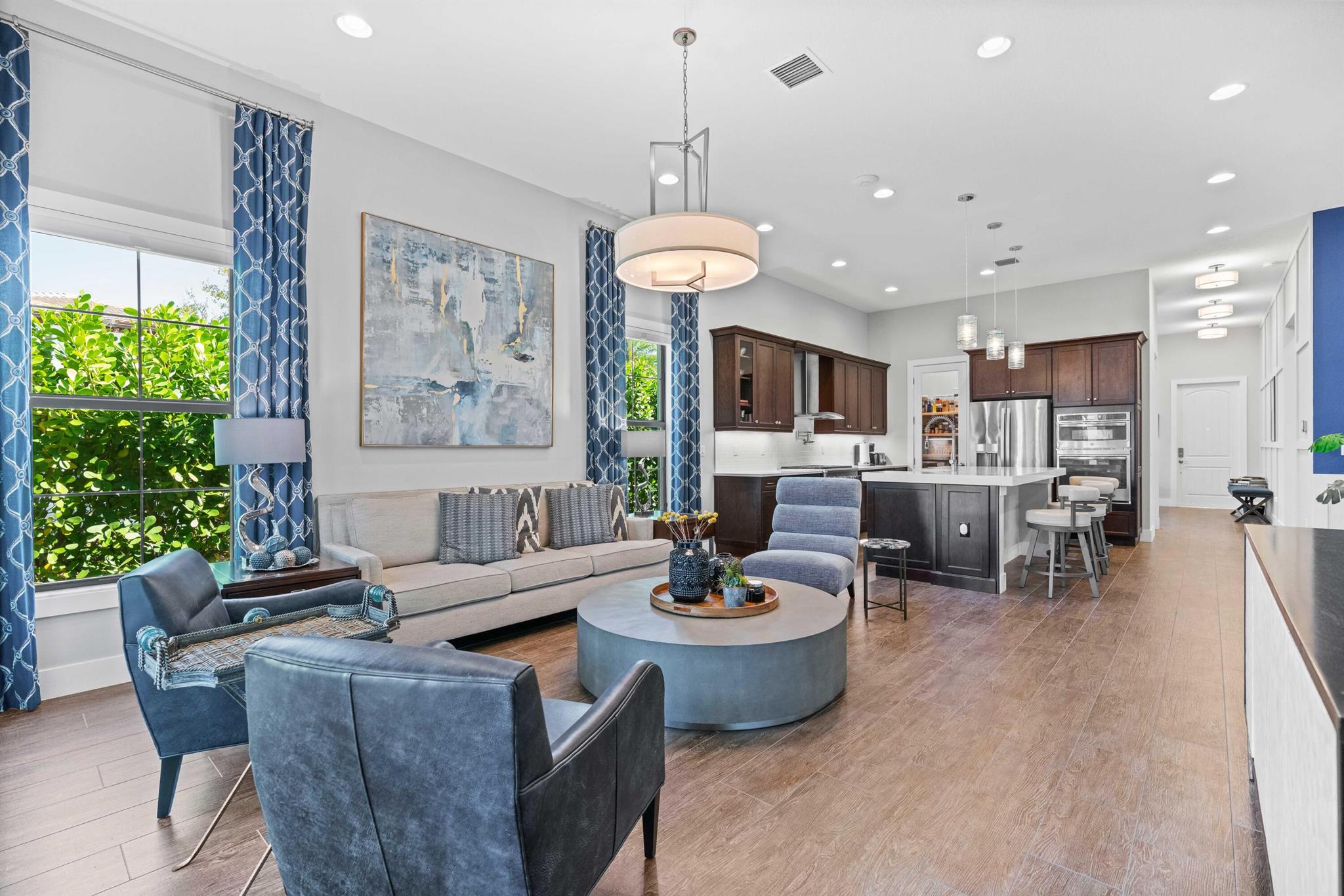 This rarely available open-floor-plan showstopper with three bedrooms and an office is situated on the green, on a wide corner lot close to the clubhouse! With expansive green space in front and private rear lanai finished with privacy hedges, travertine tile, astroturf, and cabana bath, this sunlight-filled home shows like a model with countless upgrades, including: Impact glass, porcelain wood plank tile floors, wainscoting, custom woodwork, contemporary light fixtures and custom window treatments. Chef's dream kitchen equipped with walk-in pantry, 3''Quartz island breakfast bar with farmhouse sink, GE Monogram appliances, gas range and pot filler. The master bedroom has a luxurious ensuite bath with a huge walk-in shower and 2 walk-in closets. Guest bedroom ...see more
