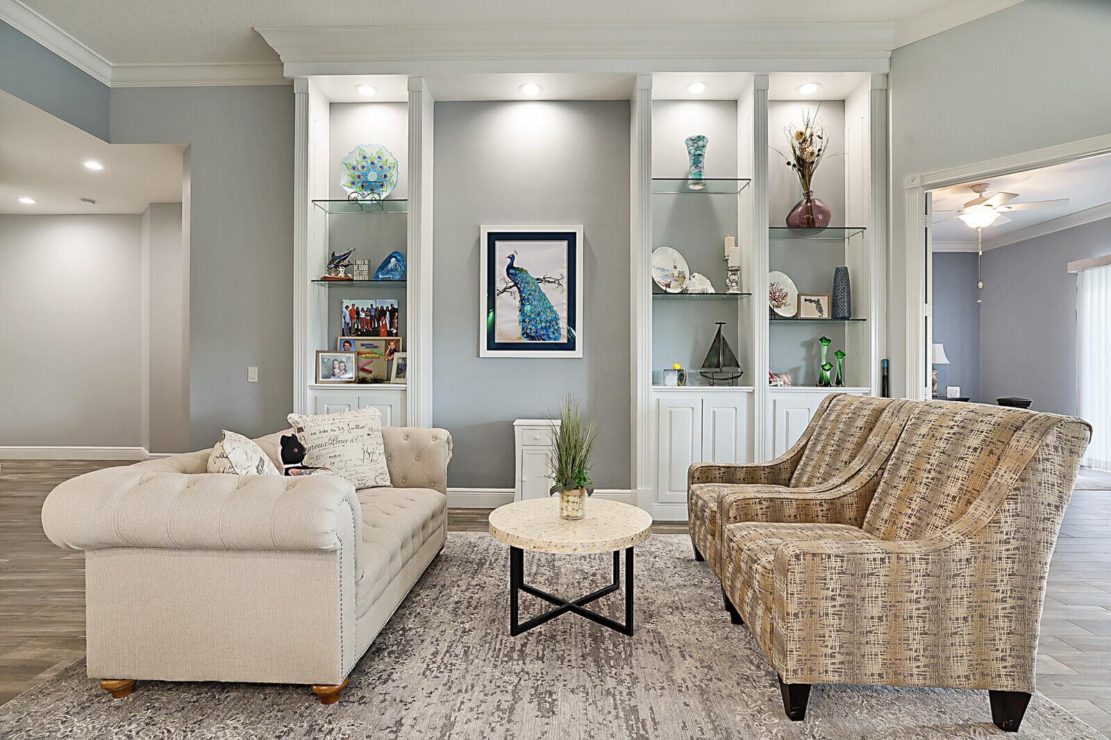 Welcome to this exceptional 3-bedroom plus den, 2-bathroom, single-family pool home in the prestigious Isles at Palm Beach Gardens. Built by Divosta in 2002, this Oakmont model sits on a corner lot and offers direct lake views and high-end upgrades throughout. The spacious open concept great room features soaring 12-foot ceilings, custom built-ins, elegant wood-look tile and crown molding. The chef's kitchen is beautifully designed with white cabinets and granite countertop. The spa-like master bathroom includes dual solid wood vanities, a tiled walk-in shower with upgraded hardware, and a separate soaking tub. Both secondary bedrooms are generously sized and have upgraded fixtures. The versatile den/office boasts is an ideal workspace.
