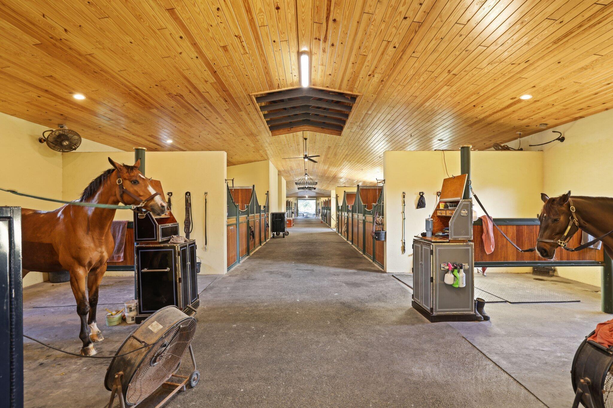 Set on 10 pristine acres, this professionally designed, championship-caliber equestrian estate delivers an exceptional blend of luxury, functionality, and top-tier performance. Purpose-built for serious equestrians, the property features a meticulously planned 30-stall barn, with each 12' x 12' stall outfitted with fans, windows, automatic water, spigots, hurricane shutters, and an integrated fly spray system--ensuring optimal comfort, safety, and efficiency year-round. The barn is thoughtfully designed with a stunning center aisle finished in Equitan rubber flooring and offers outstanding amenities, including two full bathrooms with showers, ten dedicated tack-up areas, three separate tack rooms, and three feed rooms equipped with washers and dryers.