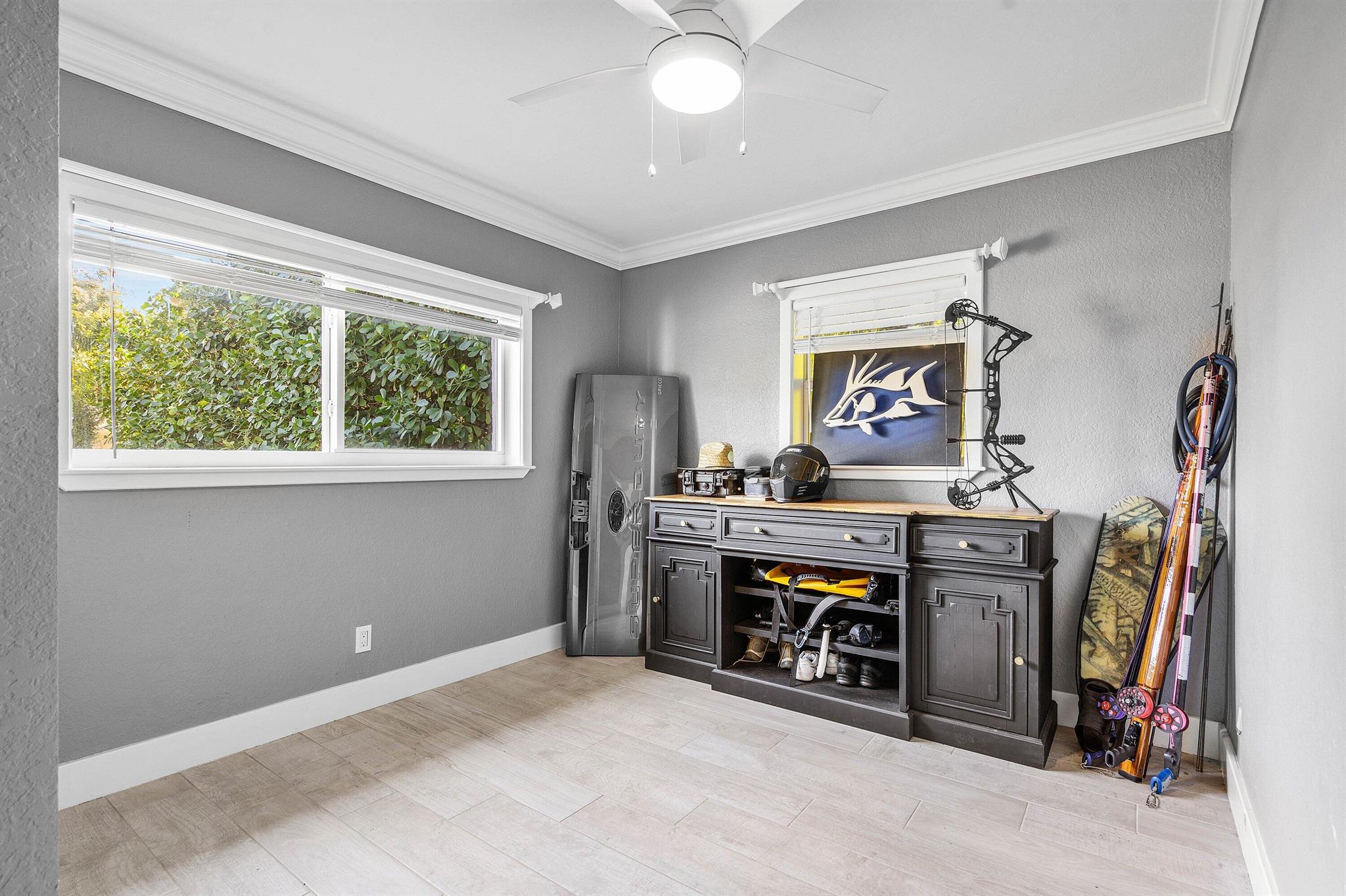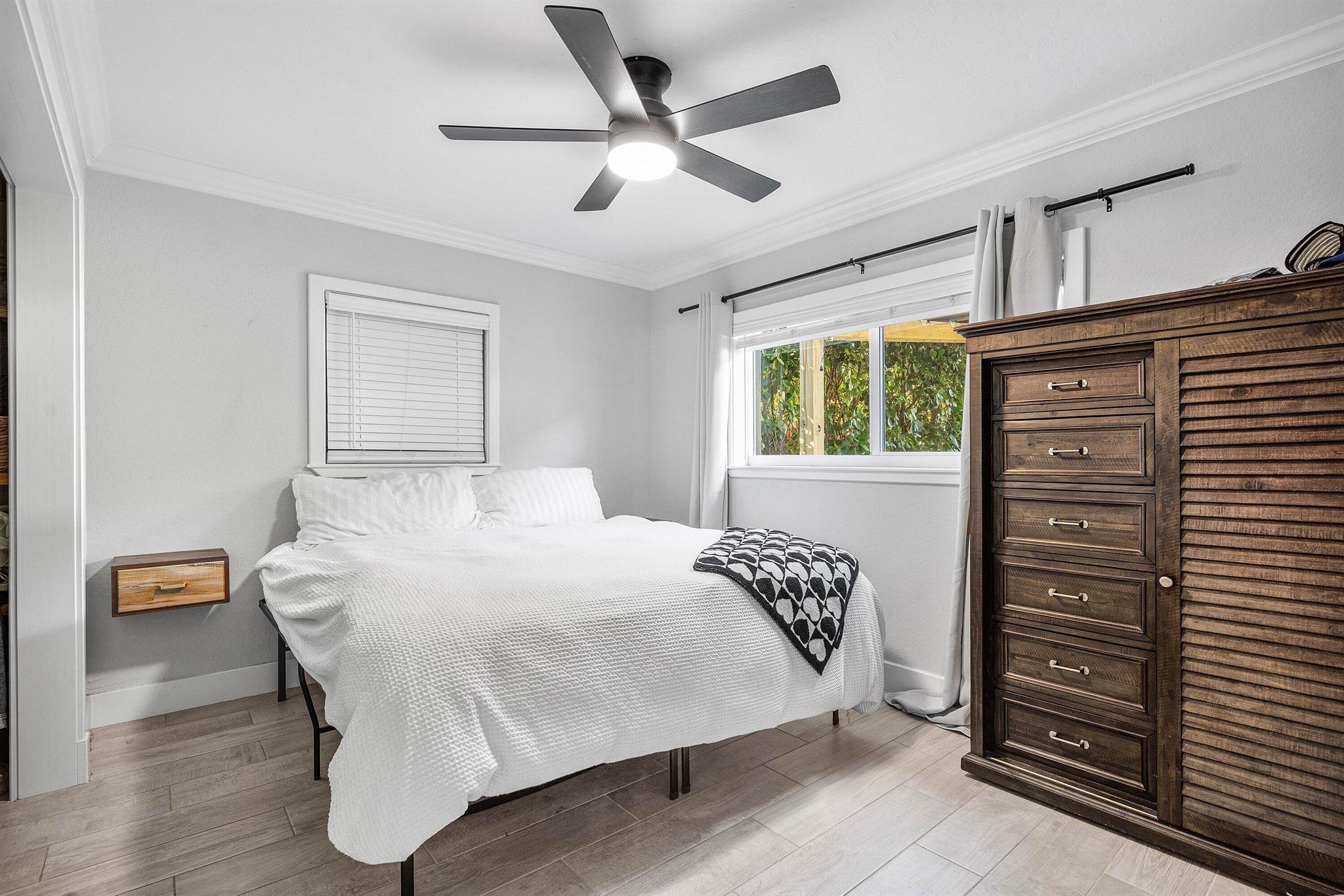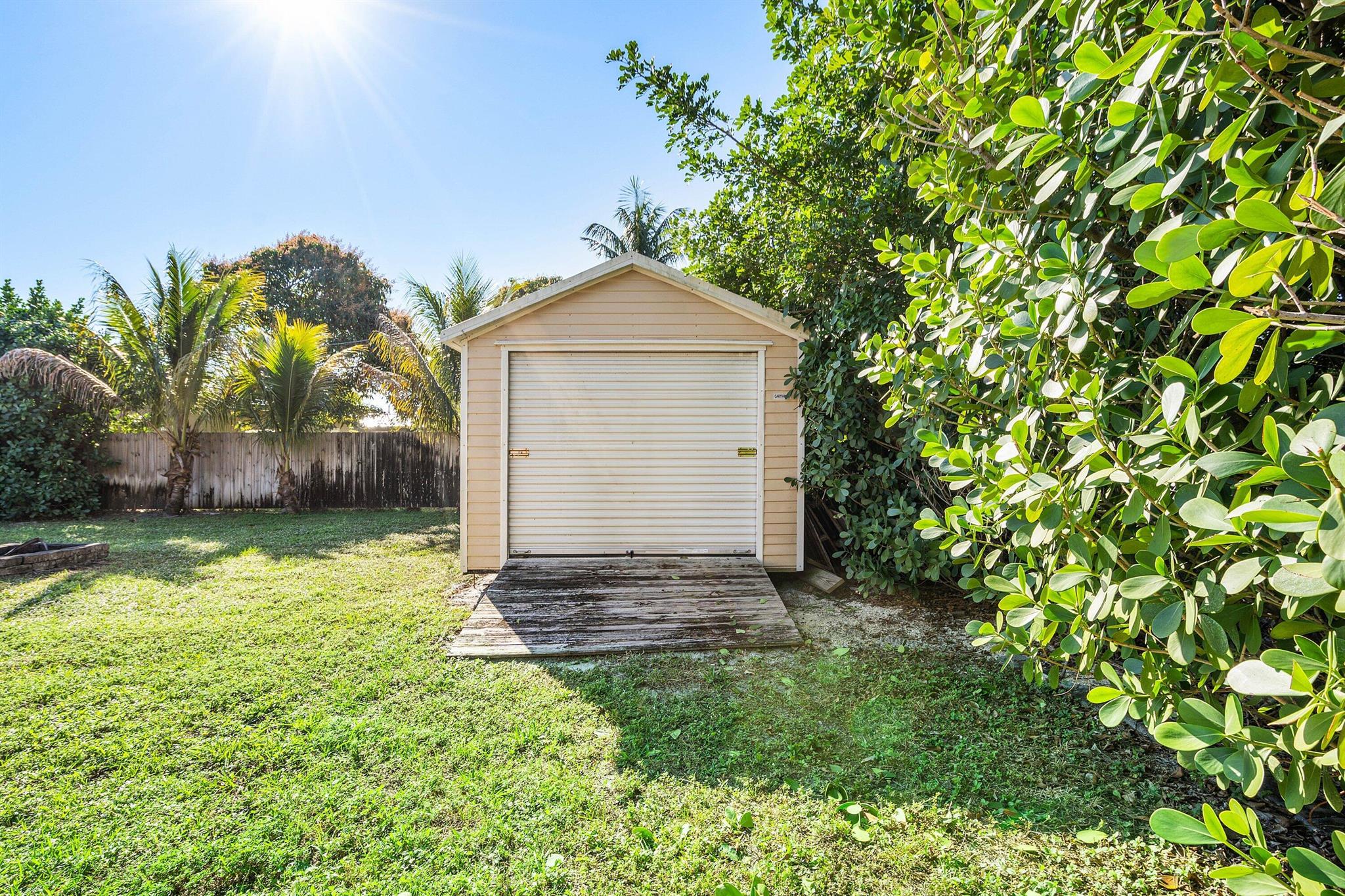 Stop your search! Beautiful 2BR/2BA CBS home with a one-car garage and no HOA. Features crown molding and tile throughout. Impact windows and doors, 2018 roof and 2020 A/C offer peace of mind. Features include a shiplap accent wall with TV included, Stacked-bedroom layout, and a kitchen with quartz countertops. Enjoy a private fenced backyard, large shed, and covered outdoor bar--perfect for entertaining. Plenty of room for boat/RV Parking. Close to the highway and beaches!